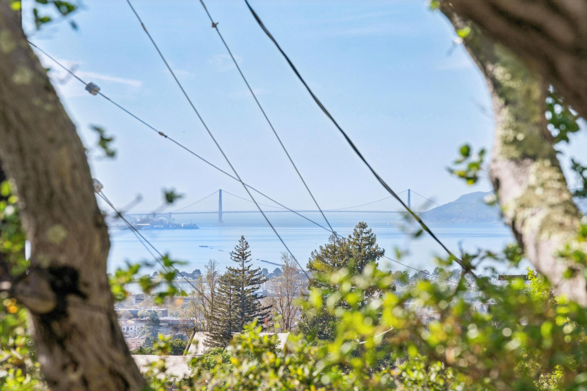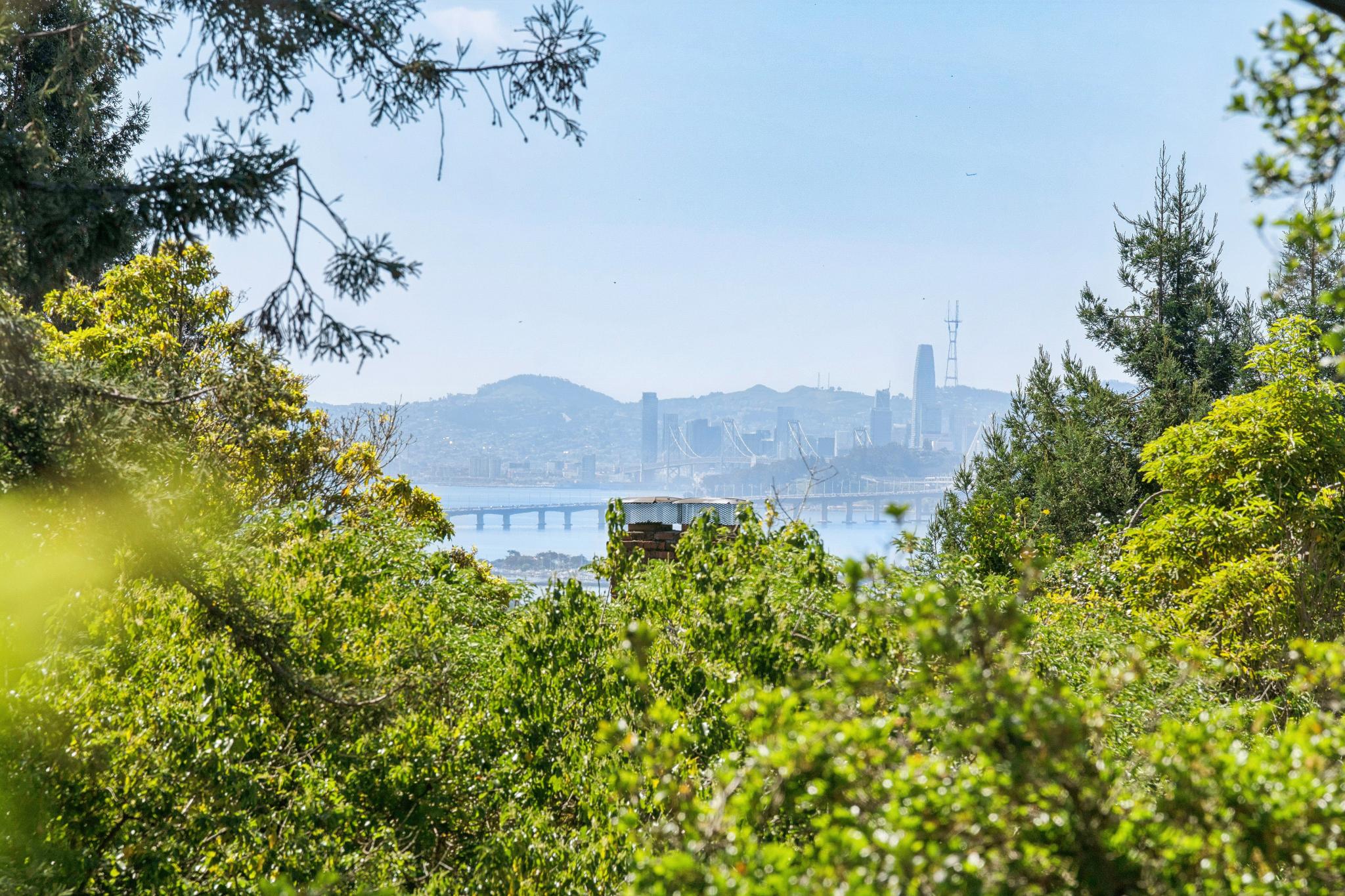 The welcoming living room and dining room are bathed in sunlight from morning till dusk. A seeming wall of windows captures beautifully tree-filtered views of many classic Bay Area treasures: San Francisco, Golden Gate Bridge, UC Berkeley’s Campanile, Oakland, and Alcatraz Island. The sweet deck, easily accessed from sliding glass doors off the dining room, spans the length of the front of the home and is a dreamy spot for morning coffee while listening to the springtime chirping of birds, or an evening dinner, enjoying dramatic sunset hues over the Golden Gate Bridge. Freshly refinished original oak hardwood floors and a handsome fireplace flanked by charming built-ins set off the living-room views, creating a restful retreat after a long day out and about.