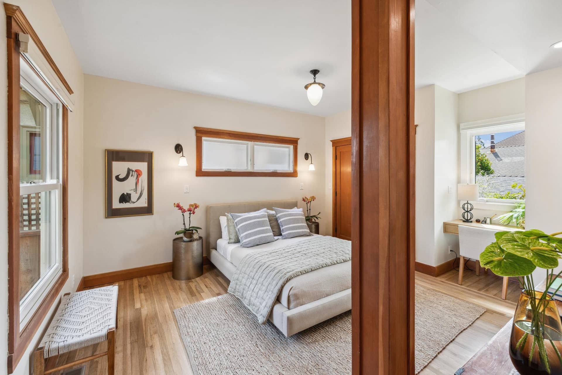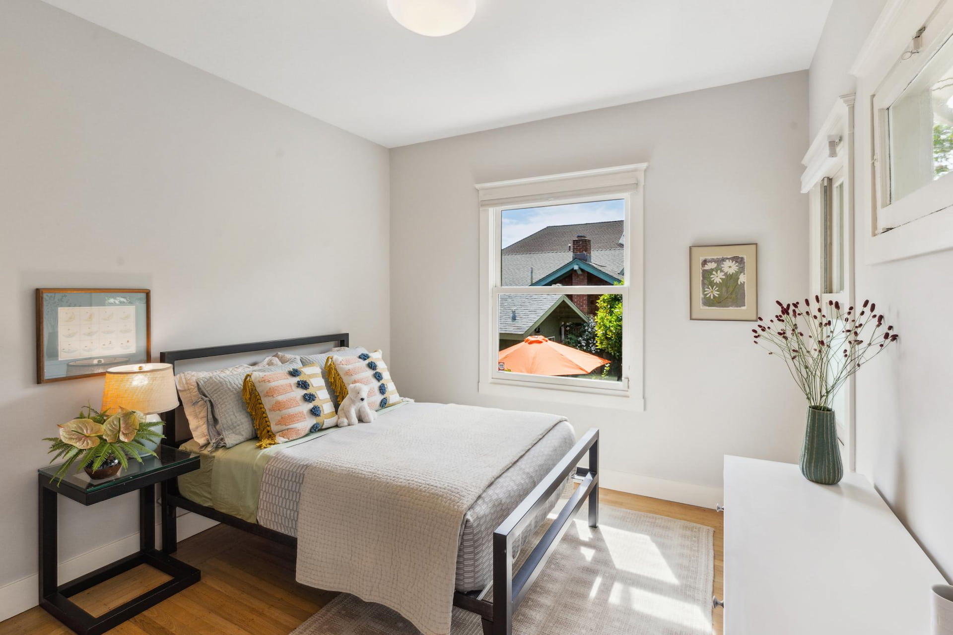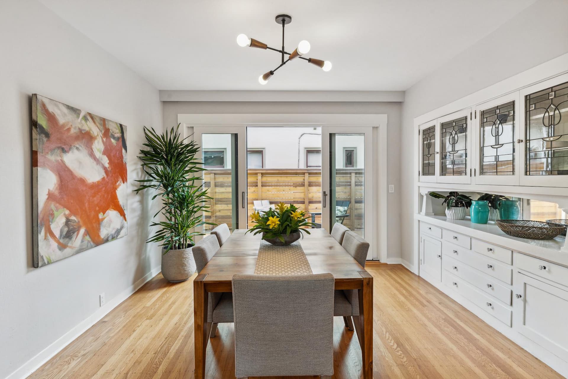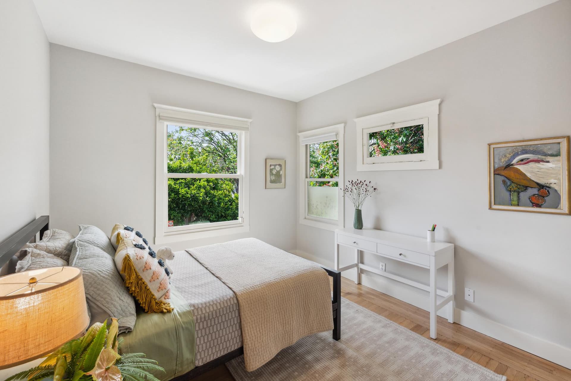 Stylish Craftsman with modern upgrades and vintage essence in the heart of Berkeley. A gorgeous single-level 3-bedroom, 2-bath home, with a detached garden structure*, offers a serene retreat in the hub of a vibrant neighborhood. Minutes to the world-renowned University of California at Berkeley, fabulous restaurants, performing arts theaters, and music venues. The nearby North Berkeley BART makes for convenient access to daily activities. Once inside the gate, your oasis awaits, where professionally designed gardens create private and peaceful surroundings. The covered porch, with its graceful arches, beautifully frames the garden. Once inside, a roomy foyer leads to a well-lit living room with wall-to-wall picture windows, a brick-faced fireplace, and built-in bookshelves. The open-concept dining room and chef’s kitchen are well-suited for everyday enjoyment and gatherings. Walnut cabinetry with abundant storage and a built-in desk, designer tile, and skylight add to the functionality of the kitchen. The original leaded-glass built-in cabinets are complemented by the sleek floor-to-ceiling sliding glass doors leading to the deck. The seamless connection to the spacious deck extends the dining area for al fresco dining.