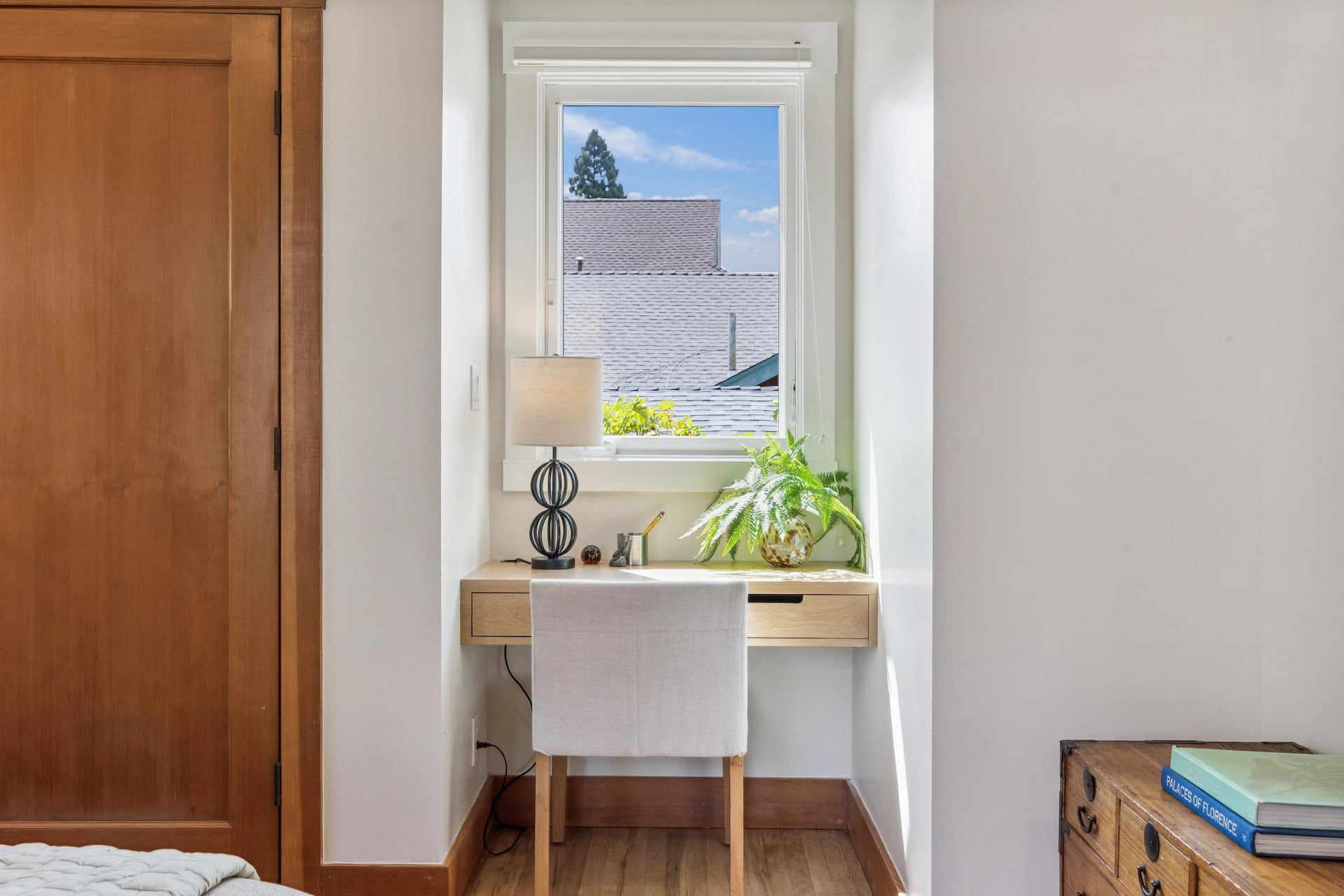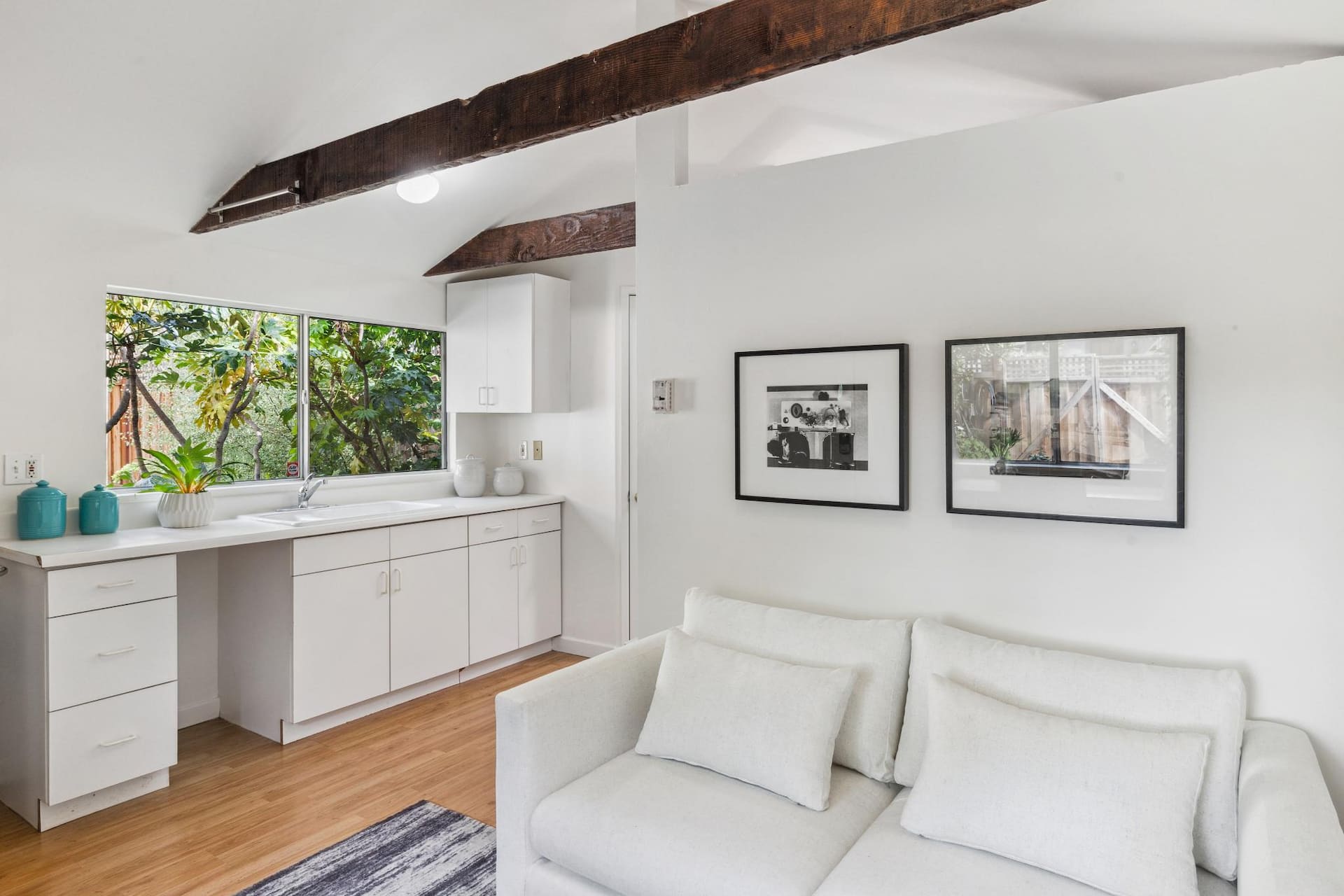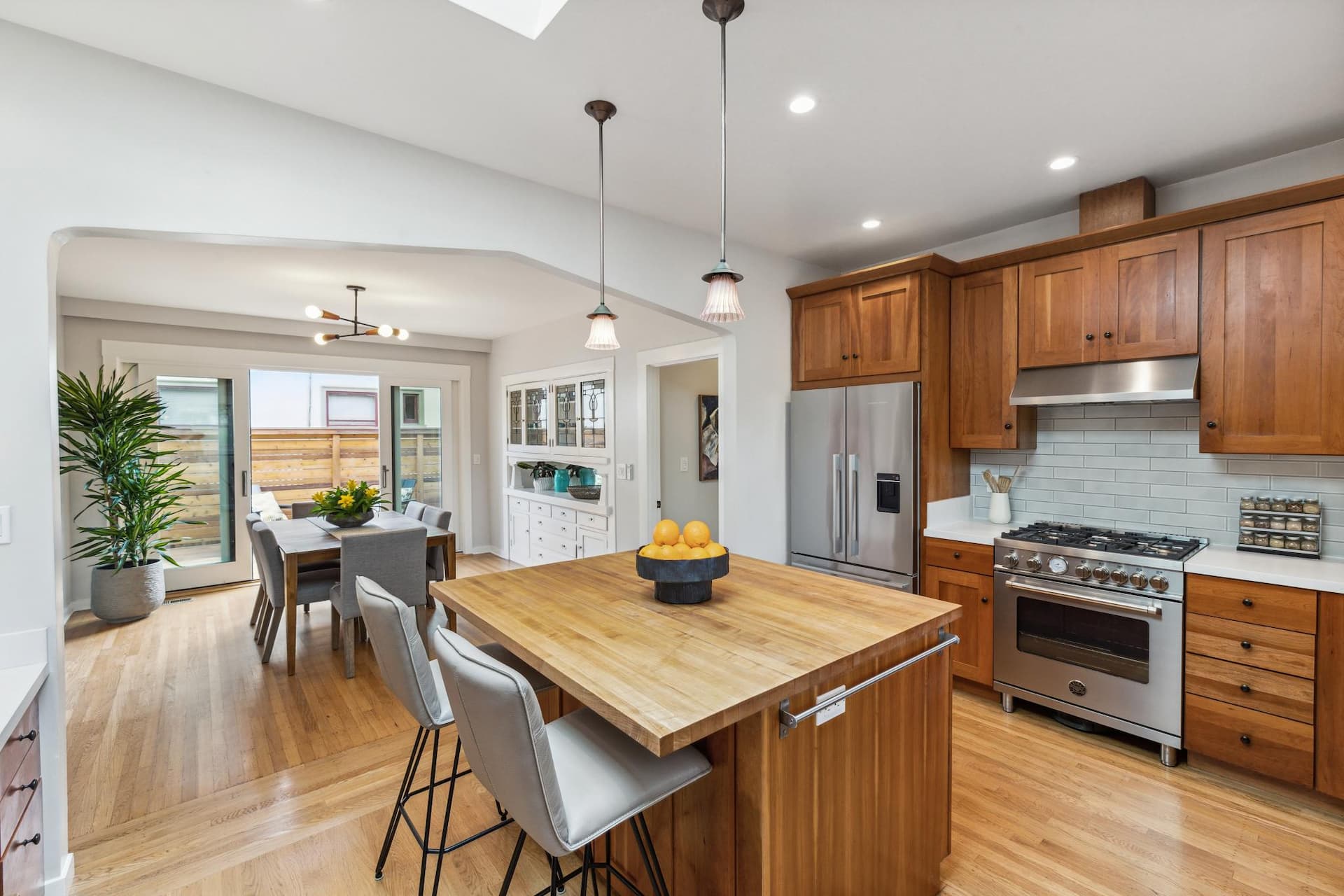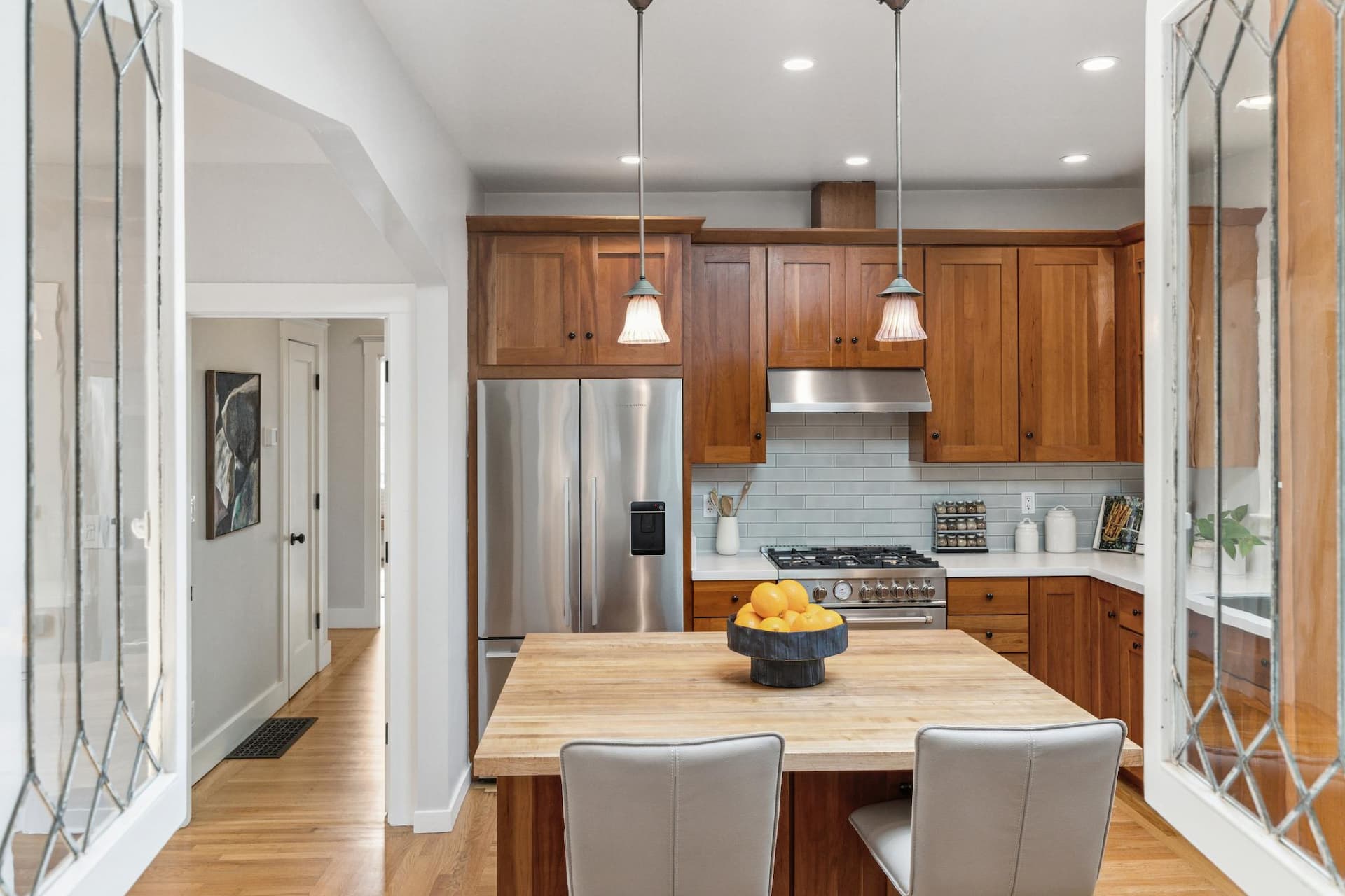 Stylish Craftsman with modern upgrades and vintage essence in the heart of Berkeley. A gorgeous single-level 3-bedroom, 2-bath home, with a detached garden structure*, offers a serene retreat in the hub of a vibrant neighborhood. Minutes to the world-renowned University of California at Berkeley, fabulous restaurants, performing arts theaters, and music venues. The nearby North Berkeley BART makes for convenient access to daily activities. Once inside the gate, your oasis awaits, where professionally designed gardens create private and peaceful surroundings. The covered porch, with its graceful arches, beautifully frames the garden. Once inside, a roomy foyer leads to a well-lit living room with wall-to-wall picture windows, a brick-faced fireplace, and built-in bookshelves. The open-concept dining room and chef’s kitchen are well-suited for everyday enjoyment and gatherings. Walnut cabinetry with abundant storage and a built-in desk, designer tile, and skylight add to the functionality of the kitchen. The original leaded-glass built-in cabinets are complemented by the sleek floor-to-ceiling sliding glass doors leading to the deck. The seamless connection to the spacious deck extends the dining area for al fresco dining.