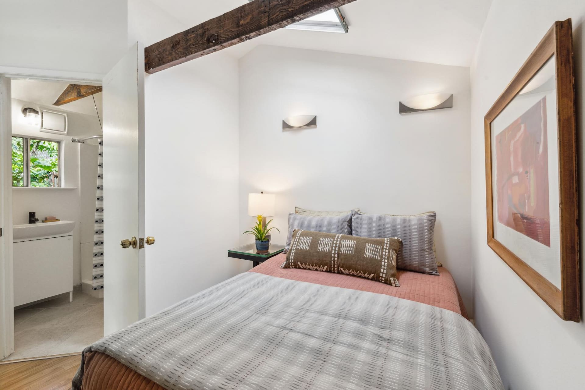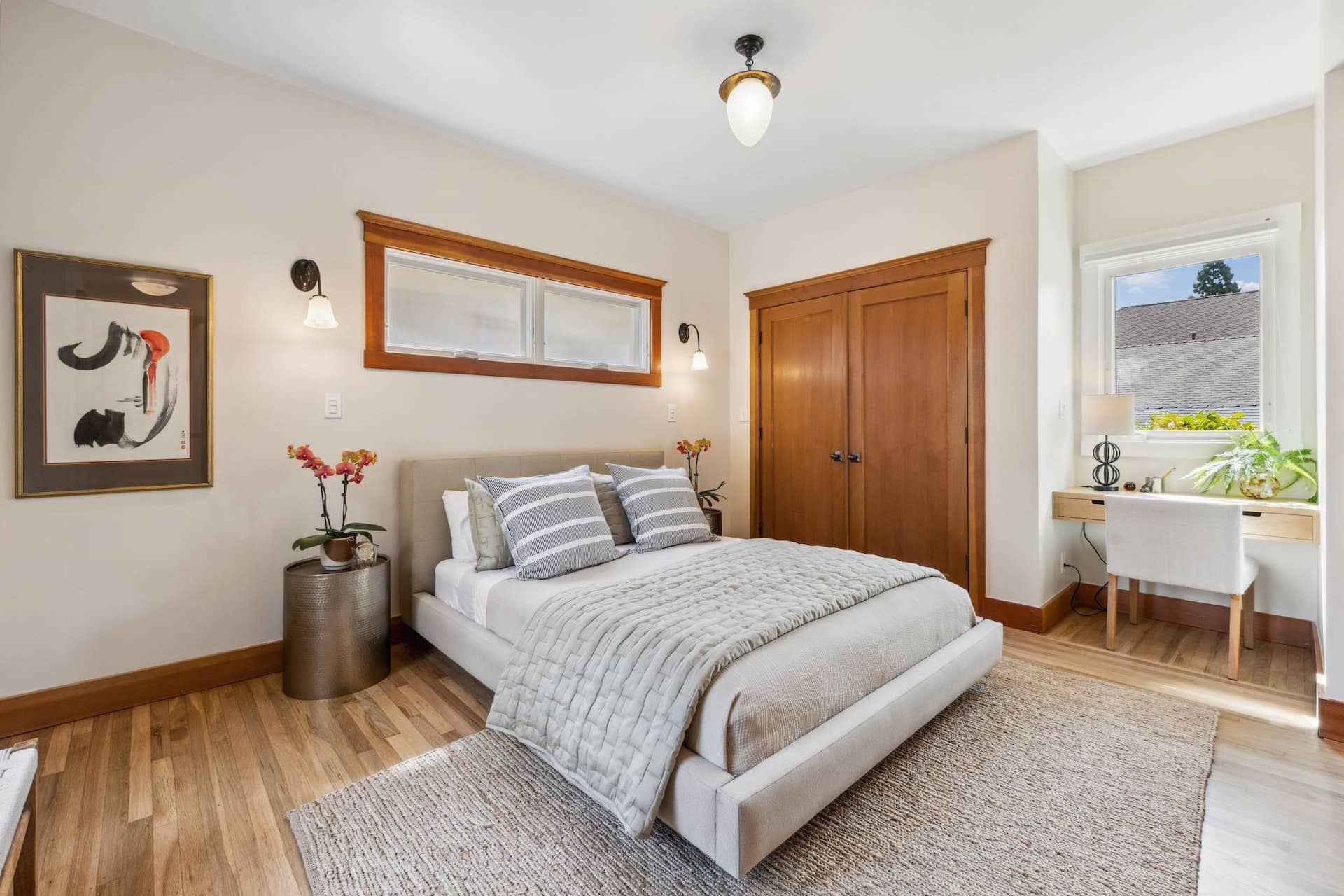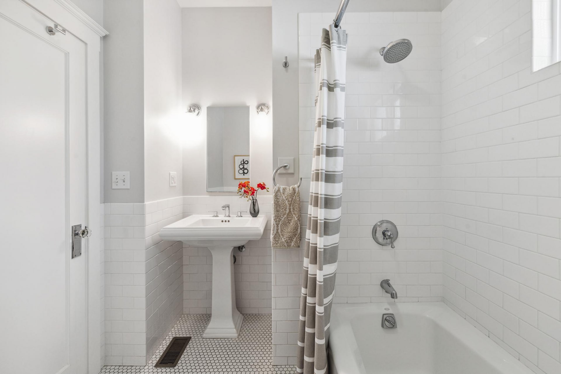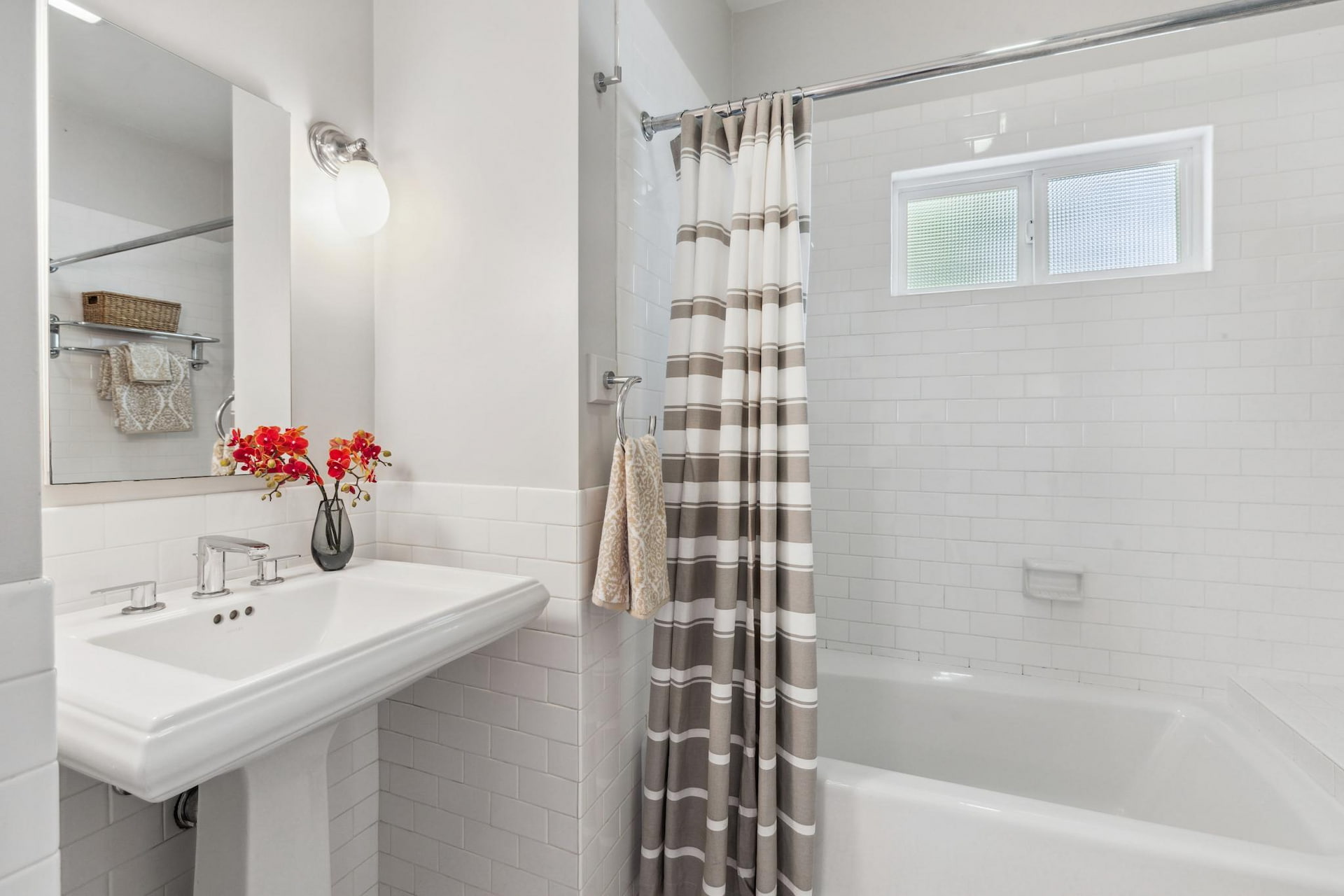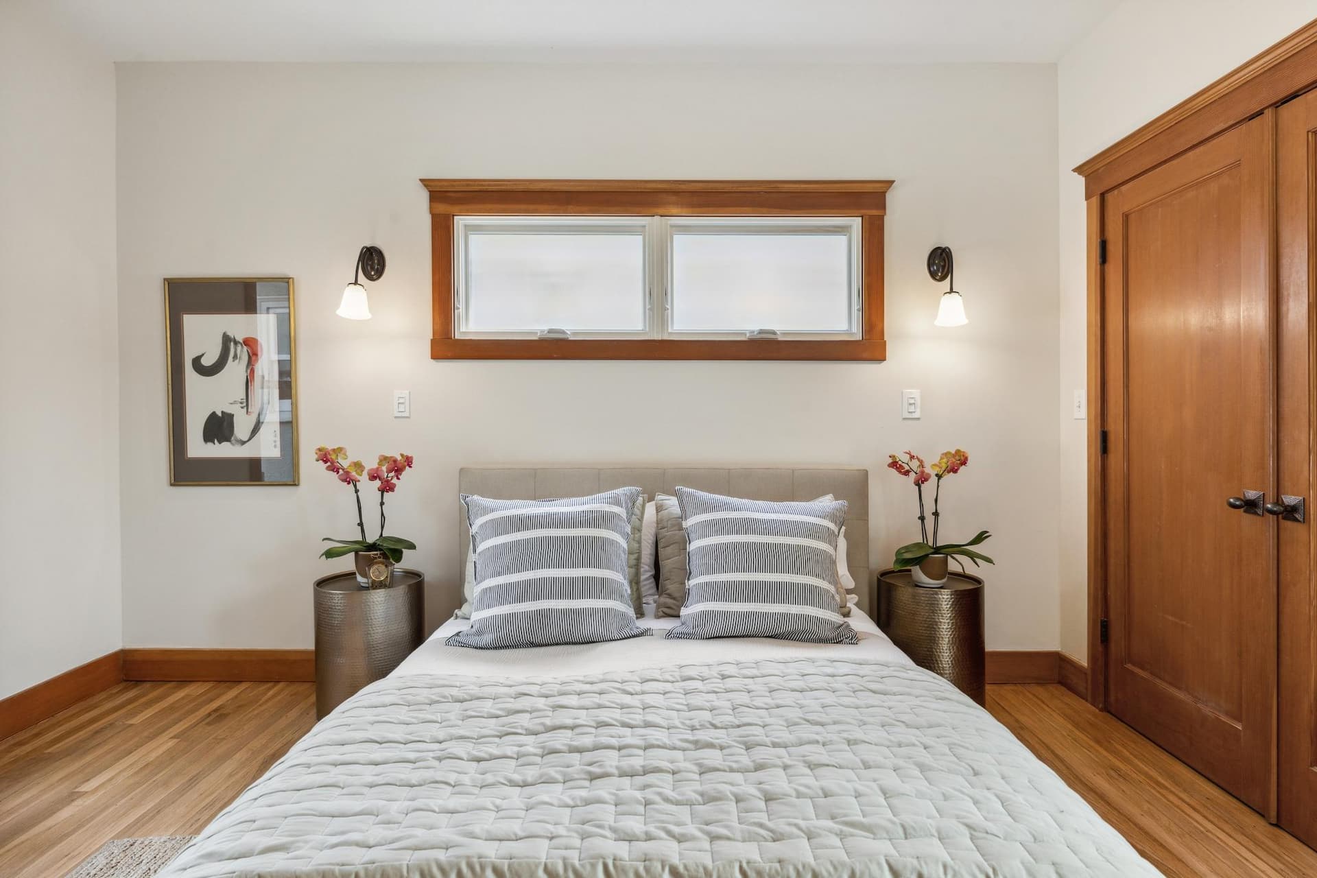 Down the hallway, there are two spacious and high-ceilinged light-filled bedrooms with views to the lovely backyard and a subway-tiled bathroom as well as a conveniently located closet for a stackable washer/dryer. A spacious bedroom suite and bathroom with double sinks and a vintage clawfoot tub provide a peaceful sanctuary.