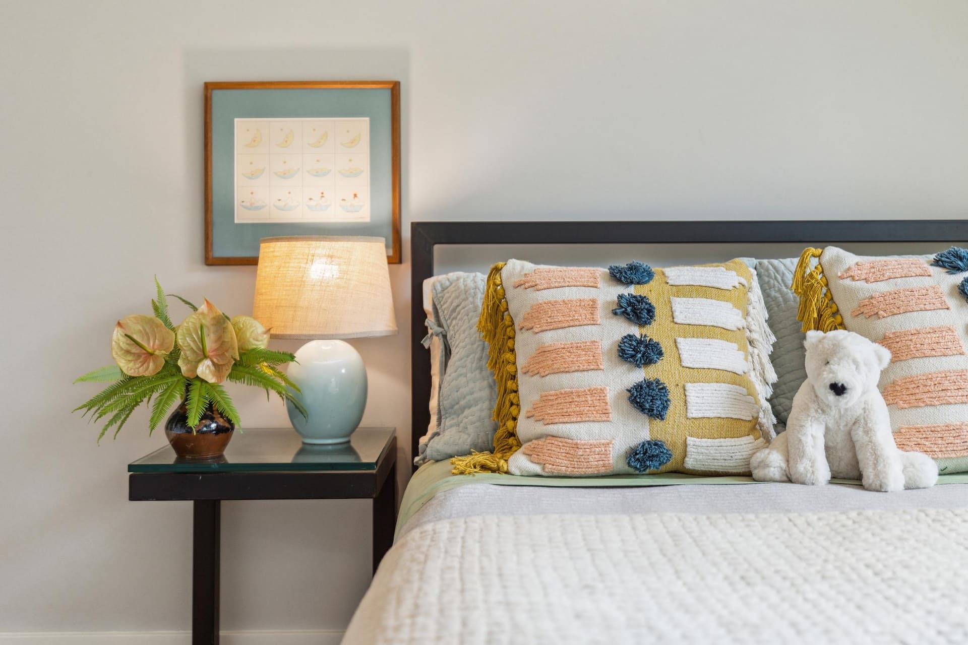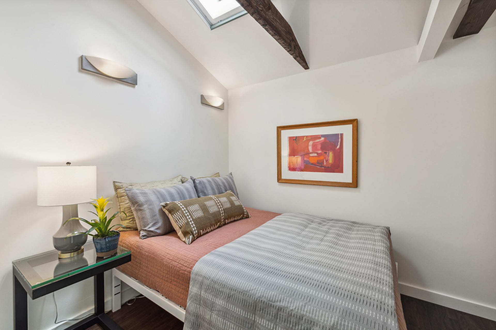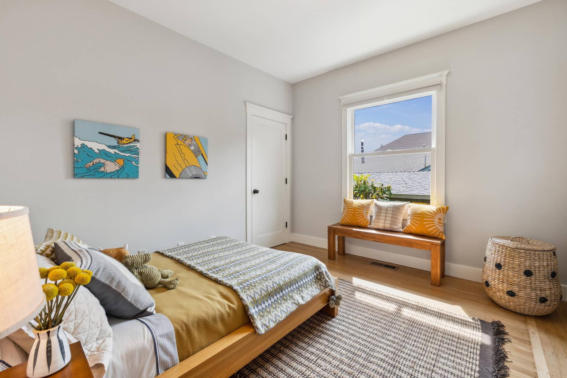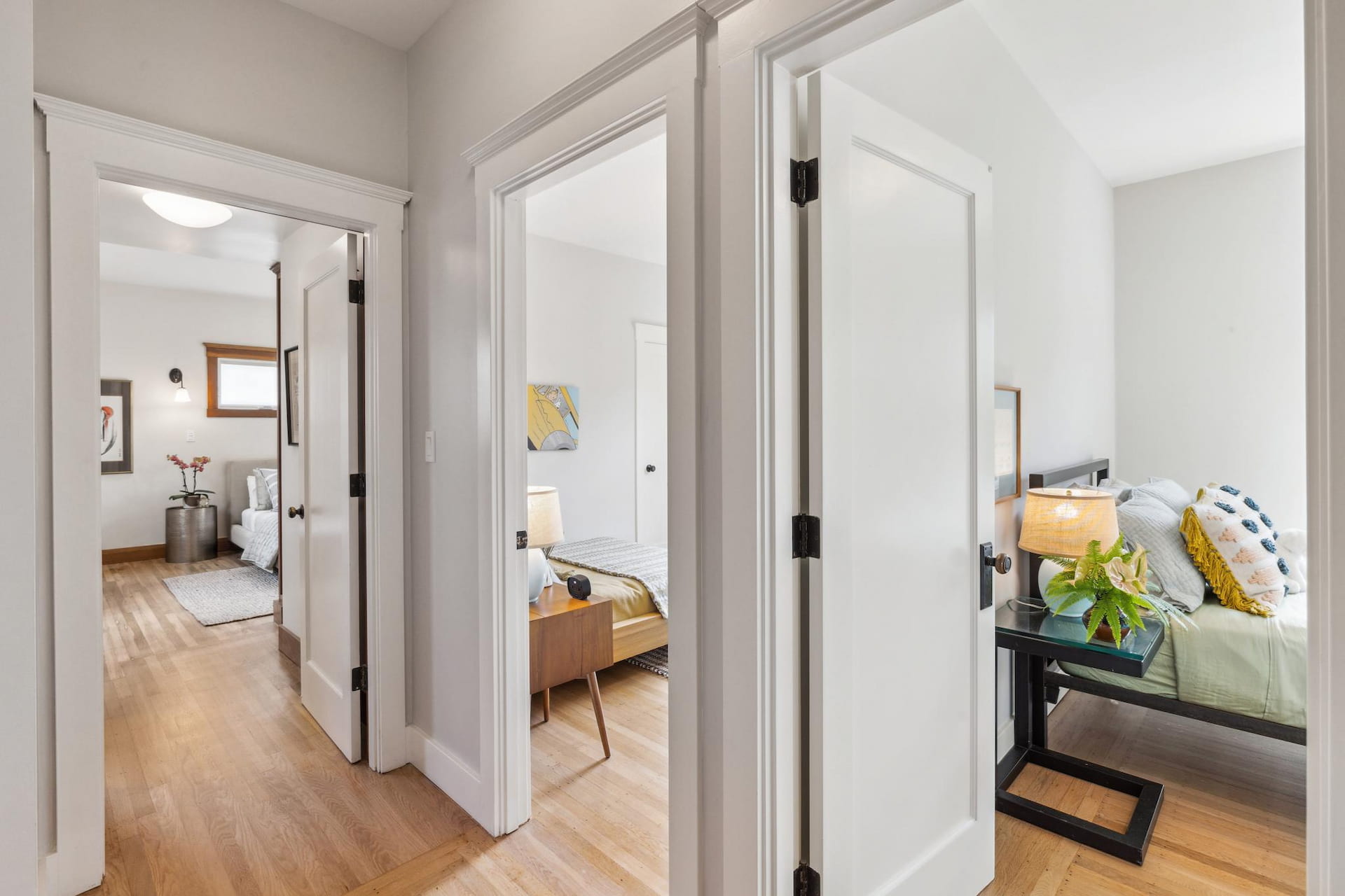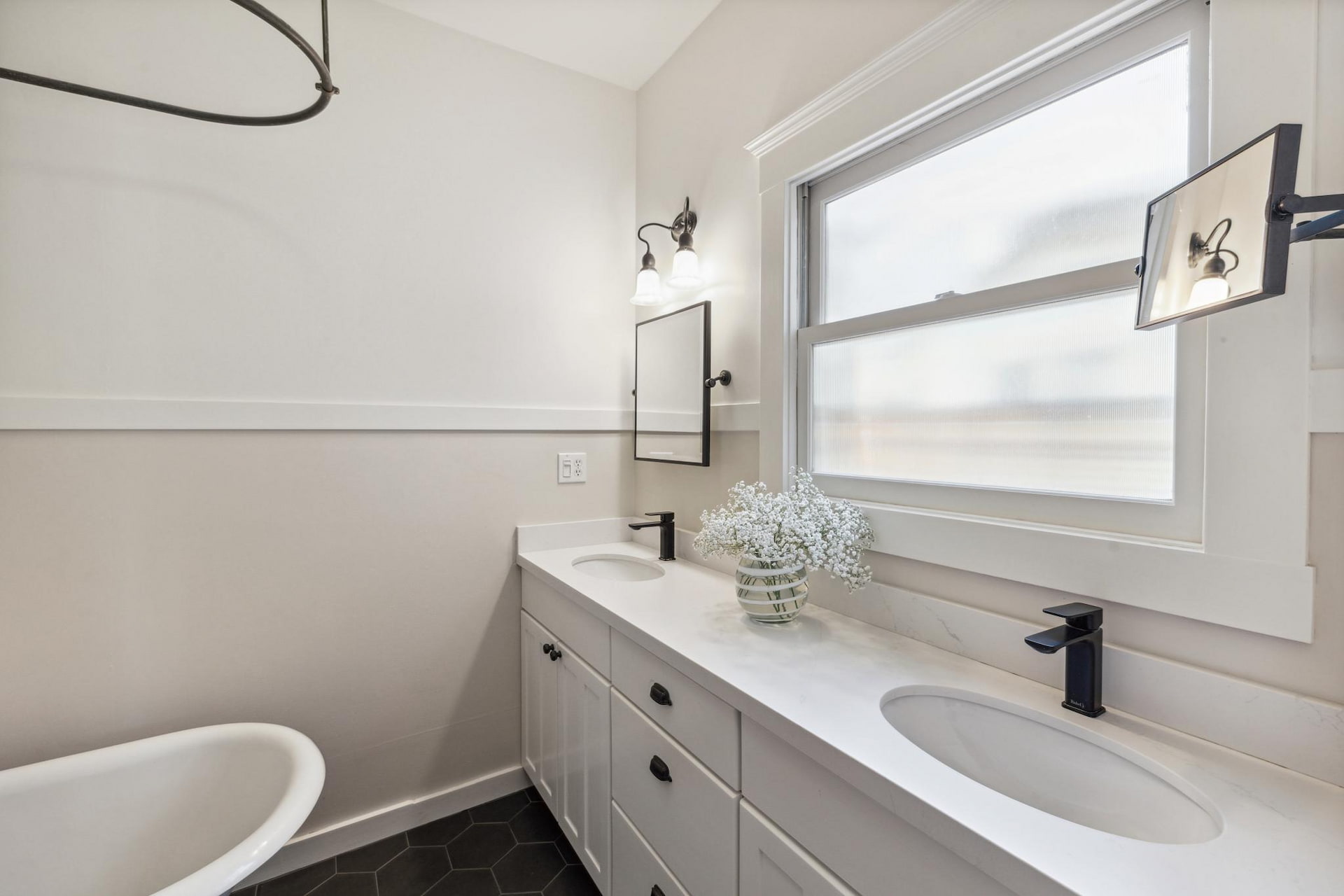 Down the hallway, there are two spacious and high-ceilinged light-filled bedrooms with views to the lovely backyard and a subway-tiled bathroom as well as a conveniently located closet for a stackable washer/dryer. A spacious bedroom suite and bathroom with double sinks and a vintage clawfoot tub provide a peaceful sanctuary.
