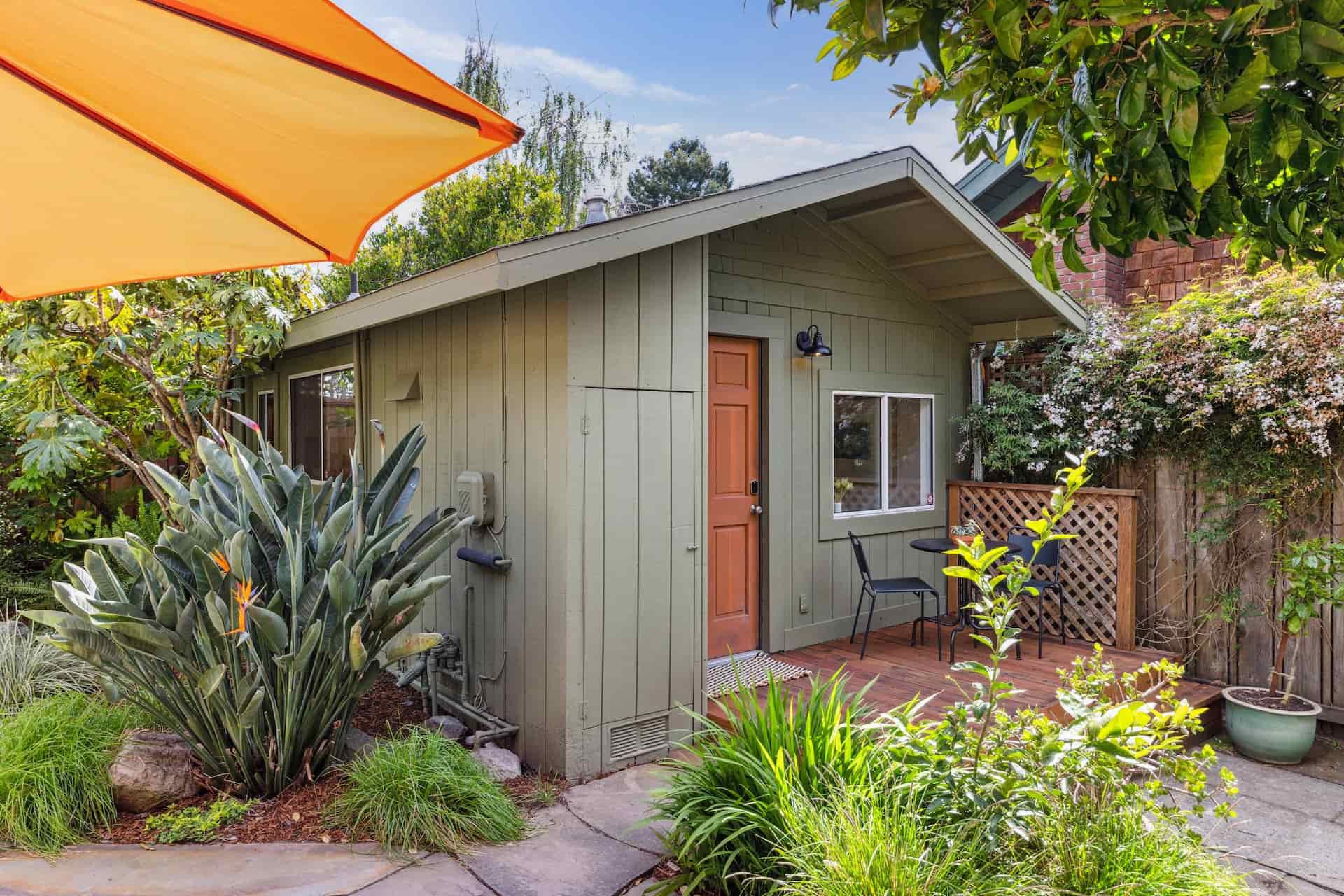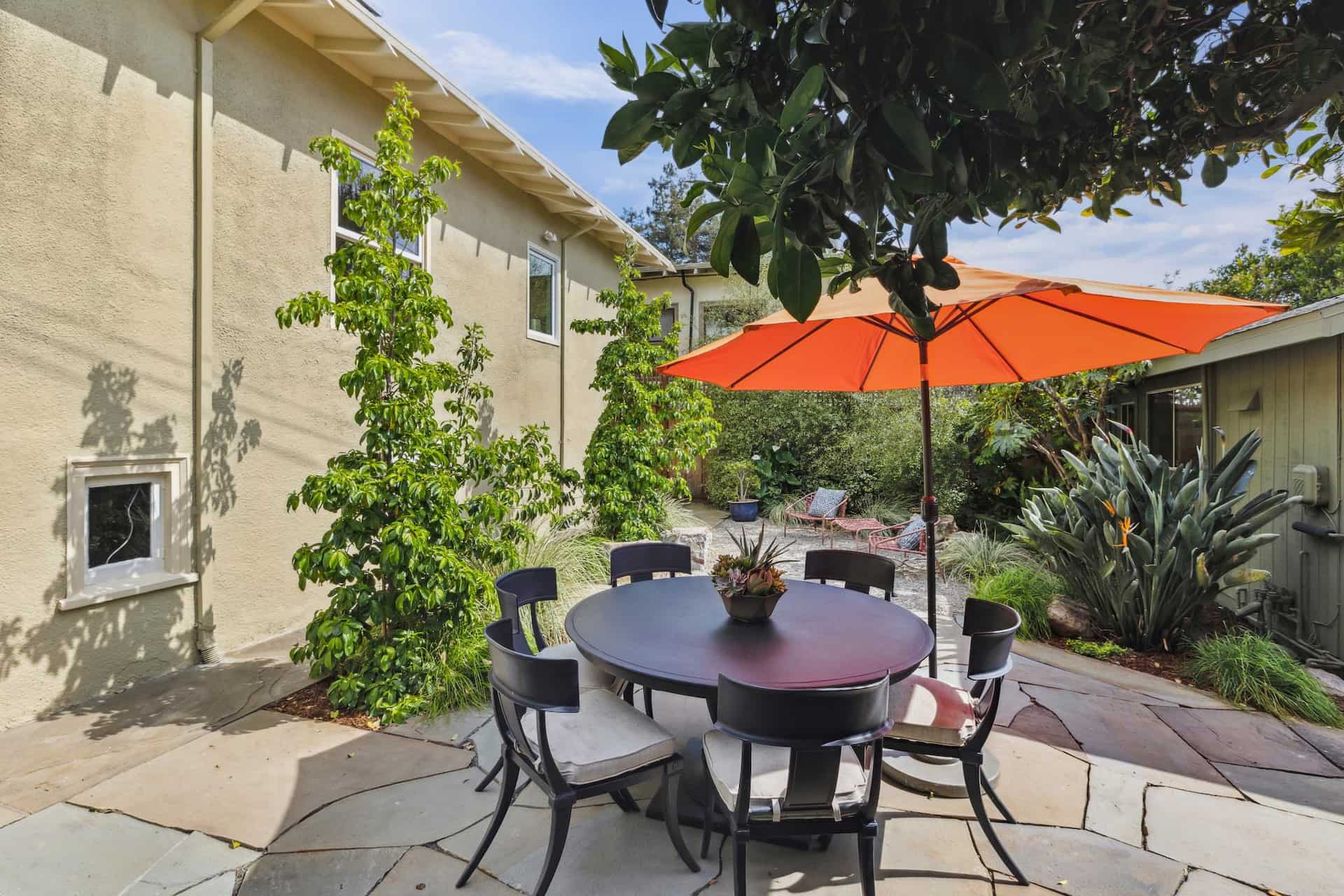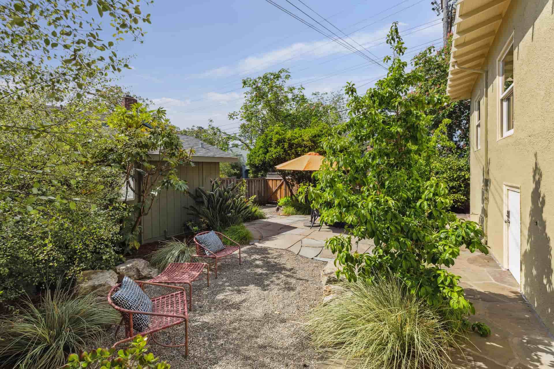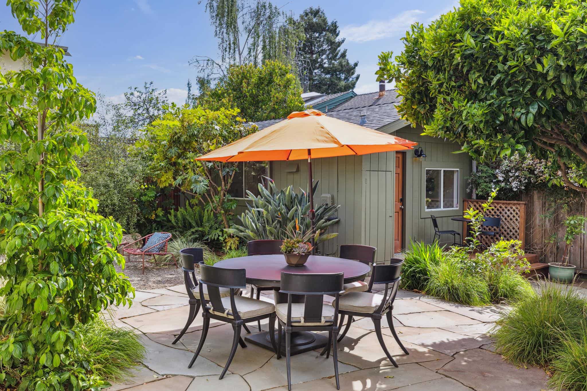 The artful flagstone backyard patio surrounded by mature fruit trees and plants is ideal for hosting and entertaining guests. To top it off, there is a charming garden structure the seller used as a home office and as guest quarters.