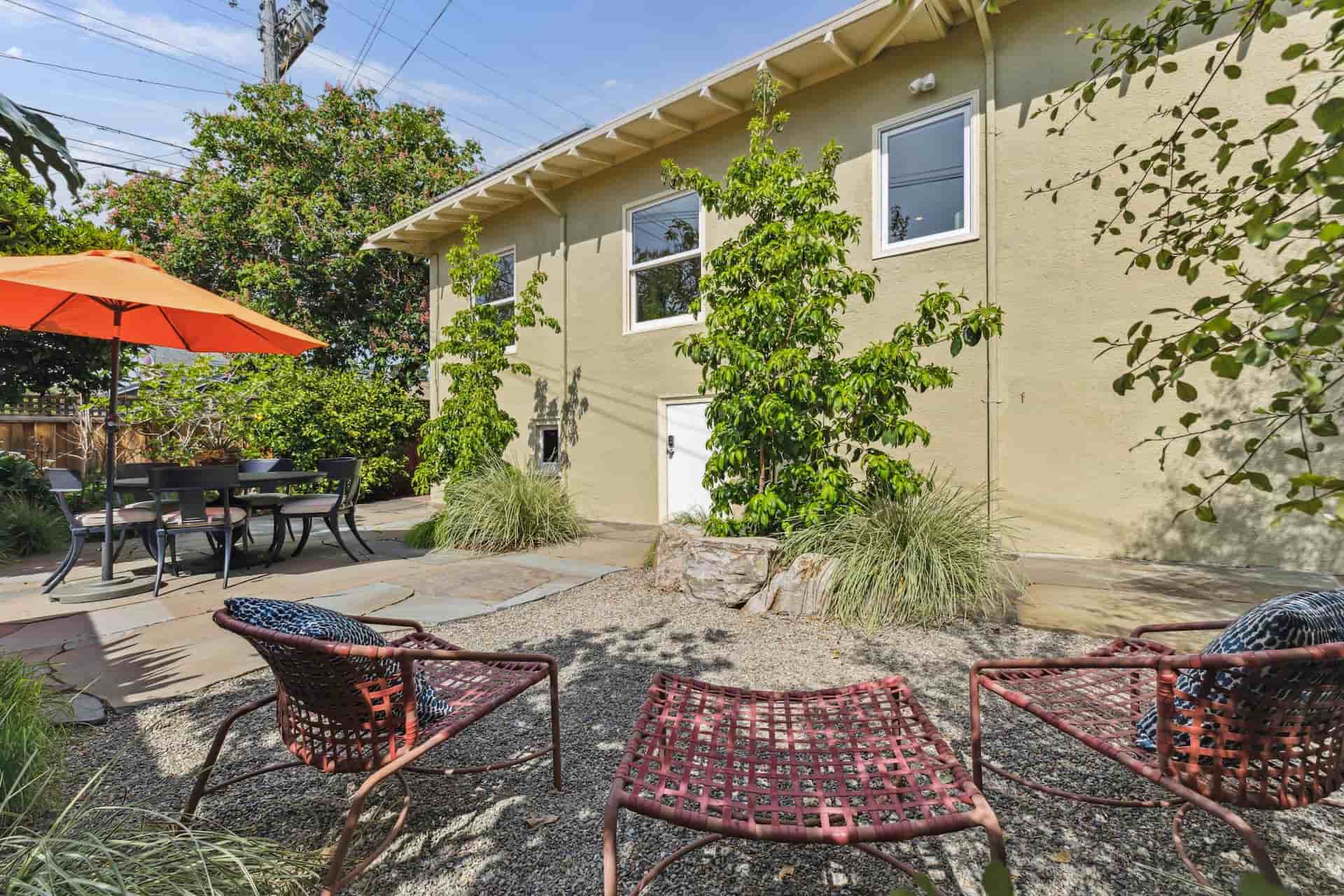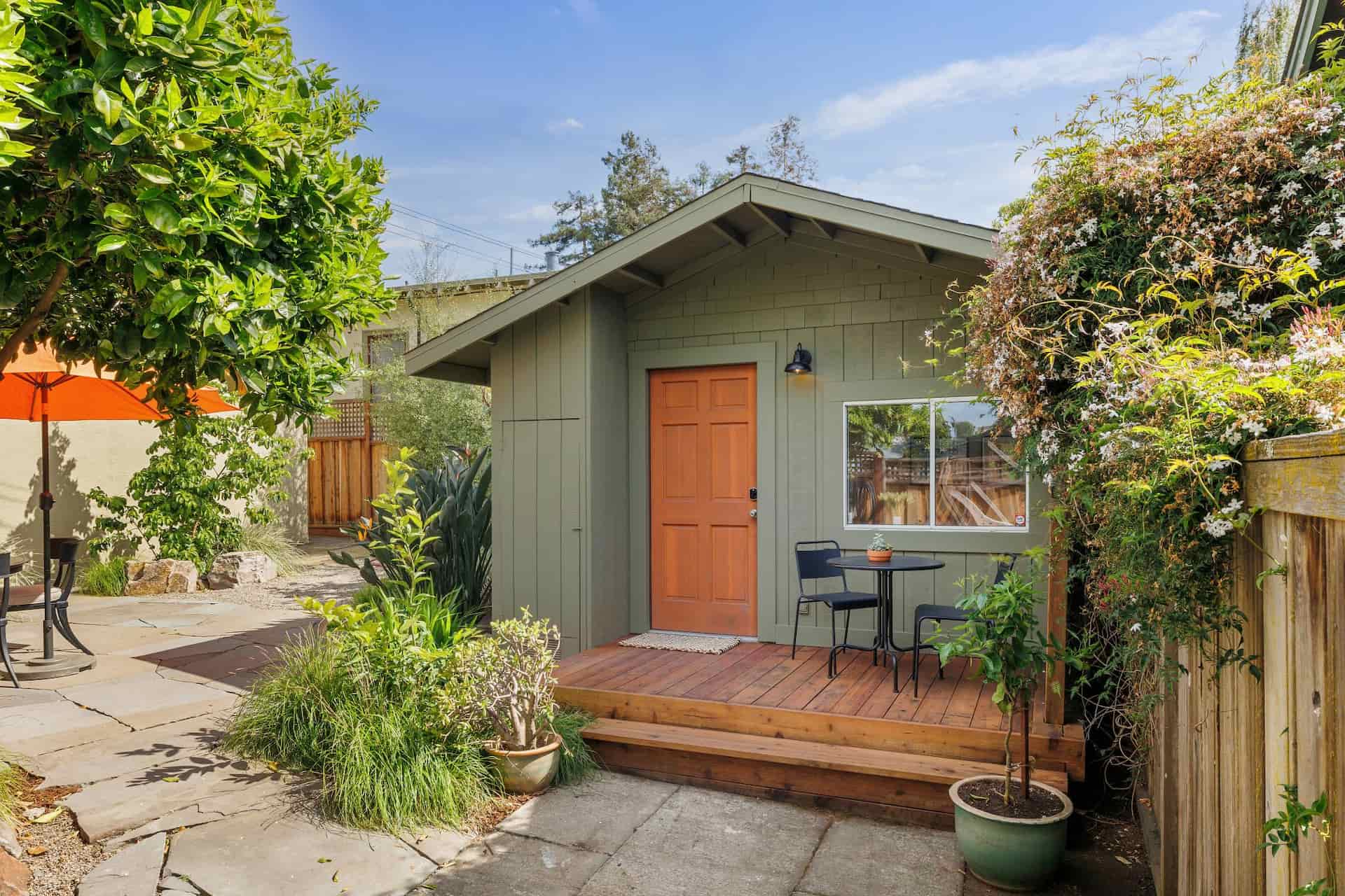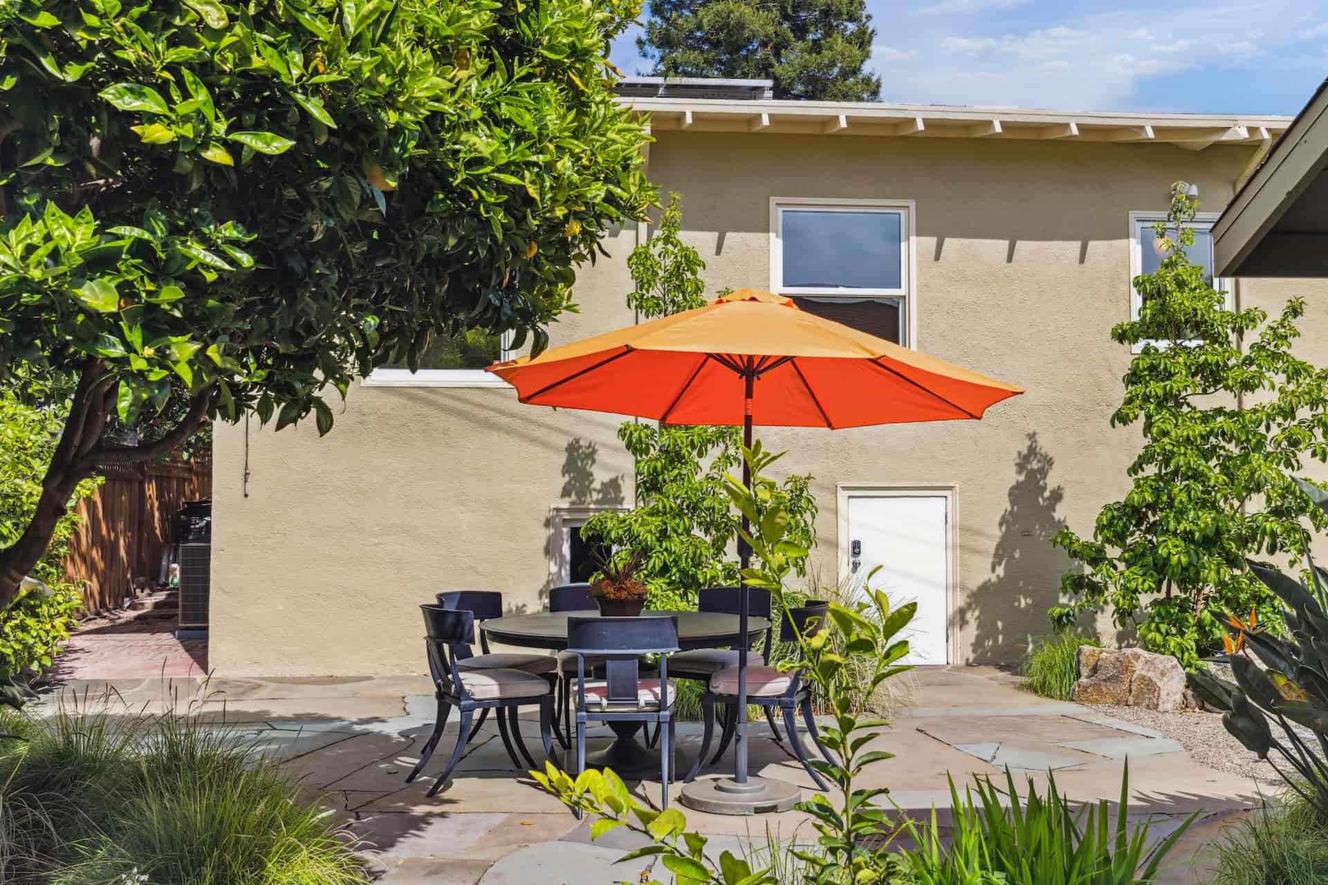 The artful flagstone backyard patio surrounded by mature fruit trees and plants is ideal for hosting and entertaining guests. To top it off, there is a charming garden structure the seller used as a home office and as guest quarters.