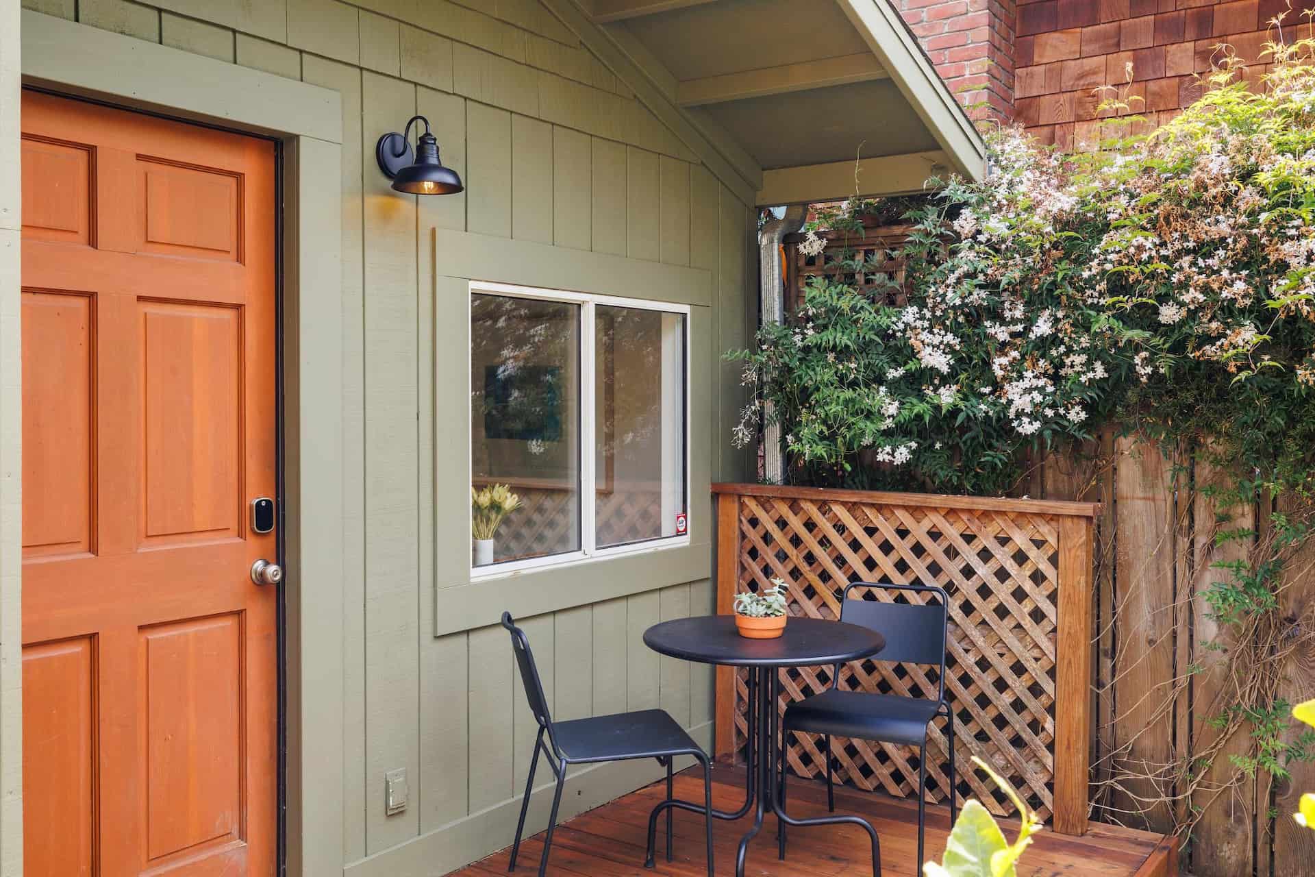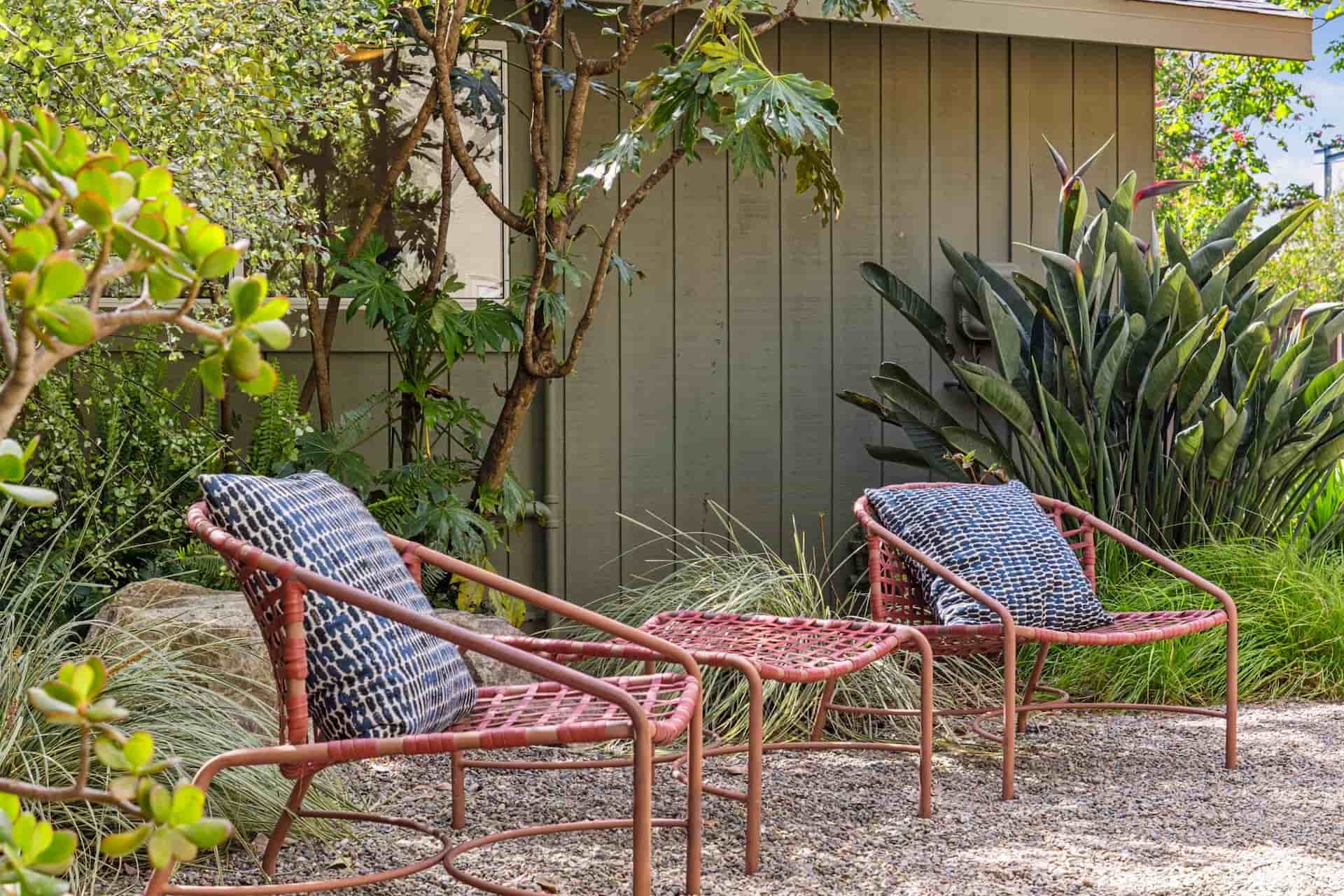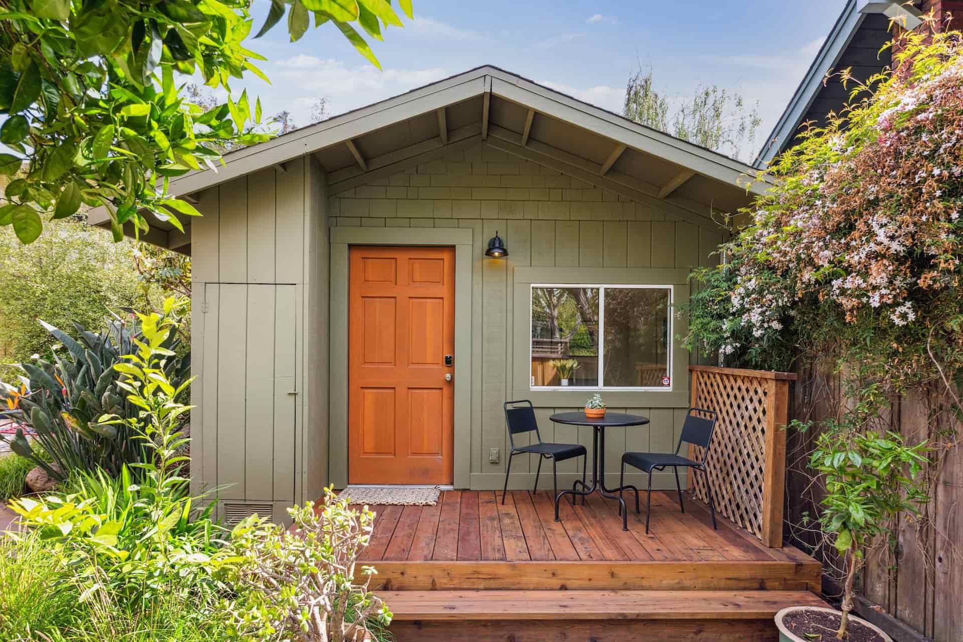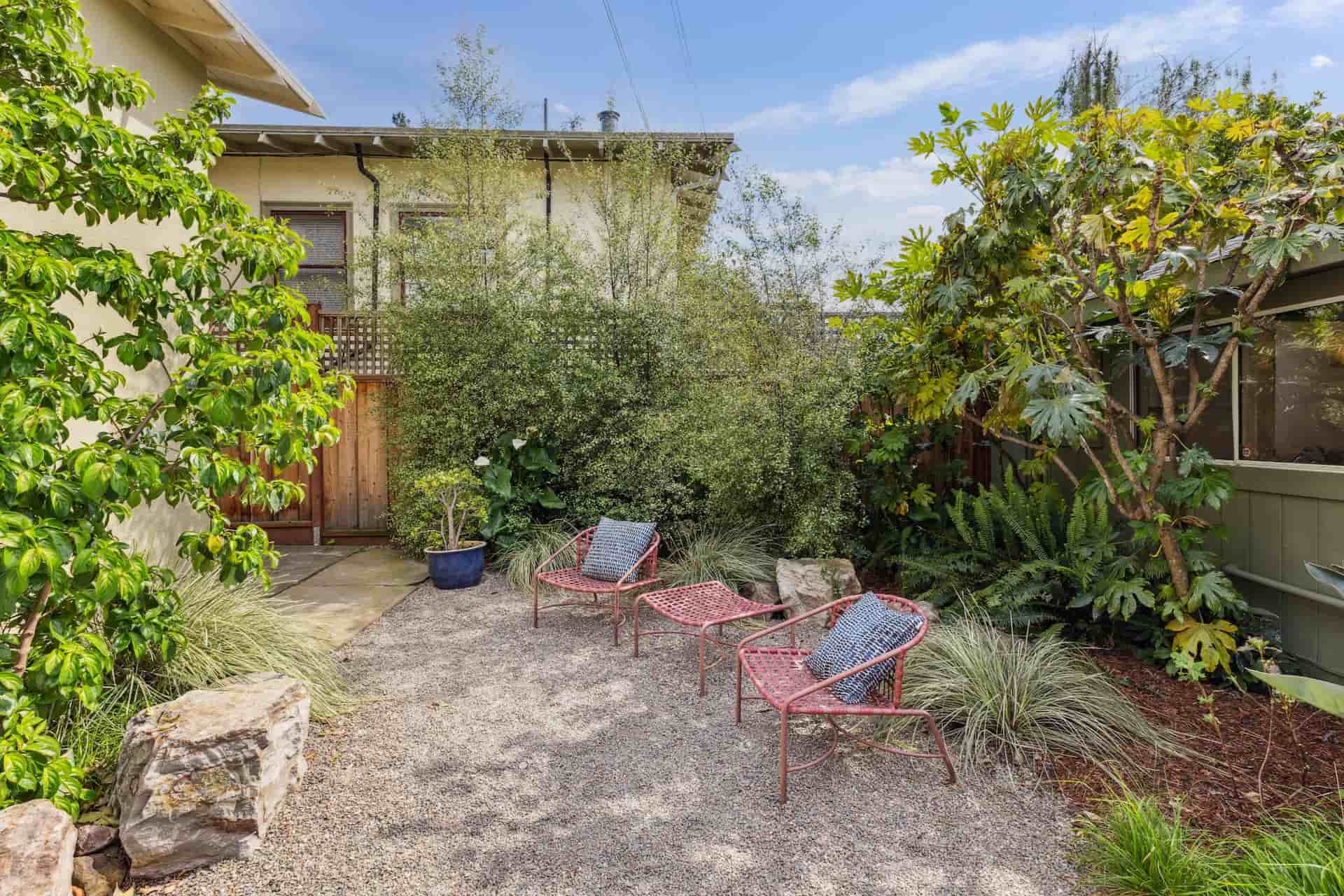 The artful flagstone backyard patio surrounded by mature fruit trees and plants is ideal for hosting and entertaining guests. To top it off, there is a charming garden structure the seller used as a home office and as guest quarters.