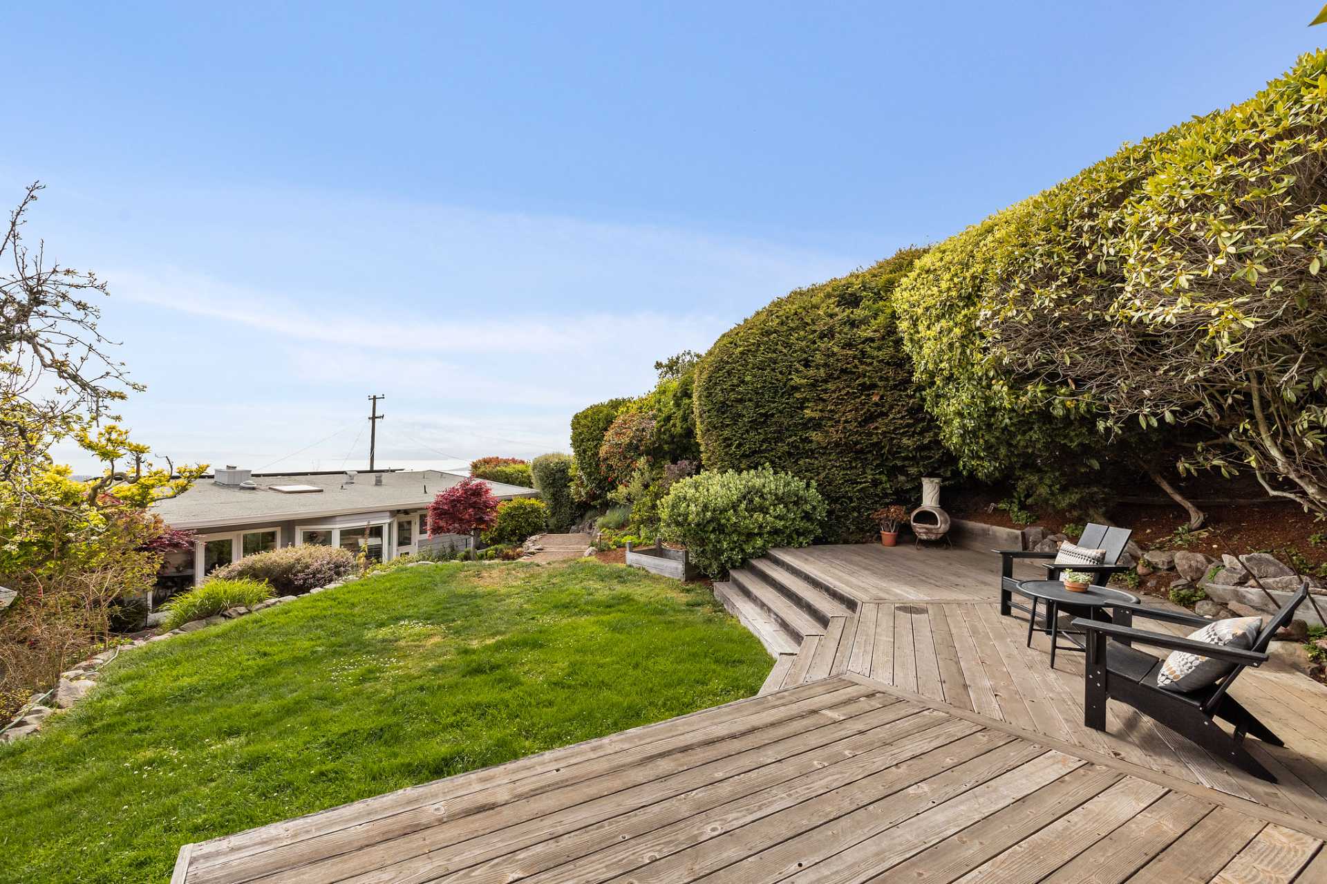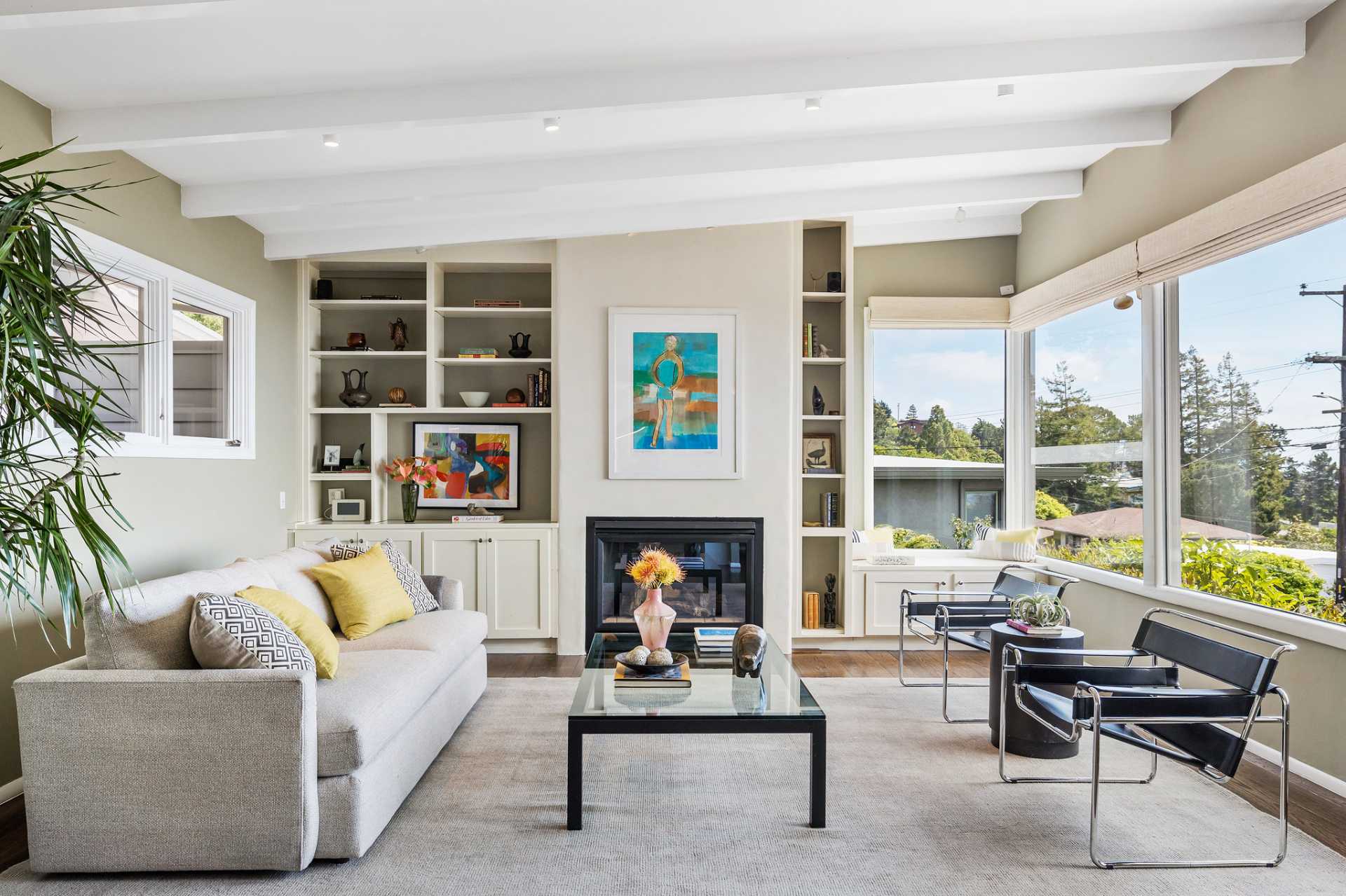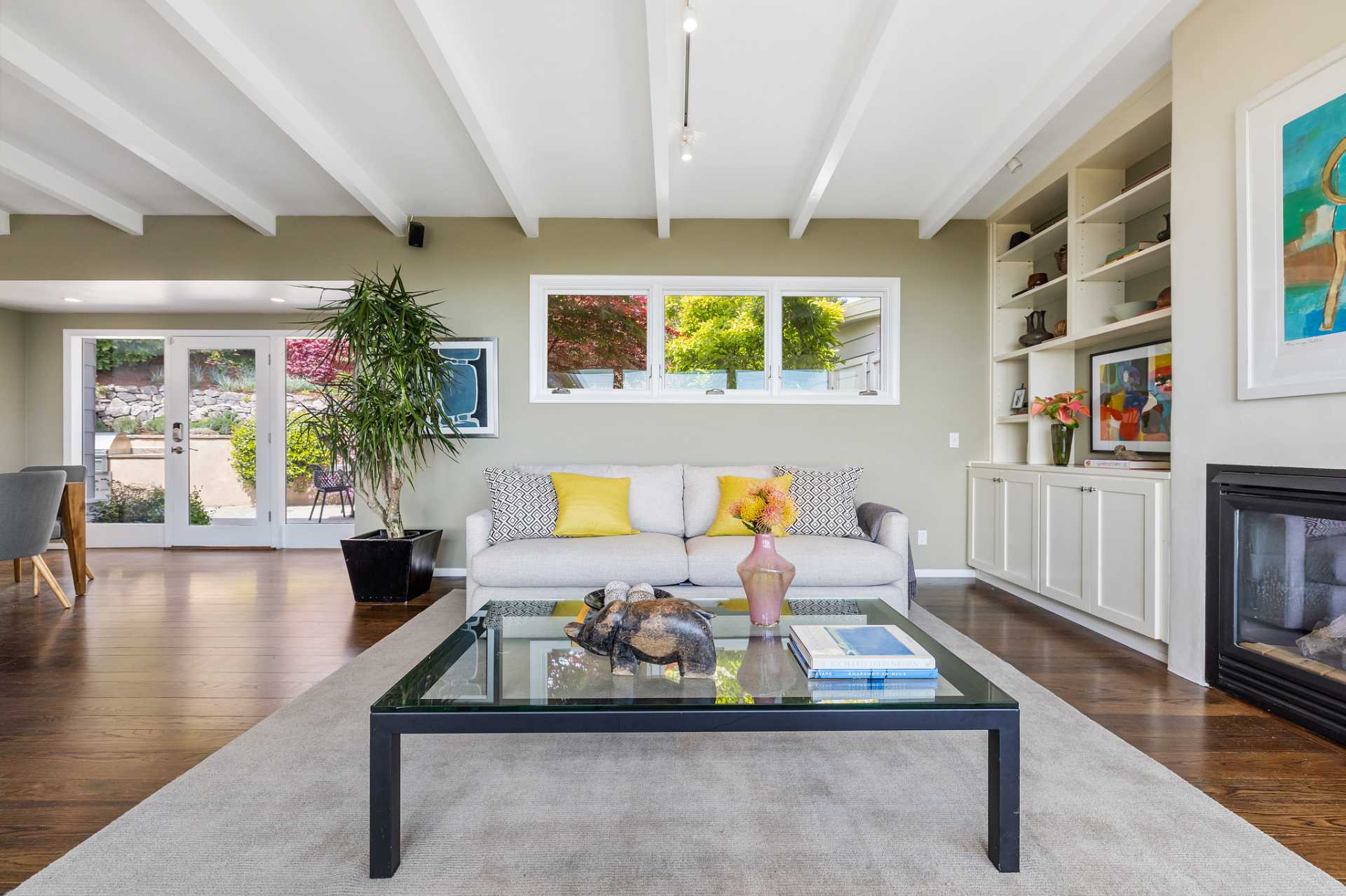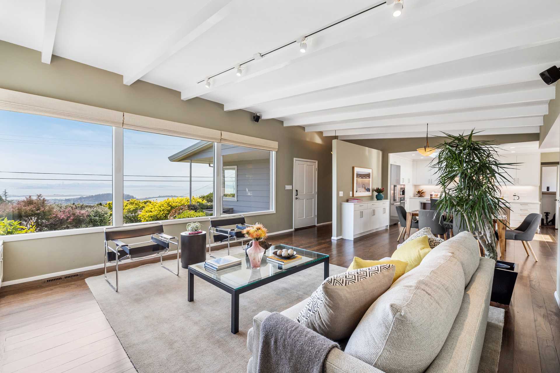 Privacy and views! A completely updated and re-imagined Mid-century 3-bedroom, 2-bathroom home with gorgeous gardens, all on one level in a wonderful Kensington neighborhood. This impeccably designed and stylish home is perched above the street, with sweeping views of San Francisco and the Bay. Vaulted beamed ceilings and oversized windows allow a flood of light into the living areas, the hardwood floors gleam, and a modern fireplace and built-in shelves anchor the living room. The open concept design brings natural flow from living room, to dining room, to kitchen, and the French doors off the dining room provide easy indoor/outdoor flow.