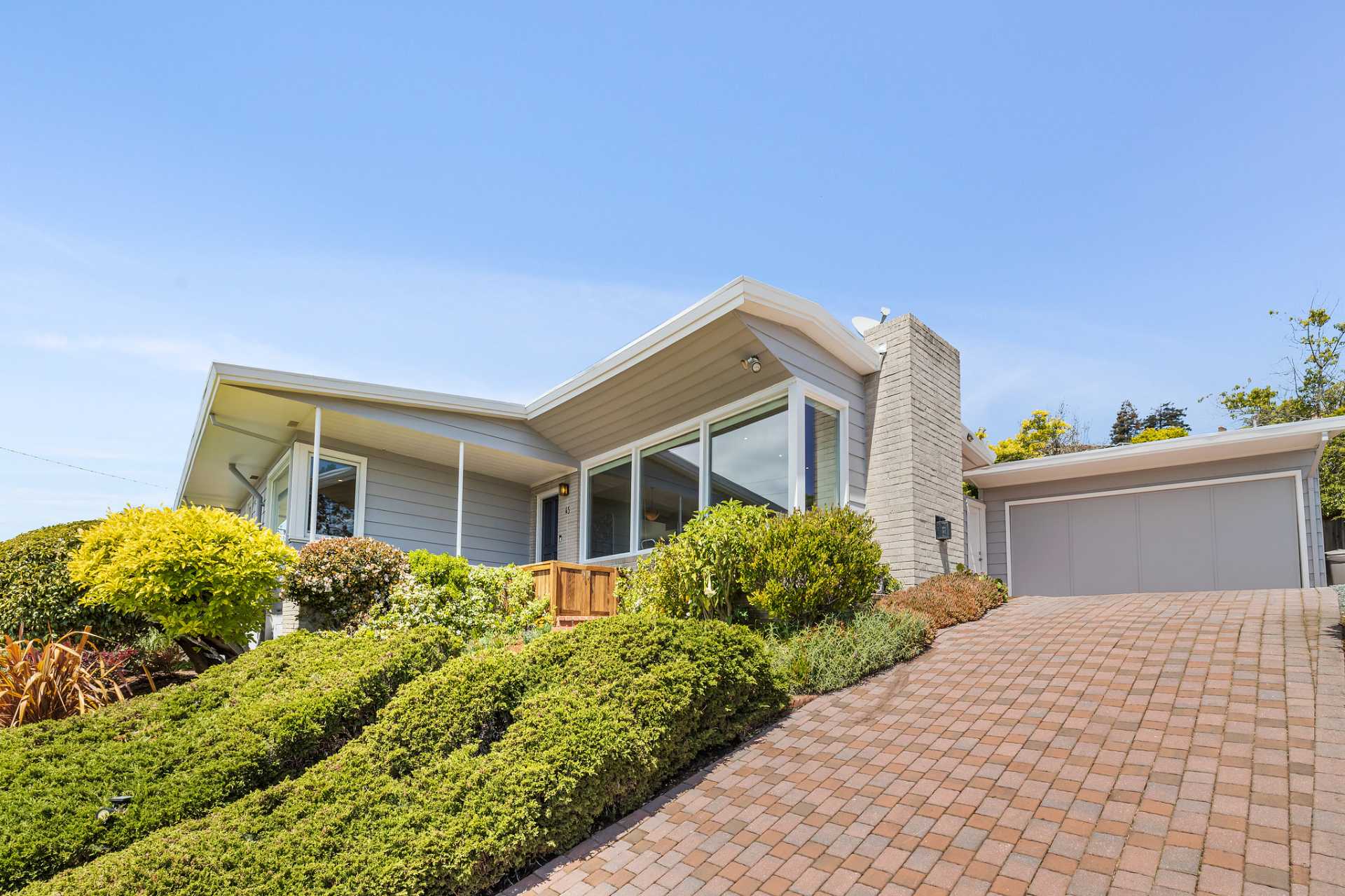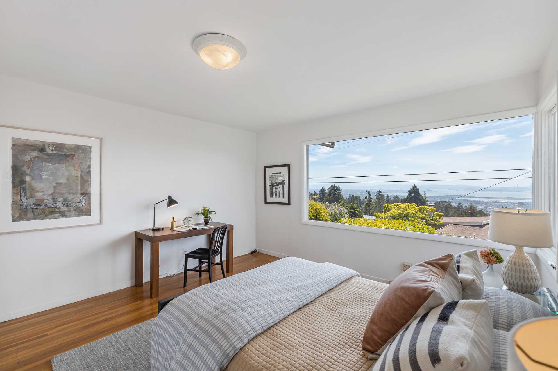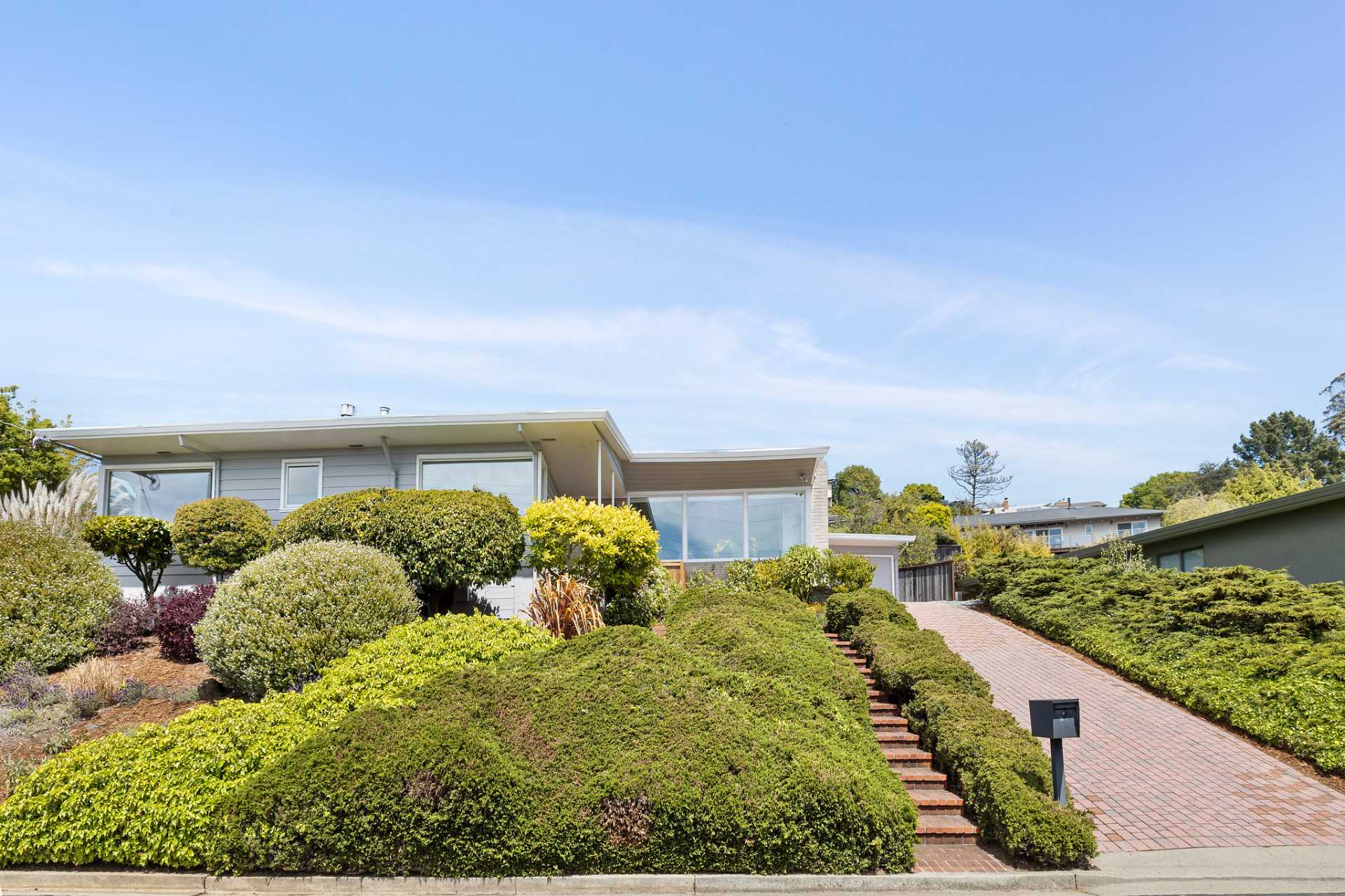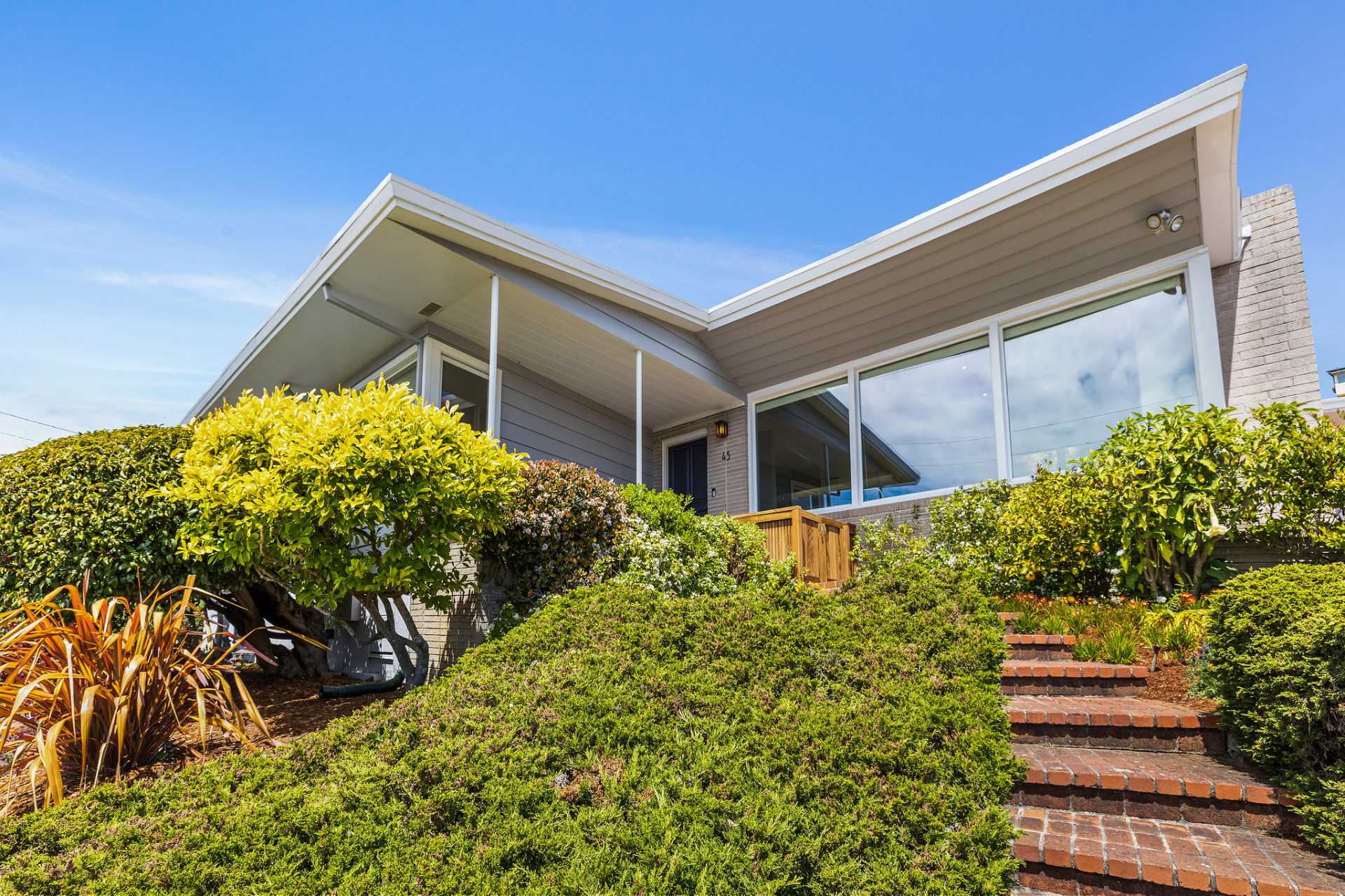 Privacy and views! A completely updated and re-imagined Mid-century 3-bedroom, 2-bathroom home with gorgeous gardens, all on one level in a wonderful Kensington neighborhood. This impeccably designed and stylish home is perched above the street, with sweeping views of San Francisco and the Bay. Vaulted beamed ceilings and oversized windows allow a flood of light into the living areas, the hardwood floors gleam, and a modern fireplace and built-in shelves anchor the living room. The open concept design brings natural flow from living room, to dining room, to kitchen, and the French doors off the dining room provide easy indoor/outdoor flow.