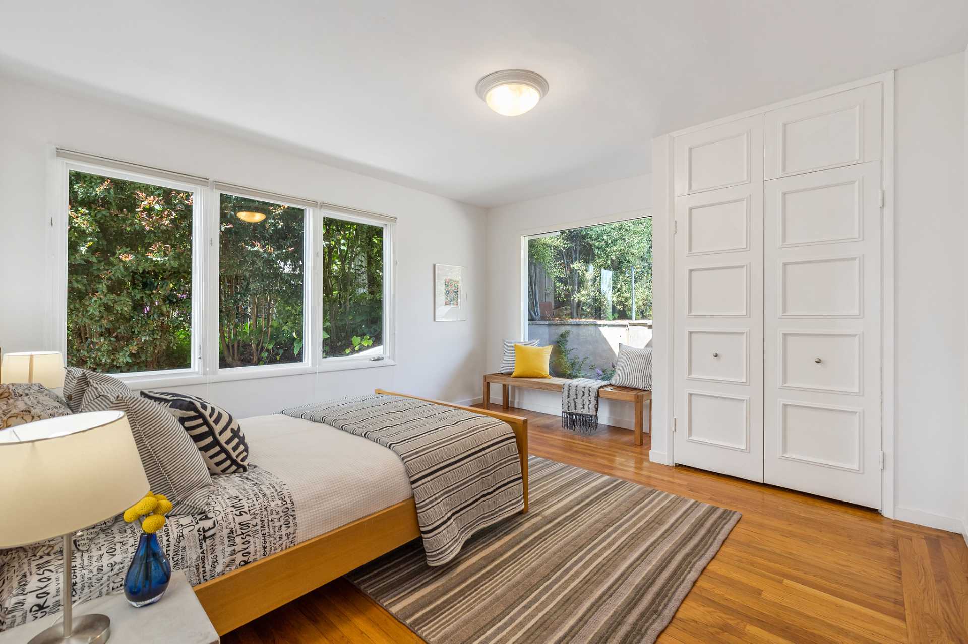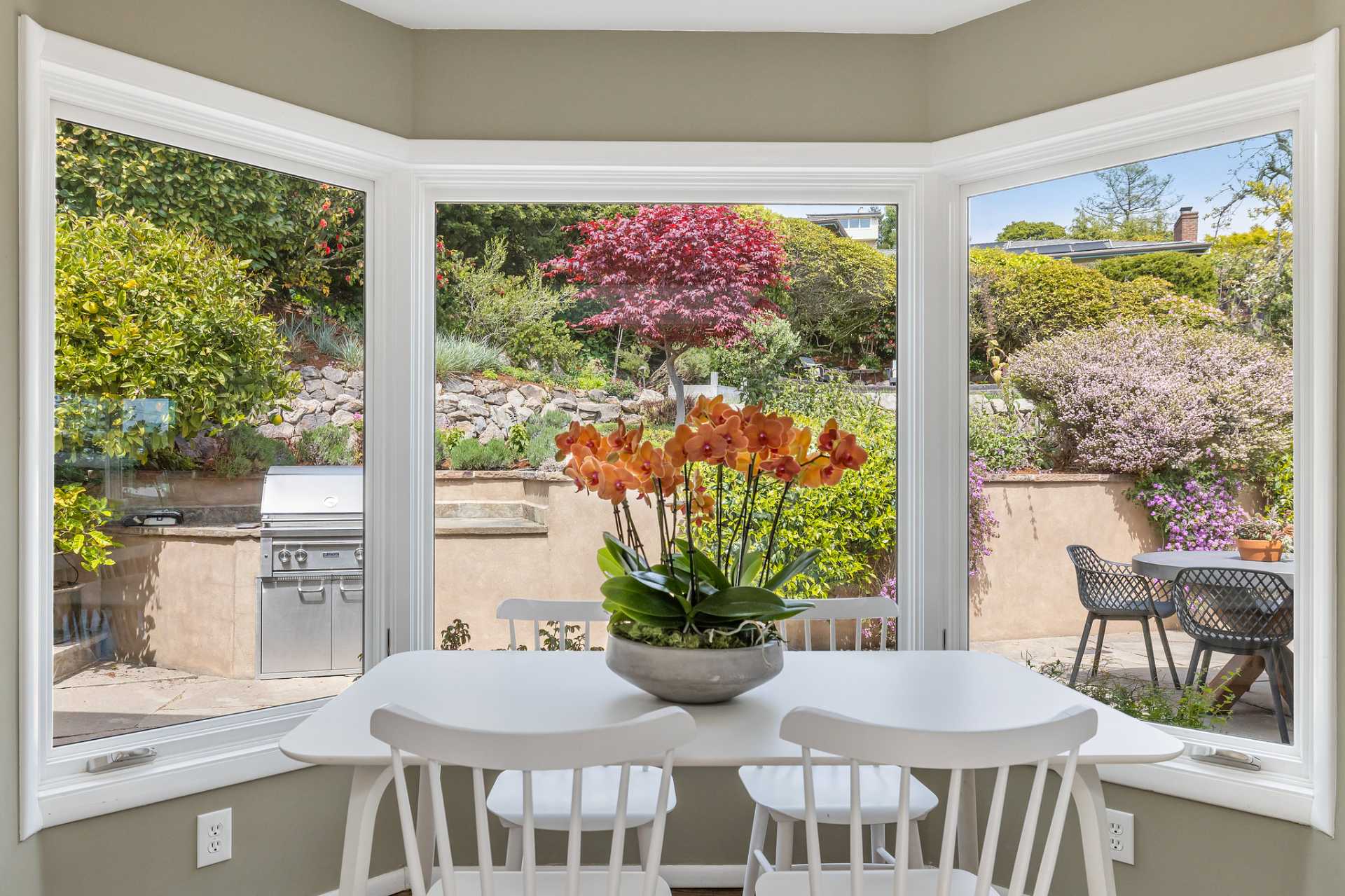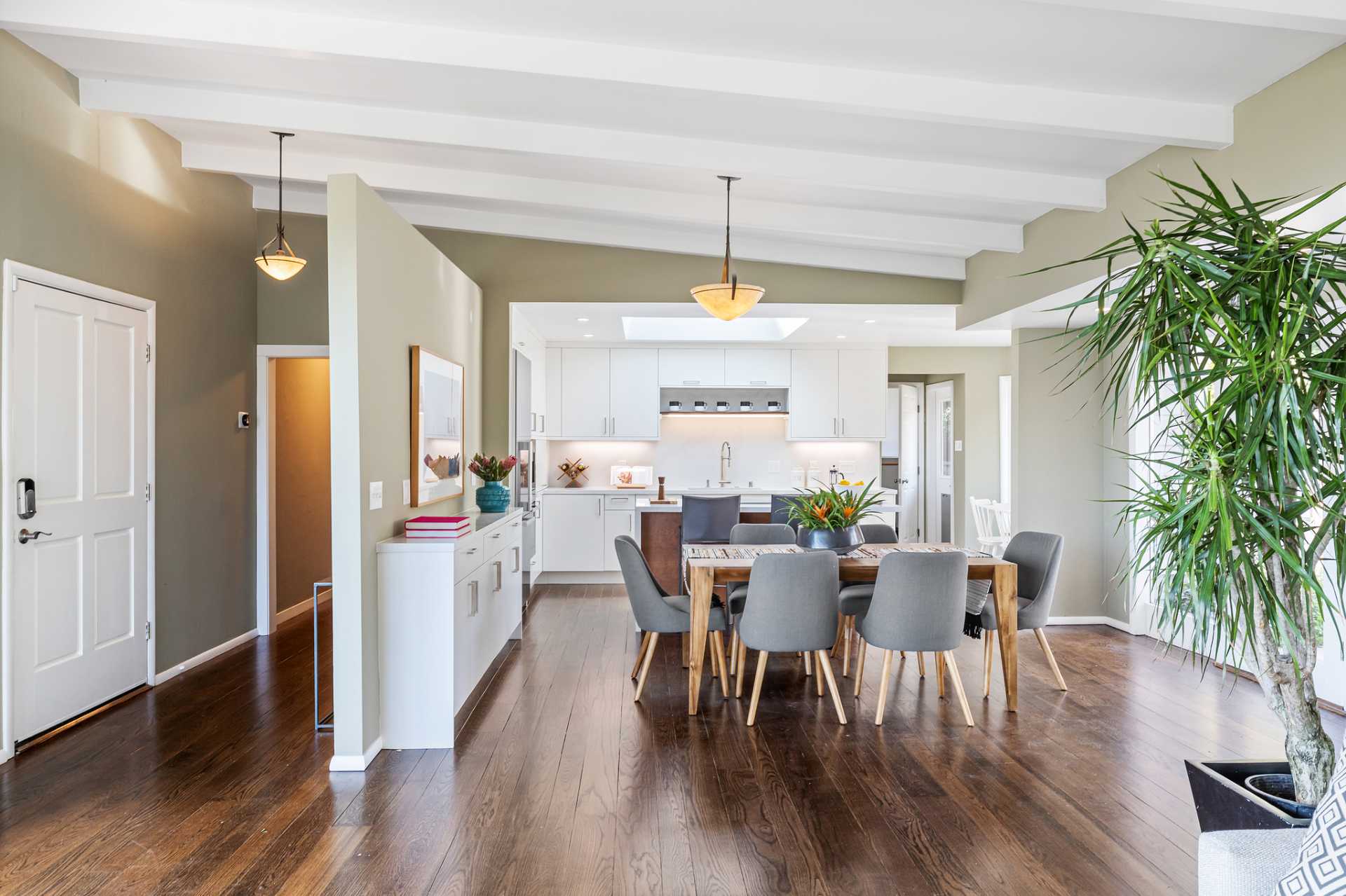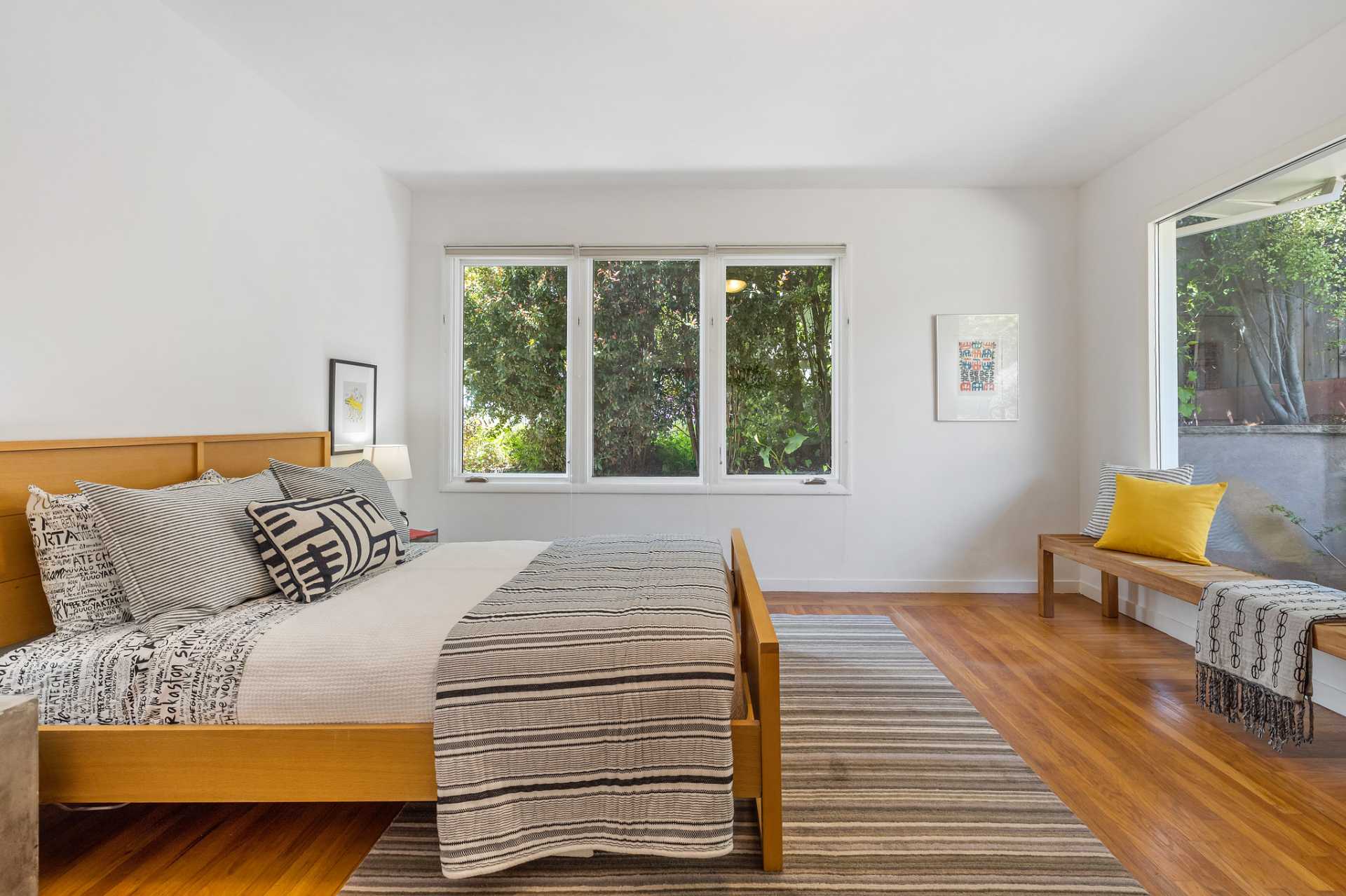 Privacy and views! A completely updated and re-imagined Mid-century 3-bedroom, 2-bathroom home with gorgeous gardens, all on one level in a wonderful Kensington neighborhood. This impeccably designed and stylish home is perched above the street, with sweeping views of San Francisco and the Bay. Vaulted beamed ceilings and oversized windows allow a flood of light into the living areas, the hardwood floors gleam, and a modern fireplace and built-in shelves anchor the living room. The open concept design brings natural flow from living room, to dining room, to kitchen, and the French doors off the dining room provide easy indoor/outdoor flow.