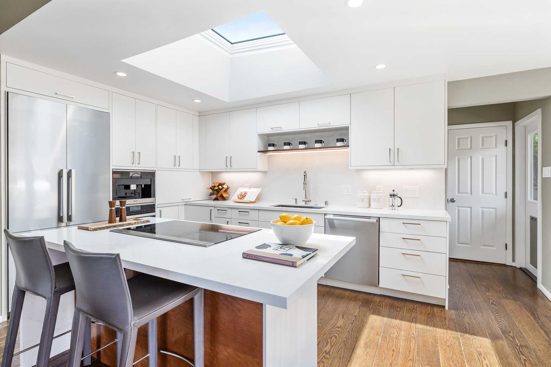 The state-of-the-art newly renovated kitchen features all Miele stainless appliances, including a steam oven and built-in coffee maker, quartz counters, an induction cooktop in the sleek chef’s island, and a walk-in pantry with custom storage.