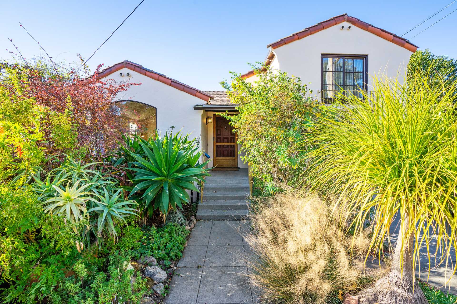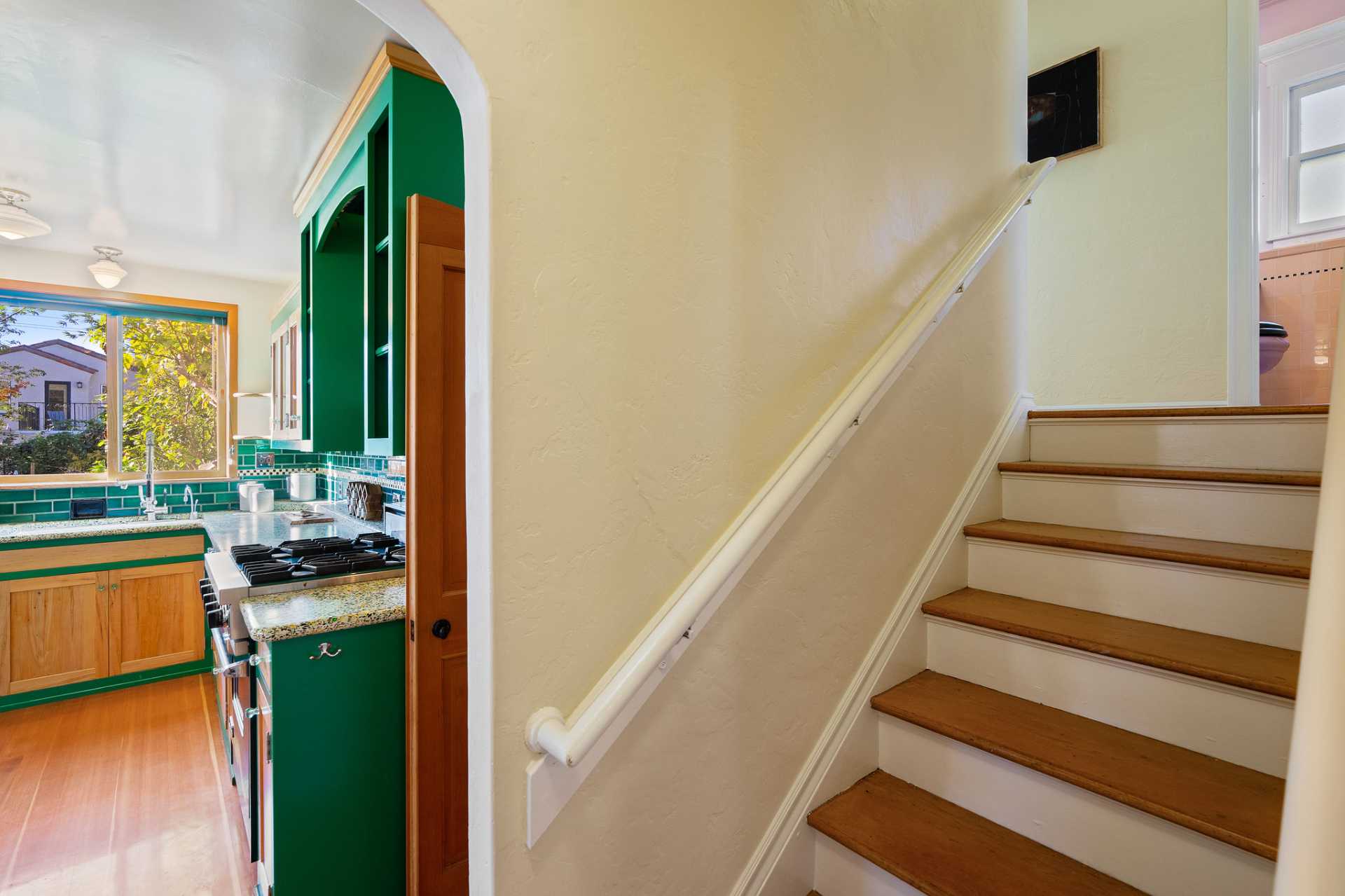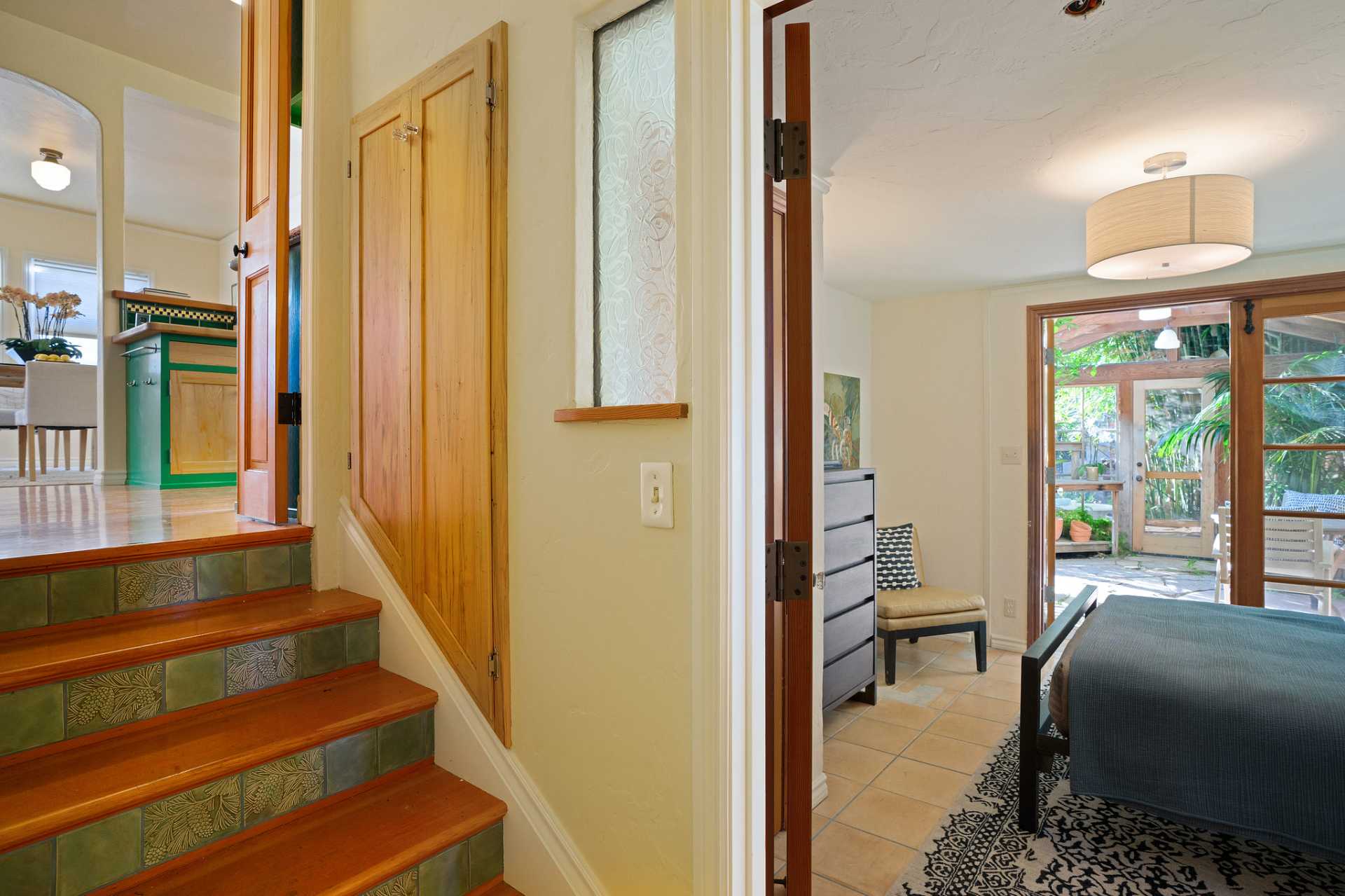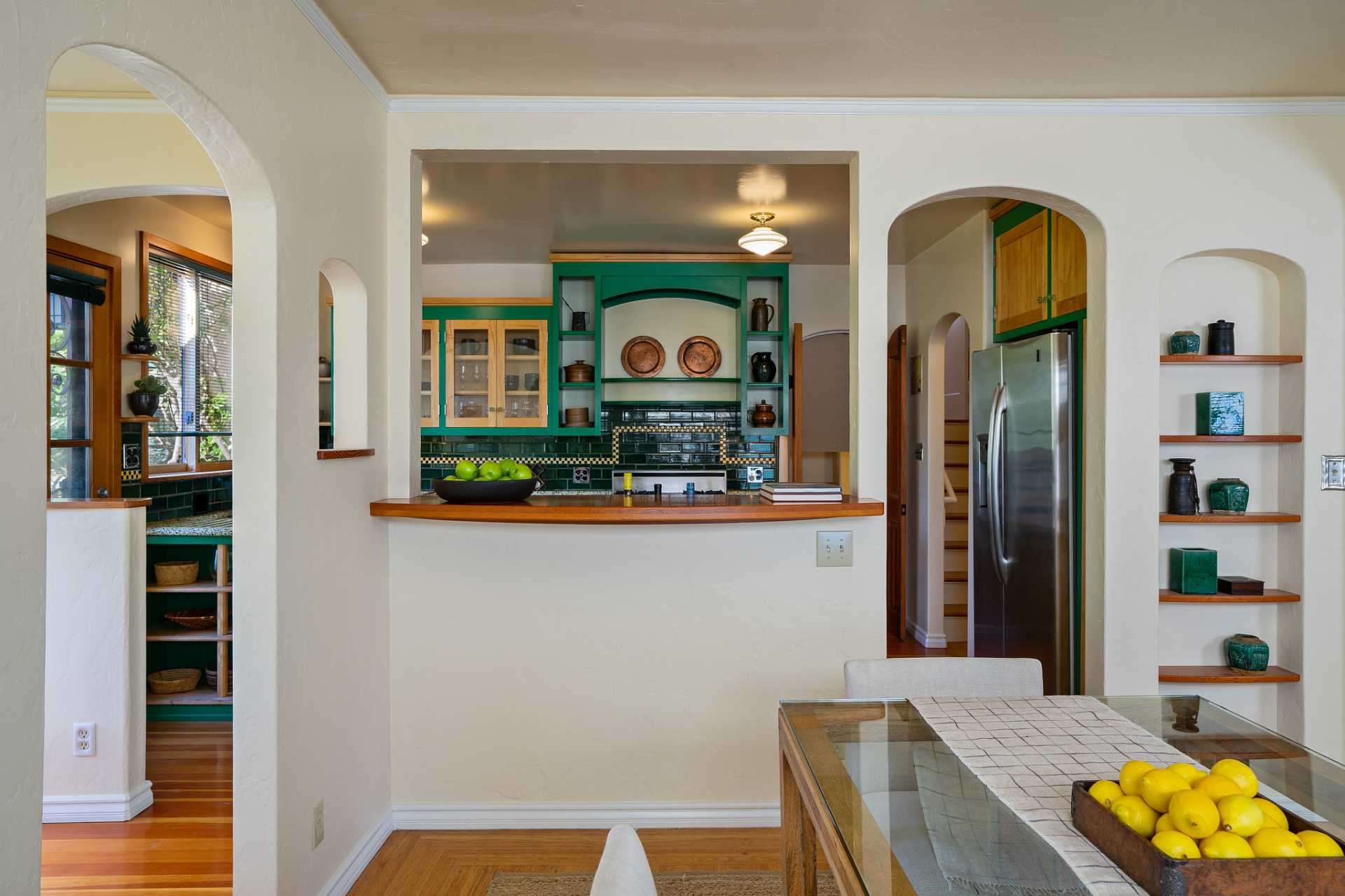 This sunny Mediterranean 1930s split-level home is the perfect retreat in the heart of Albany. You’ll feel miles away in this garden oasis, yet you can leave the car behind to explore nearby parks and playgrounds, the Kensington farmers’ market, and the lively shops and restaurants of Solano Avenue. A vintage 1930s MacGregor-built home, it has been lovingly maintained and upgraded while maintaining its authentic character. With two bright bedrooms upstairs, and a bedroom and dreamy greenhouse below, there is excellent separation of space. The gourmet kitchen is framed in original Vetrazzo counters with custom-spalted maple cabinets, and has a Viking range. It opens to the charming breakfast nook, deck, and an outdoor dining flagstone patio overlooking the garden. The interior is thoughtfully crafted with custom maple woodwork, coved ceilings, and built-in bookshelves. Vintage light fixtures, custom ceramic tiles, and other artistic touches create a unique and warm tone.