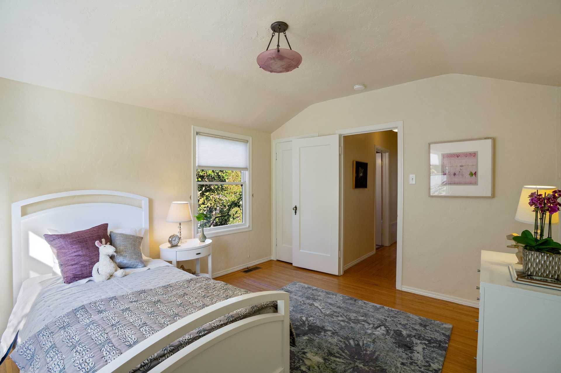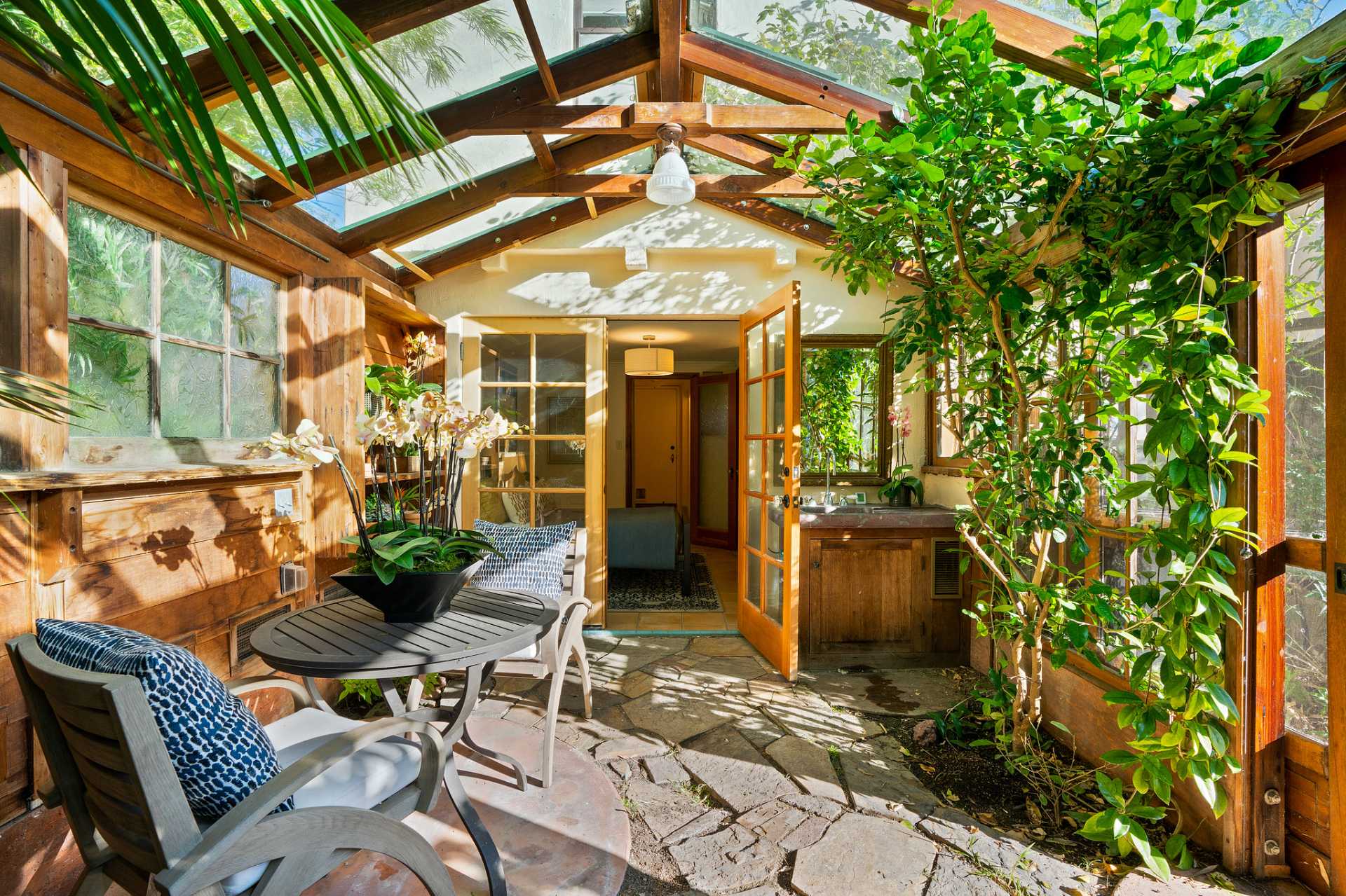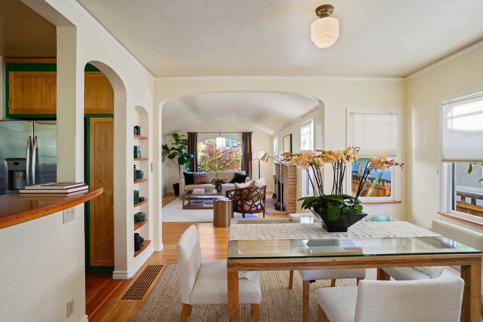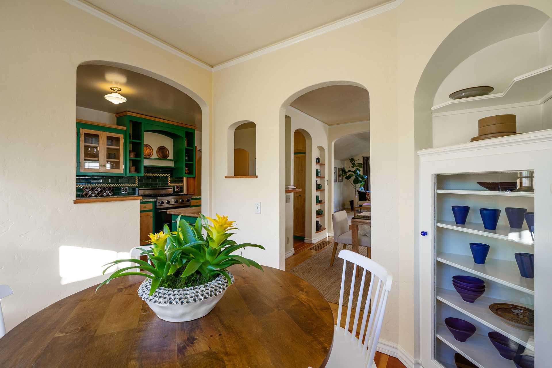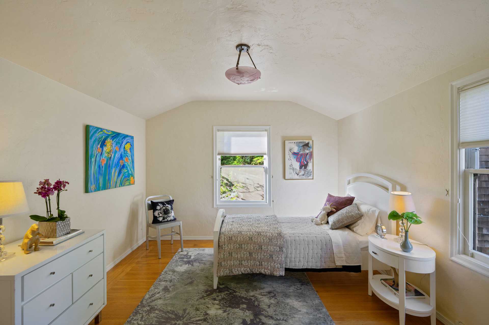 This sunny Mediterranean 1930s split-level home is the perfect retreat in the heart of Albany. You’ll feel miles away in this garden oasis, yet you can leave the car behind to explore nearby parks and playgrounds, the Kensington farmers’ market, and the lively shops and restaurants of Solano Avenue. A vintage 1930s MacGregor-built home, it has been lovingly maintained and upgraded while maintaining its authentic character. With two bright bedrooms upstairs, and a bedroom and dreamy greenhouse below, there is excellent separation of space. The gourmet kitchen is framed in original Vetrazzo counters with custom-spalted maple cabinets, and has a Viking range. It opens to the charming breakfast nook, deck, and an outdoor dining flagstone patio overlooking the garden. The interior is thoughtfully crafted with custom maple woodwork, coved ceilings, and built-in bookshelves. Vintage light fixtures, custom ceramic tiles, and other artistic touches create a unique and warm tone.