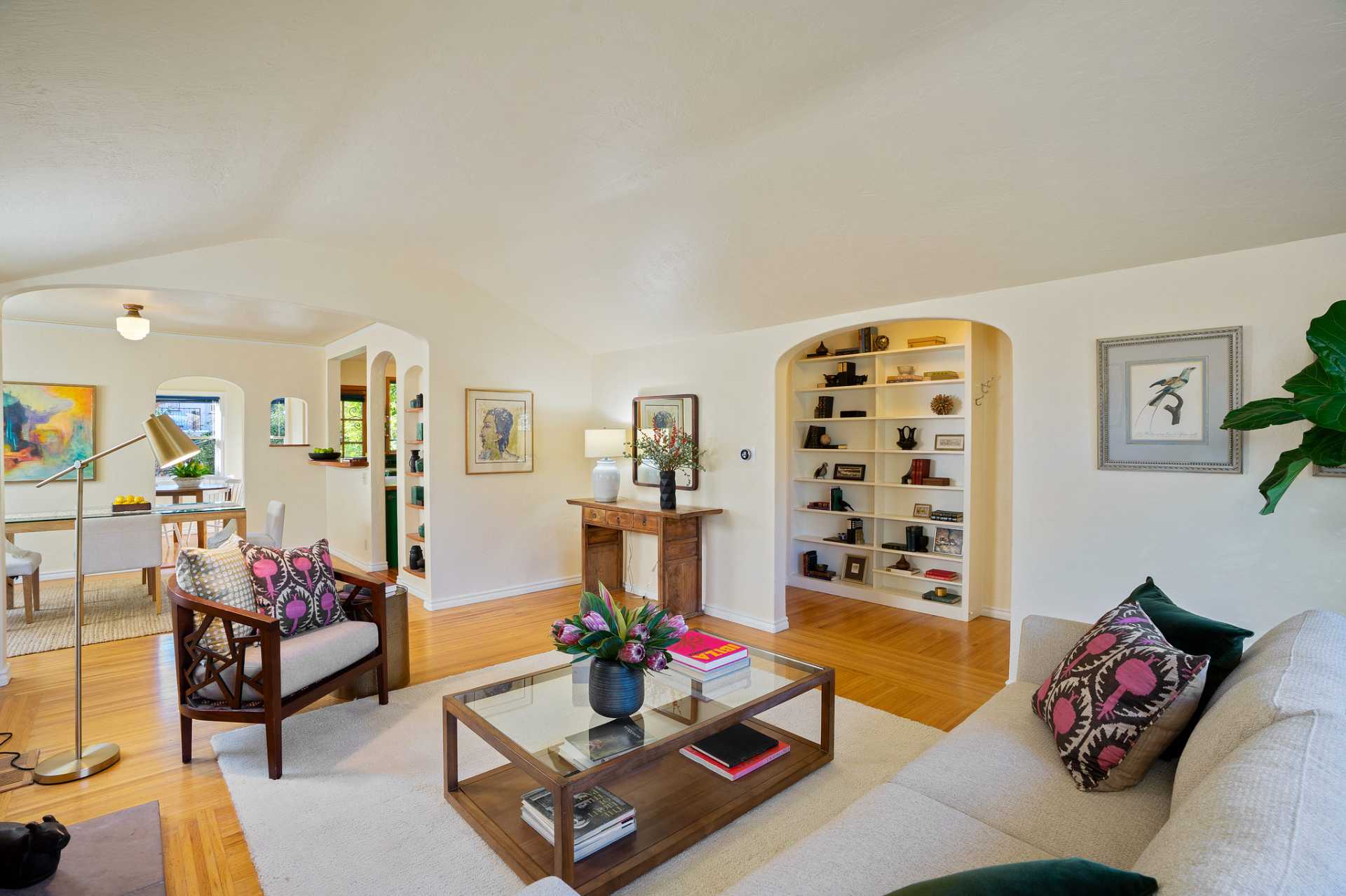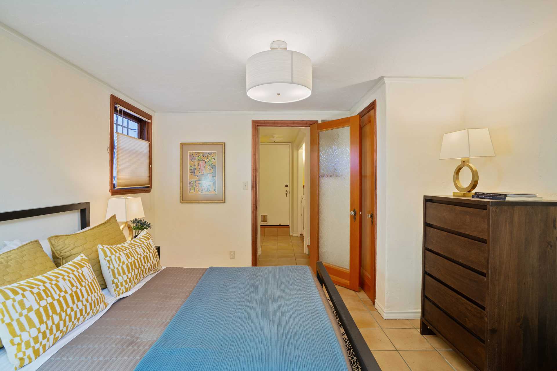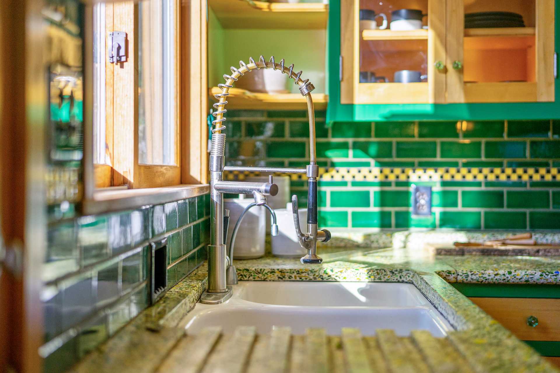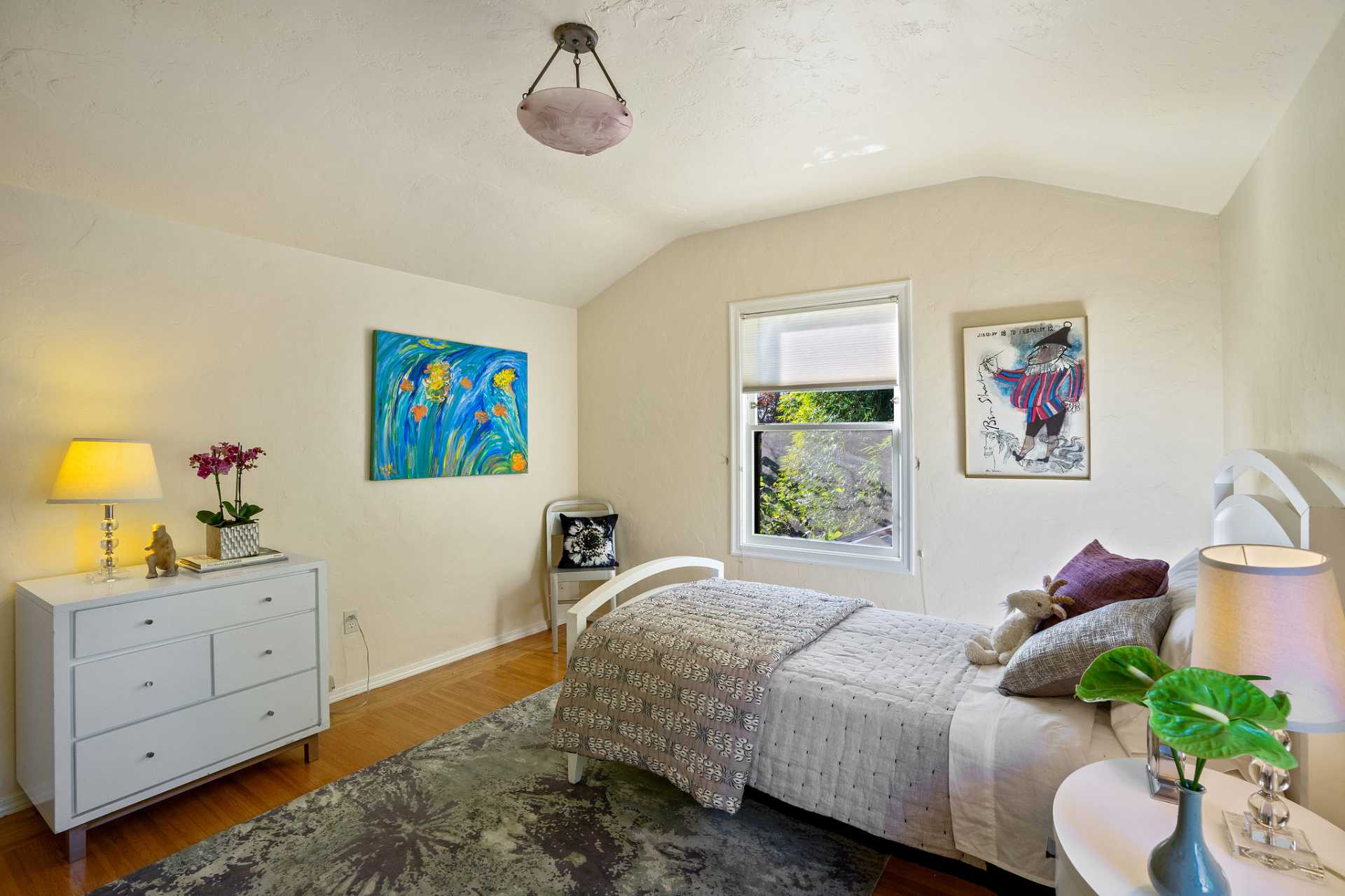 This sunny Mediterranean 1930s split-level home is the perfect retreat in the heart of Albany. You’ll feel miles away in this garden oasis, yet you can leave the car behind to explore nearby parks and playgrounds, the Kensington farmers’ market, and the lively shops and restaurants of Solano Avenue. A vintage 1930s MacGregor-built home, it has been lovingly maintained and upgraded while maintaining its authentic character. With two bright bedrooms upstairs, and a bedroom and dreamy greenhouse below, there is excellent separation of space. The gourmet kitchen is framed in original Vetrazzo counters with custom-spalted maple cabinets, and has a Viking range. It opens to the charming breakfast nook, deck, and an outdoor dining flagstone patio overlooking the garden. The interior is thoughtfully crafted with custom maple woodwork, coved ceilings, and built-in bookshelves. Vintage light fixtures, custom ceramic tiles, and other artistic touches create a unique and warm tone.