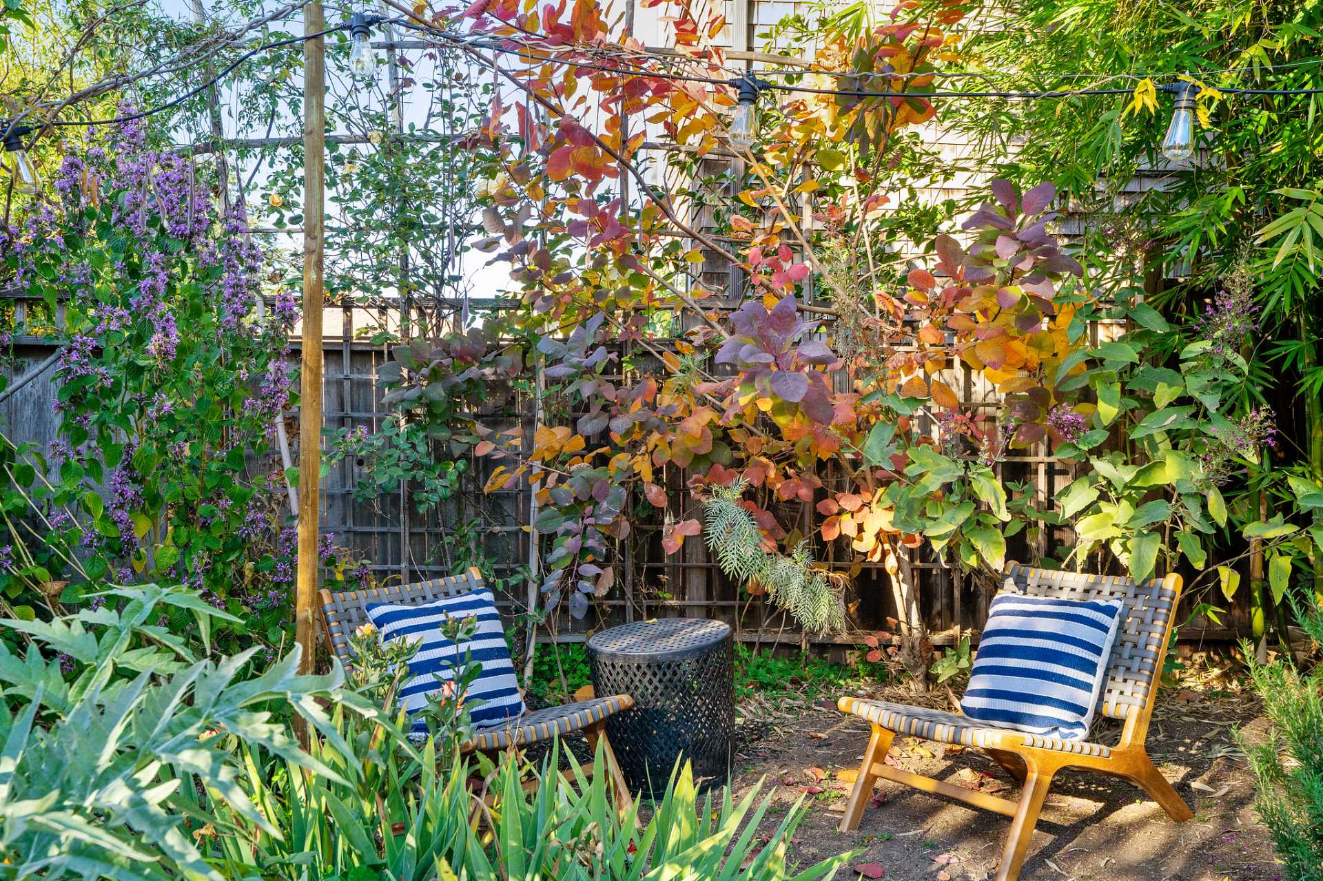 The magical garden is professionally-landscaped with over 160 species of California natives, apple, fig, lemon trees, and heirloom roses that weave between the outdoor clawfoot bathtub and custom-built Zen platform and sitting areas.