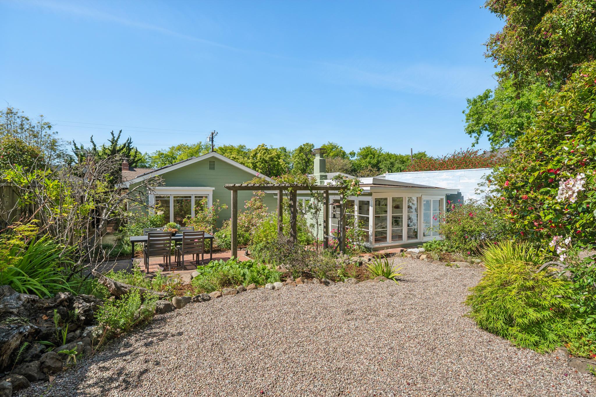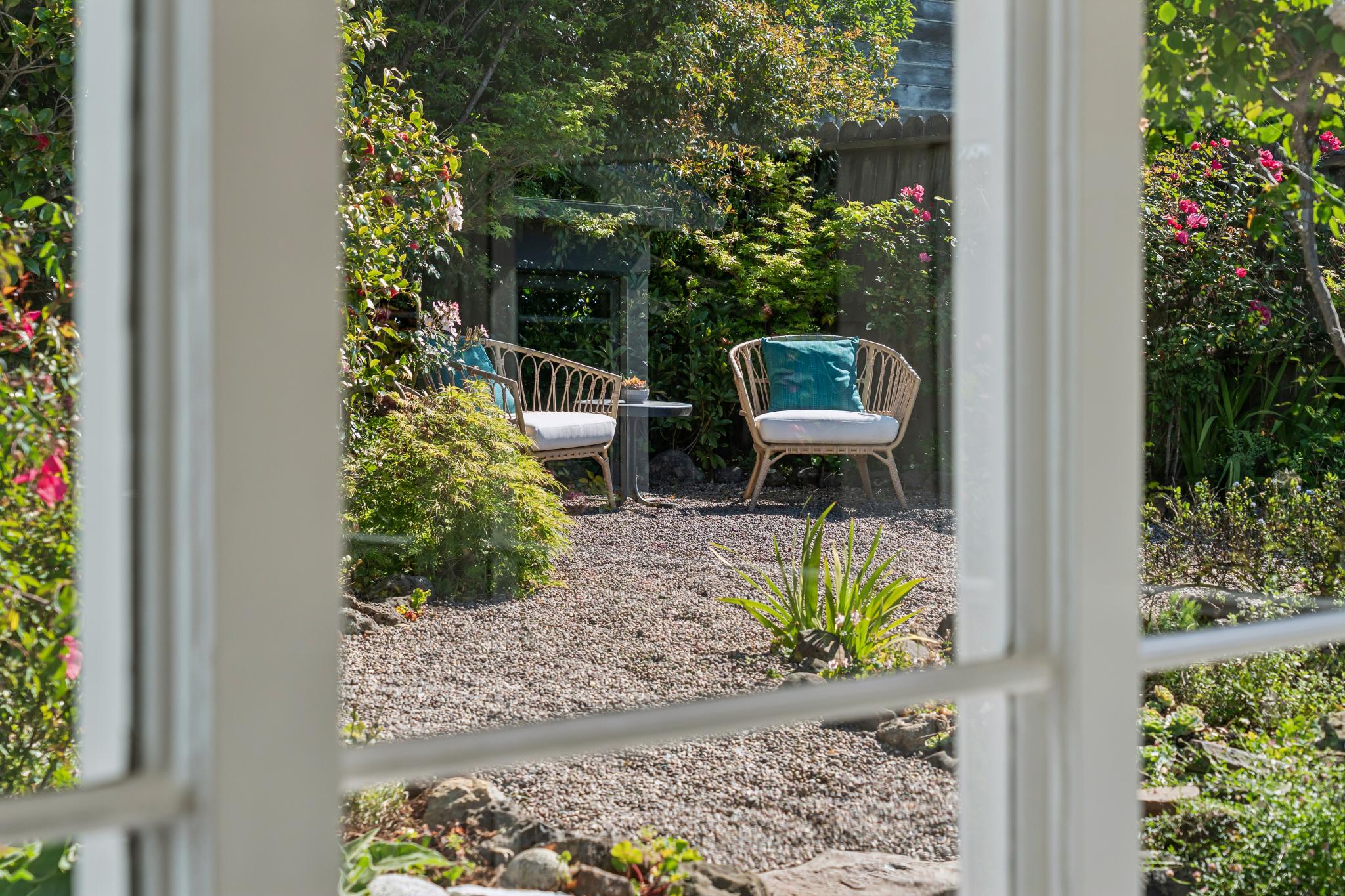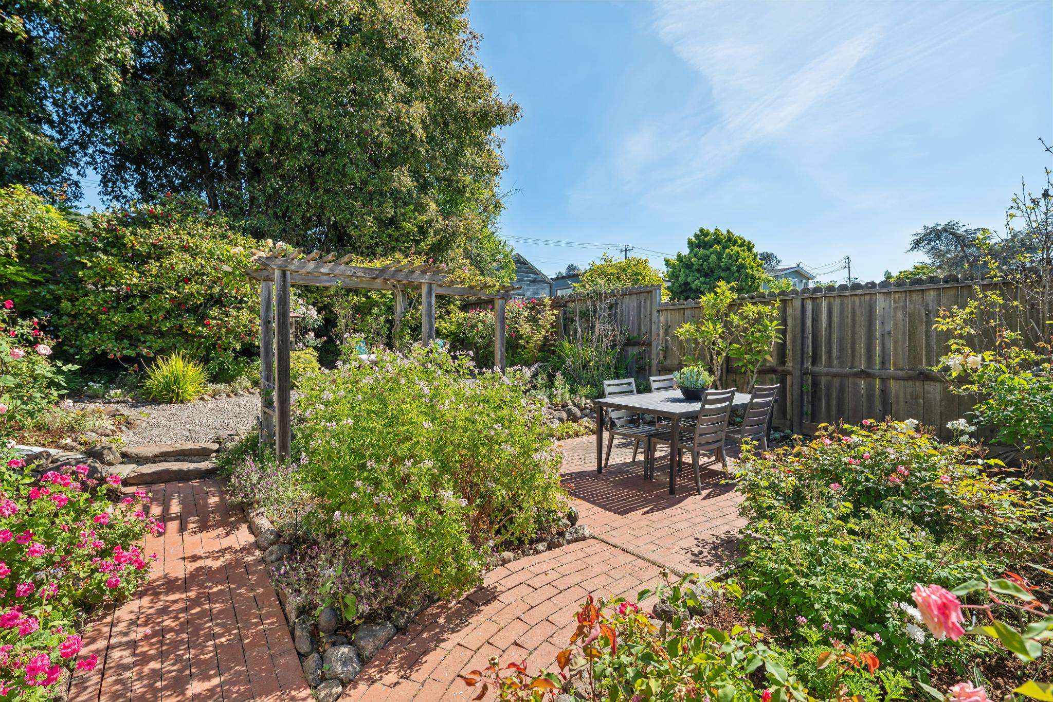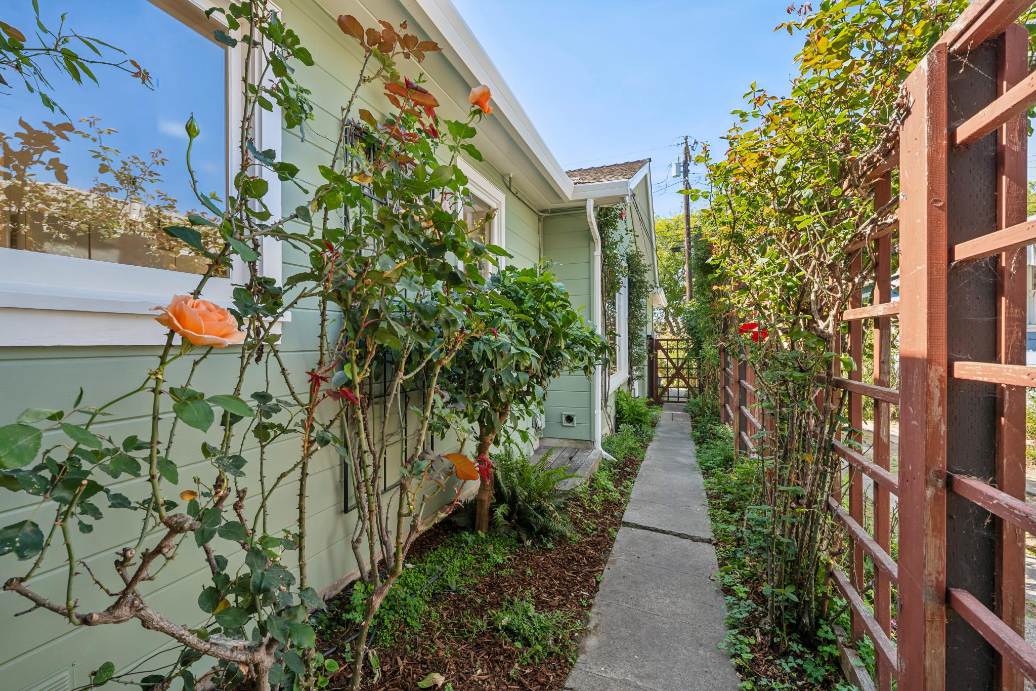From the sidewalk you enter the garden through a wooden gate and immediately you’re greeted by rambling soft yellow roses and flowering Wisteria vines. The covered porch provides a peaceful transition from the street into the tranquil home. Windows with views to the garden can be found in every room. The gracious living room and dining room are generously sized to comfortably gather with friends and family. A sweet vintage tiled kitchen has direct access to the back porch and meandering garden. Two light-filled bedrooms down the hallway and charming original tiles in the bathroom add to the enchanting character of the home. The primary bedroom has a large garden window connecting the room to the idyllic backyard. Just through the kitchen door on your way to the garden, you can’t miss the garden cottage, with 2 window-filled walls and a fireplace, it’s the perfect spot for art or play come rain or shine. Measuring 286sf, this bonus space invites your imagination.