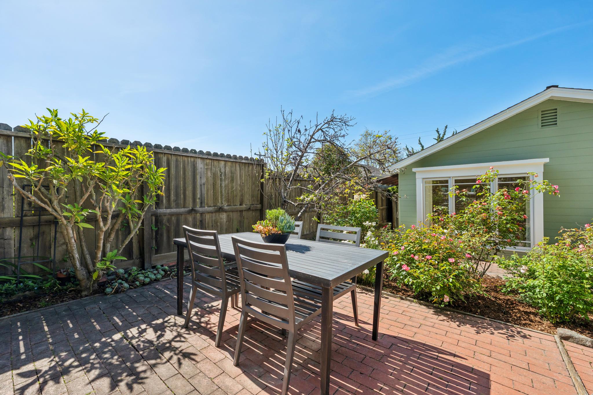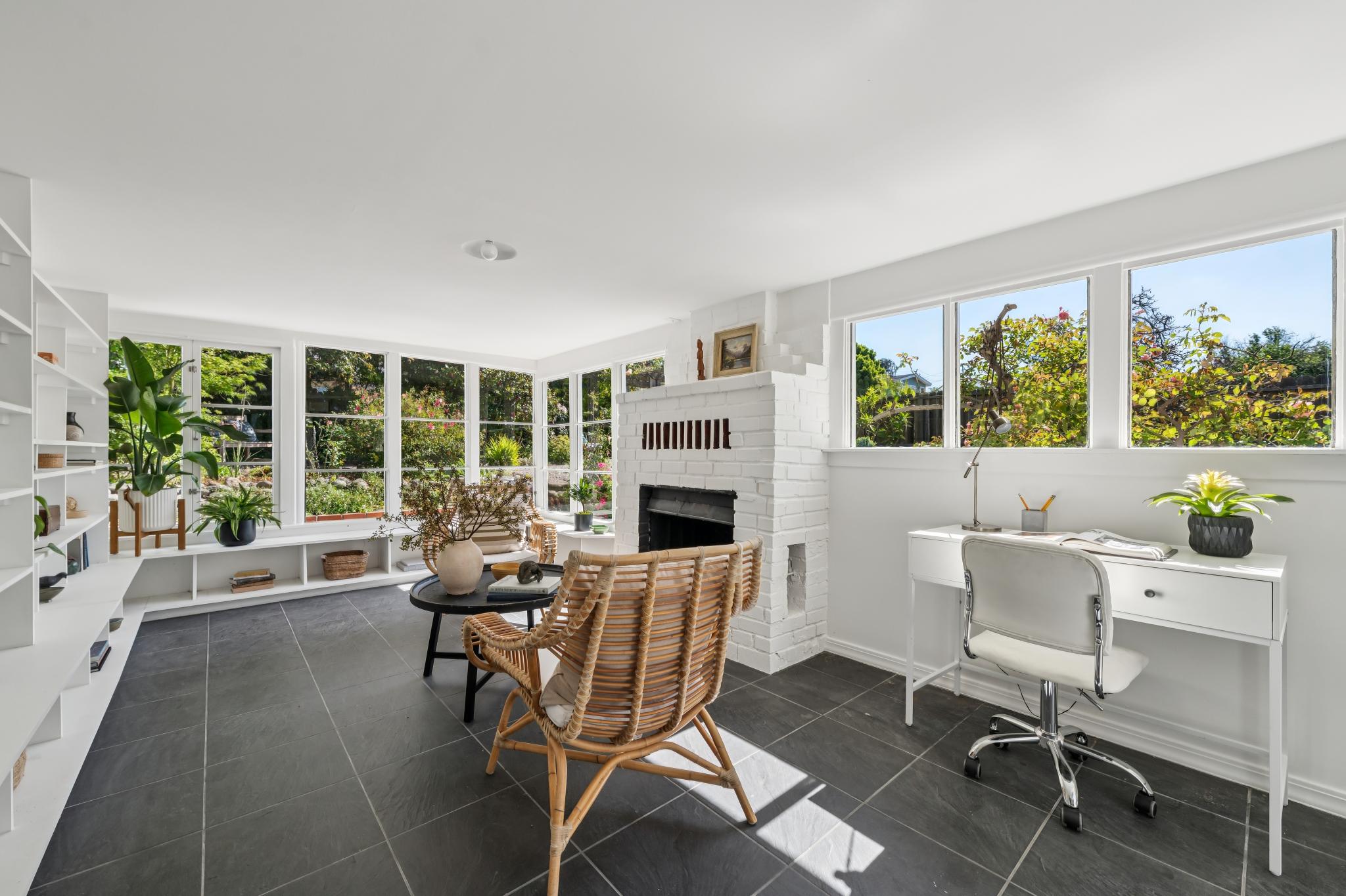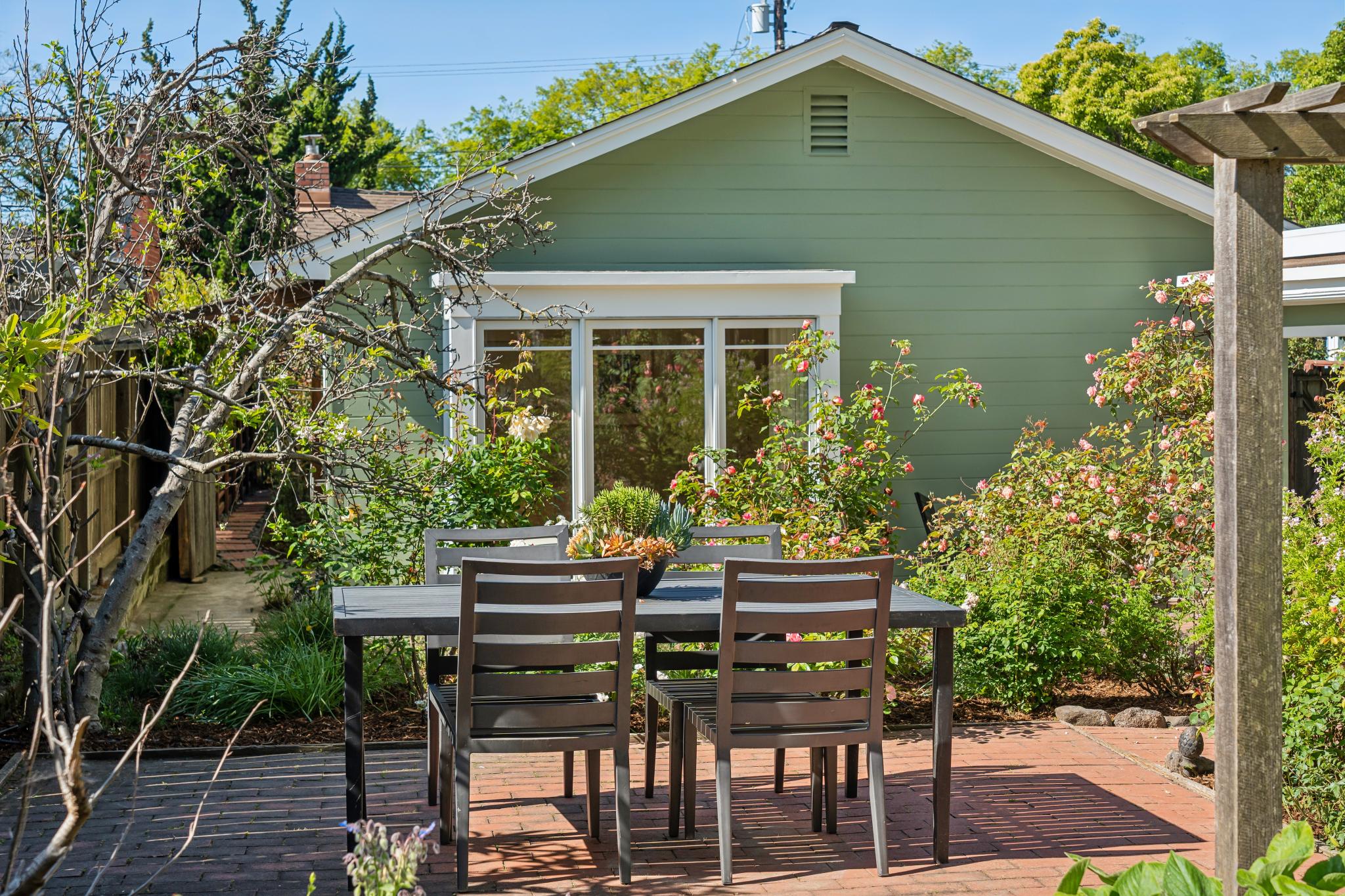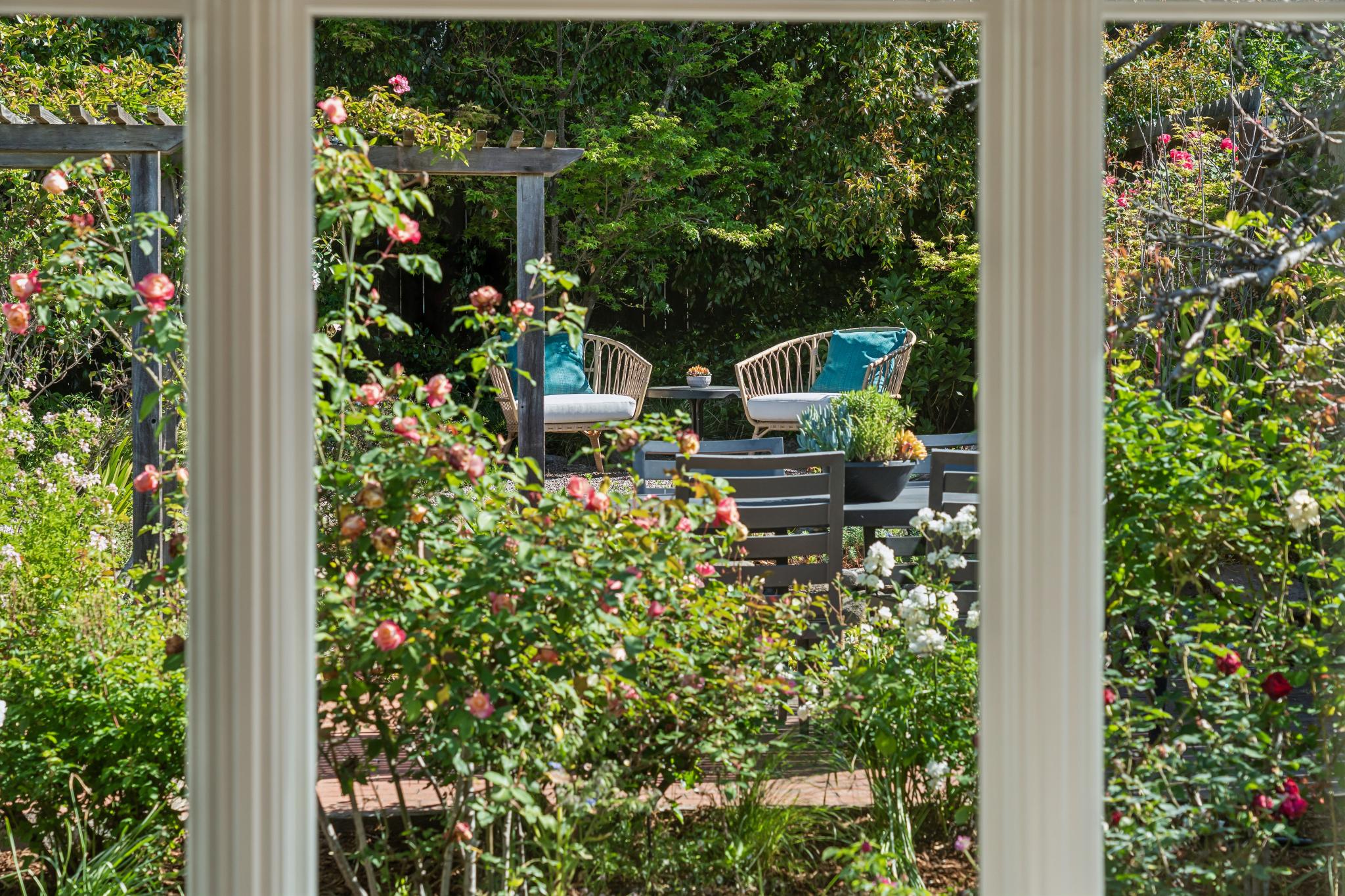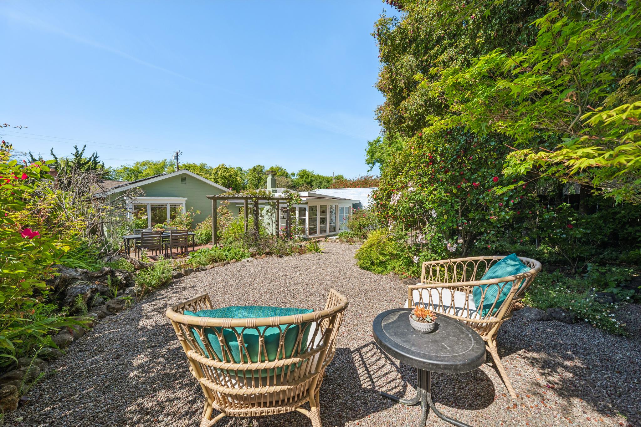 From the sidewalk you enter the garden through a wooden gate and immediately you’re greeted by rambling soft yellow roses and flowering Wisteria vines. The covered porch provides a peaceful transition from the street into the tranquil home. Windows with views to the garden can be found in every room. The gracious living room and dining room are generously sized to comfortably gather with friends and family. A sweet vintage tiled kitchen has direct access to the back porch and meandering garden. Two light-filled bedrooms down the hallway and charming original tiles in the bathroom add to the enchanting character of the home. The primary bedroom has a large garden window connecting the room to the idyllic backyard. Just through the kitchen door on your way to the garden, you can’t miss the garden cottage, with 2 window-filled walls and a fireplace, it’s the perfect spot for art or play come rain or shine. Measuring 286sf, this bonus space invites your imagination.