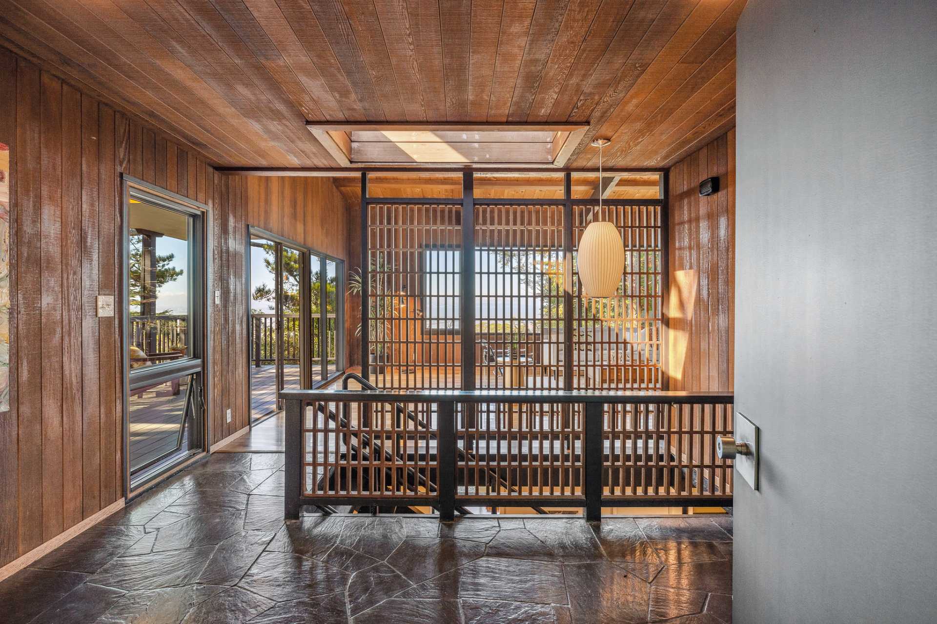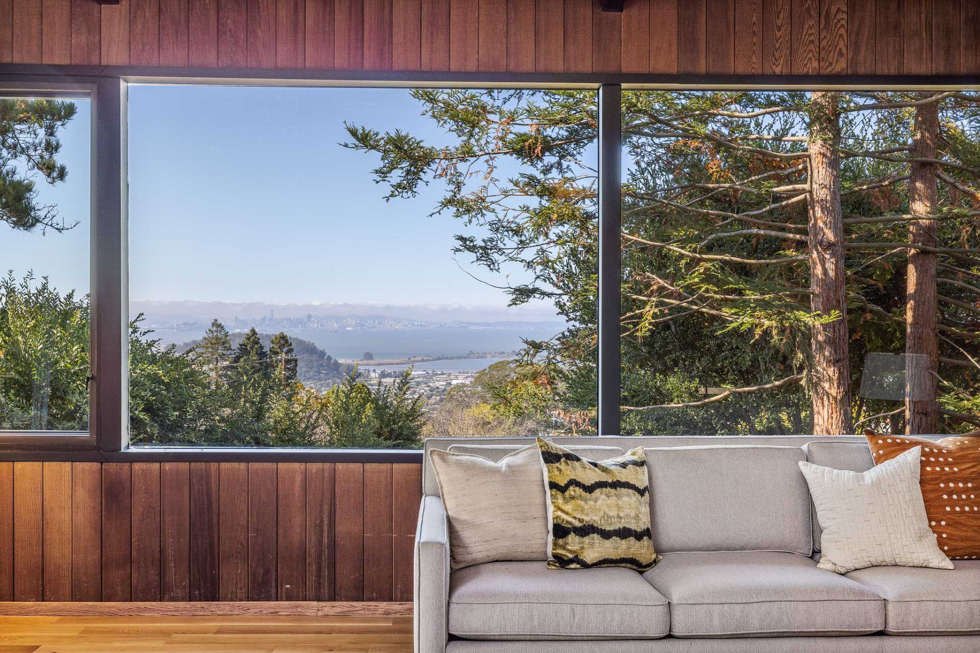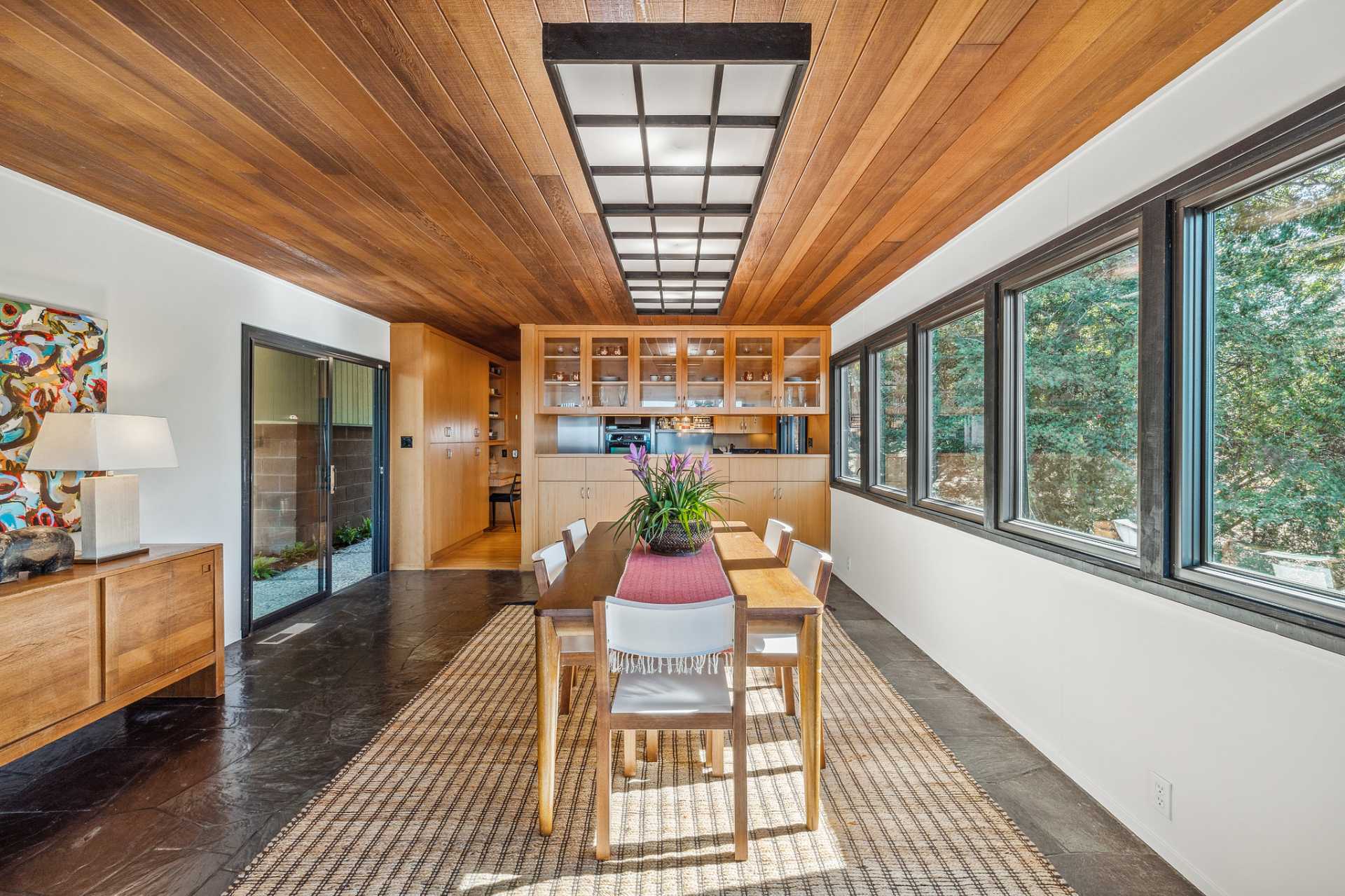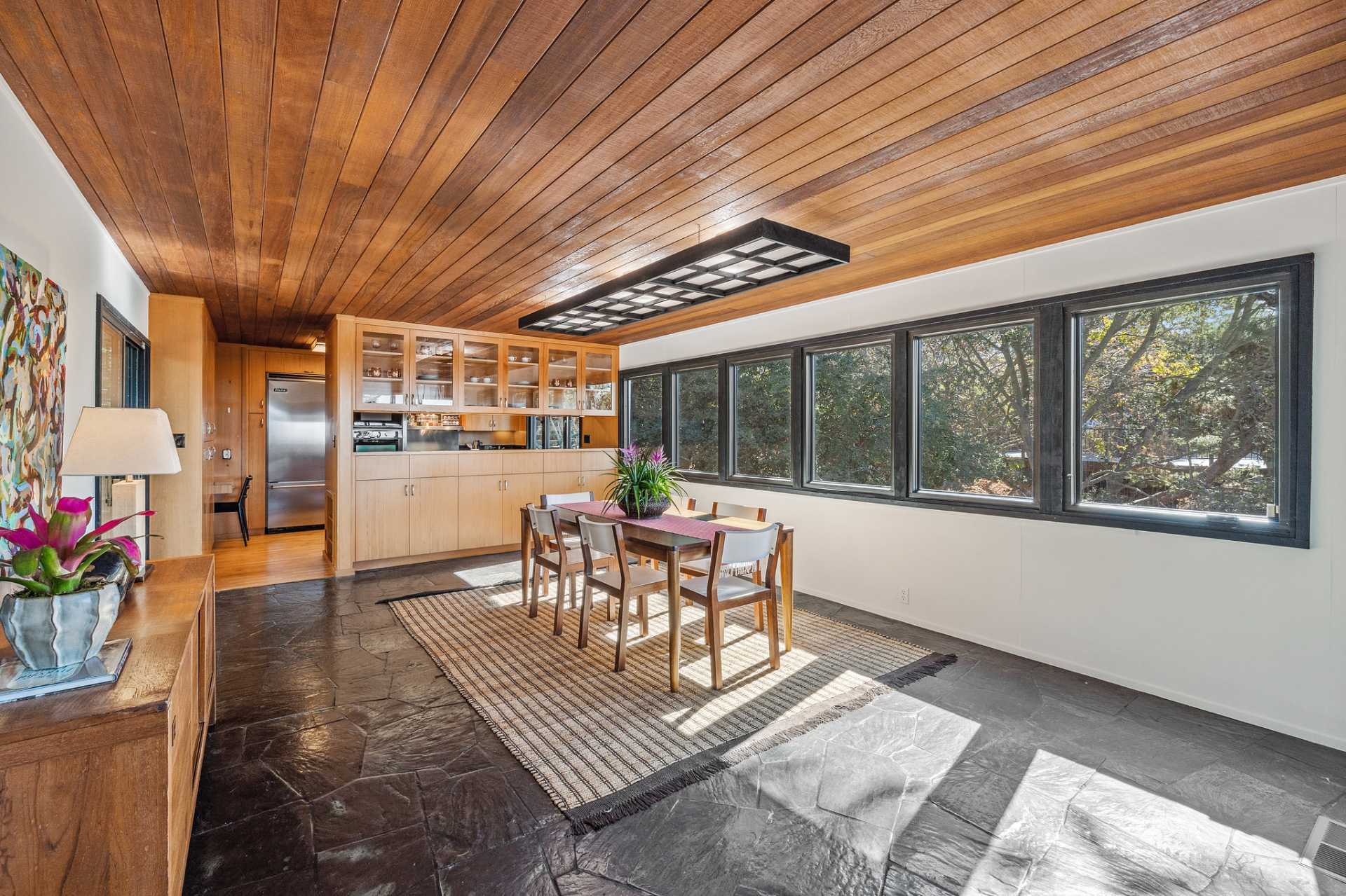 Located on a secret cul-de-sac in the El Cerrito Hills, you enter this exceptional home through a private courtyard into a welcoming foyer with light from the floor-to-ceiling windows drawing you in. The iconic Mid- century design creates a relaxing yet dramatic atmosphere, as you are surrounded by wood, black slate tile, vaulted ceilings, and stunning views of San Francisco and the Bay. The living room is grounded by the impressive fireplace and slate hearth, the perfect spot for gatherings or simply to enjoy a good book. There is an adjacent library with pocket doors for creating a private space. There are also sliding doors out to a large deck from both the living room and dining room. This is a home designed to entertain with a cook’s kitchen featuring beautiful cabinetry, lots of storage, a Viking six-burner range, double ovens, Bosch dishwasher, Viking bottom freezer refrigerator, and a pass-through with built-in china cabinets opening to the spacious dining room. You feel as if you are miles away from it all, and partly this is because there is a large separate parcel adjacent to the property, graced with mature trees and the occasional deer, that is included with the sale.