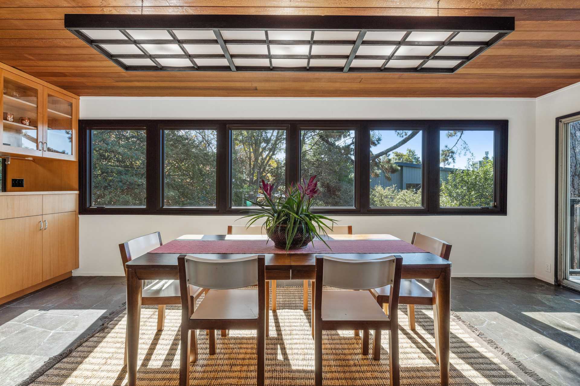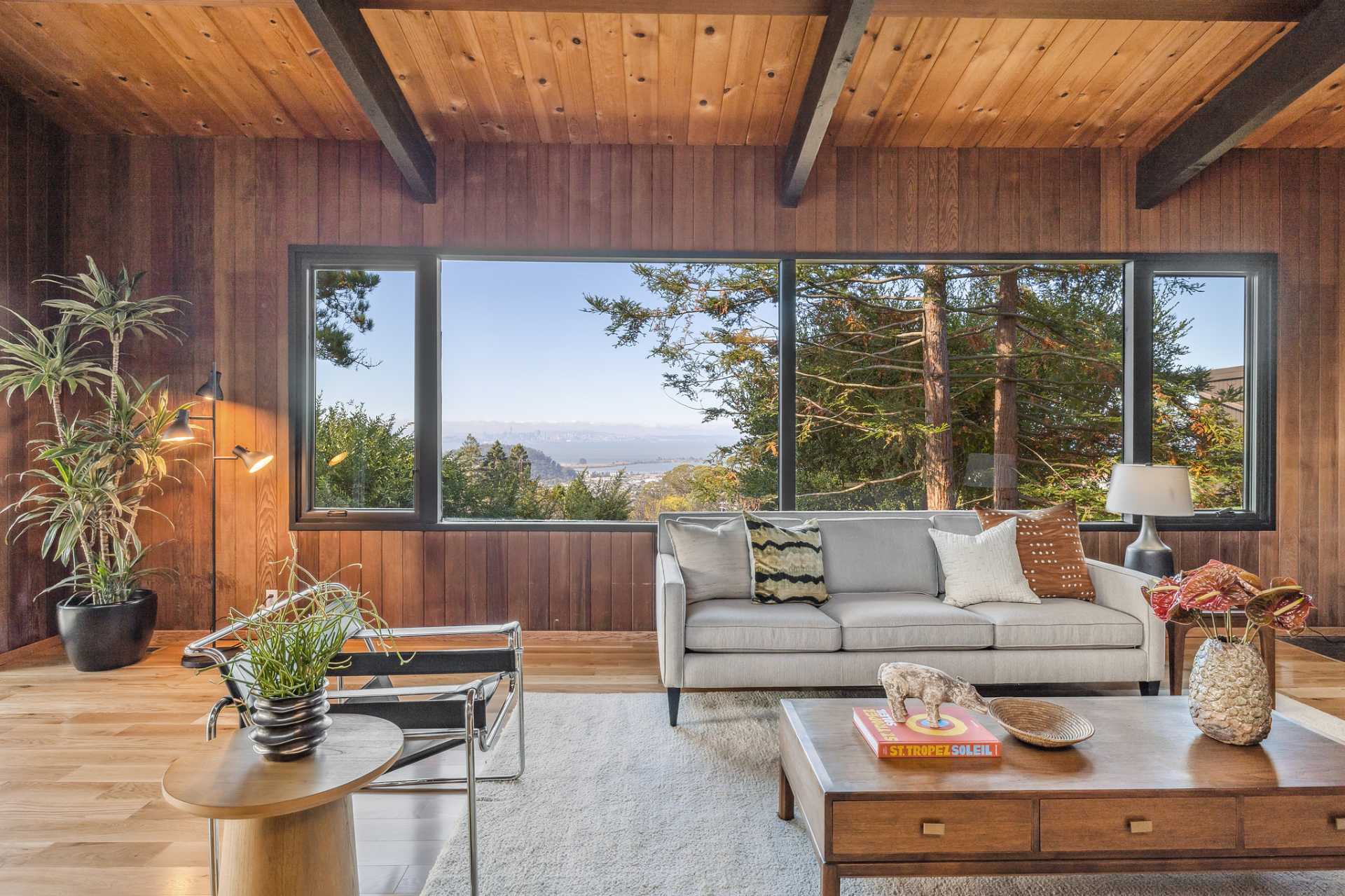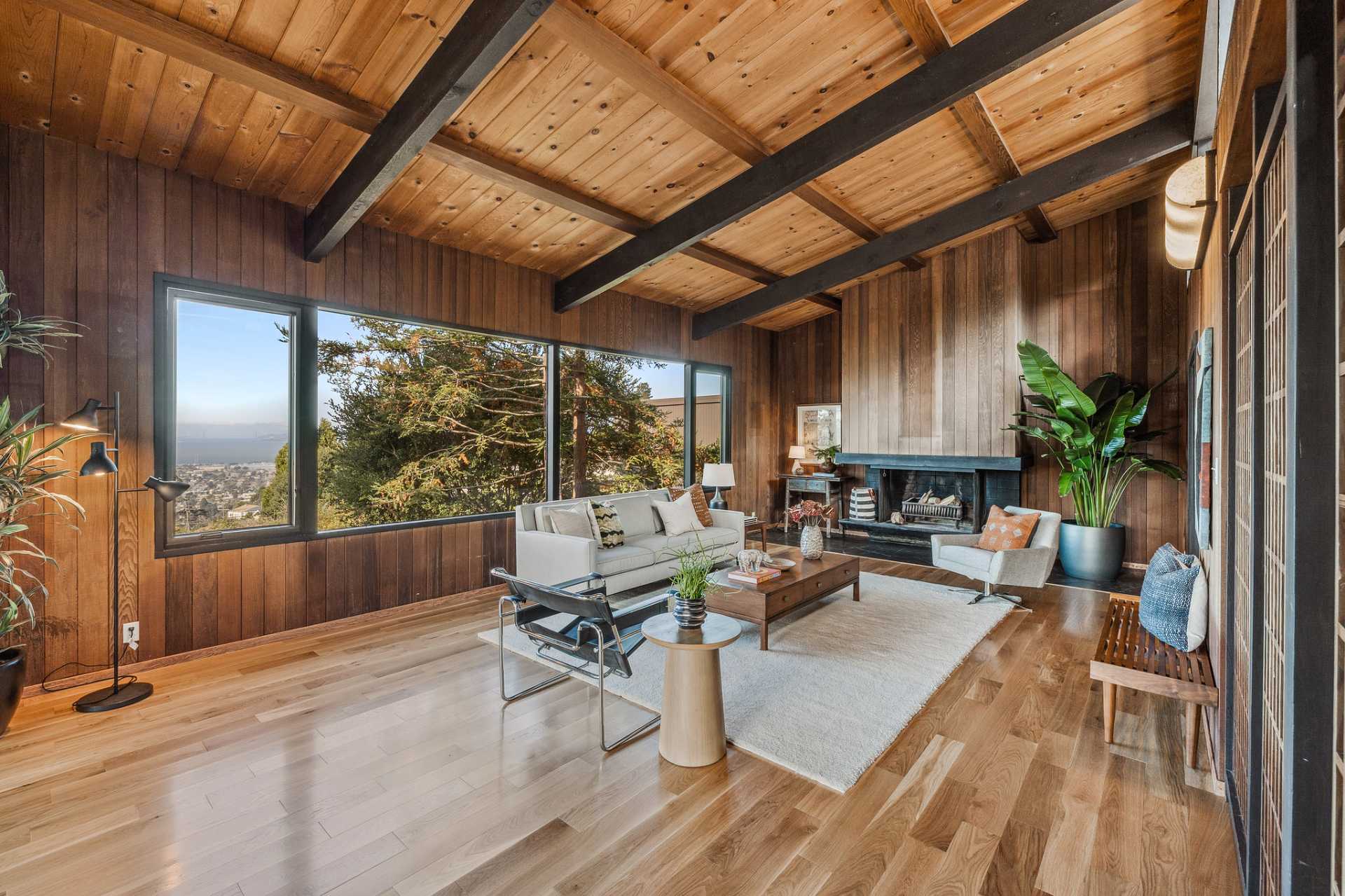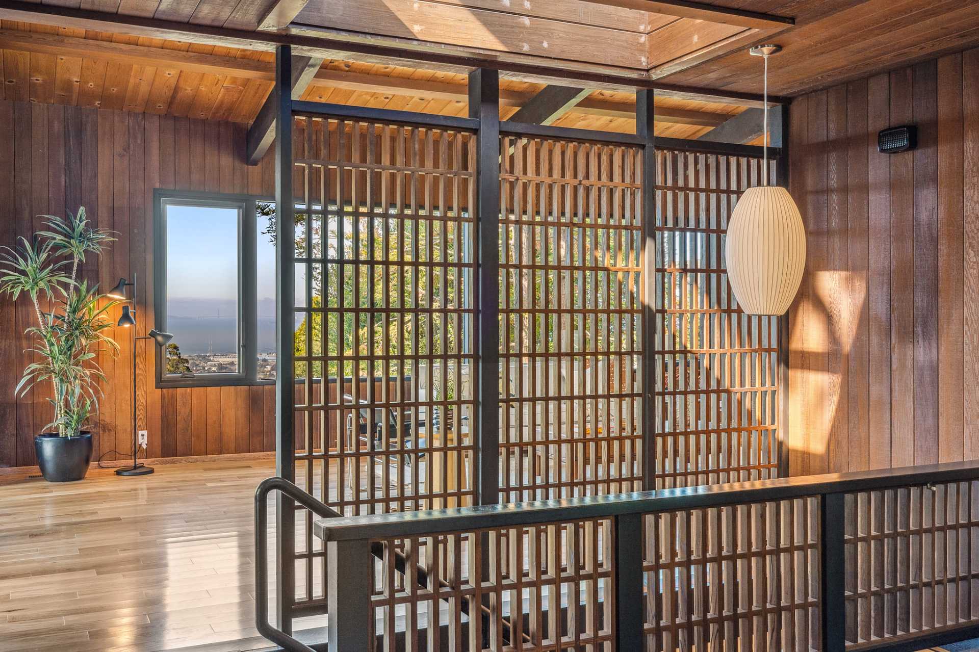 Located on a secret cul-de-sac in the El Cerrito Hills, you enter this exceptional home through a private courtyard into a welcoming foyer with light from the floor-to-ceiling windows drawing you in. The iconic Mid- century design creates a relaxing yet dramatic atmosphere, as you are surrounded by wood, black slate tile, vaulted ceilings, and stunning views of San Francisco and the Bay. The living room is grounded by the impressive fireplace and slate hearth, the perfect spot for gatherings or simply to enjoy a good book. There is an adjacent library with pocket doors for creating a private space. There are also sliding doors out to a large deck from both the living room and dining room. This is a home designed to entertain with a cook’s kitchen featuring beautiful cabinetry, lots of storage, a Viking six-burner range, double ovens, Bosch dishwasher, Viking bottom freezer refrigerator, and a pass-through with built-in china cabinets opening to the spacious dining room. You feel as if you are miles away from it all, and partly this is because there is a large separate parcel adjacent to the property, graced with mature trees and the occasional deer, that is included with the sale.