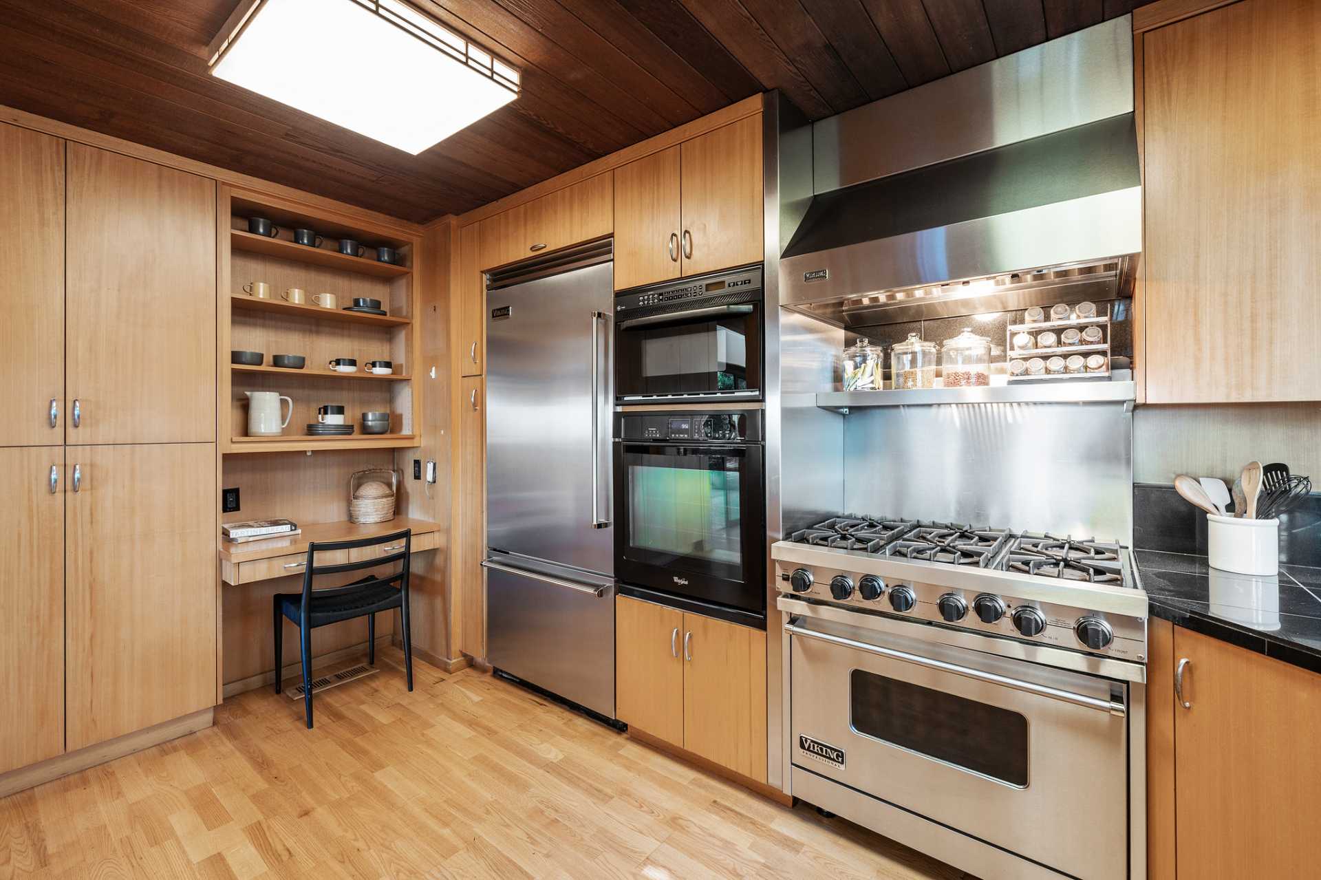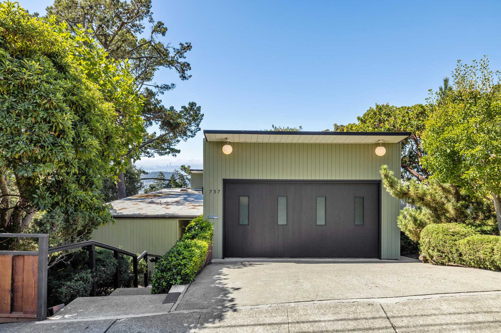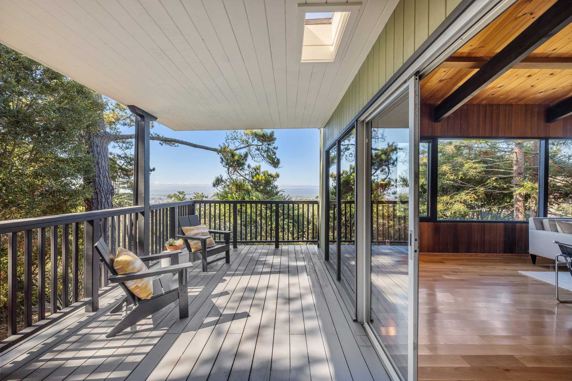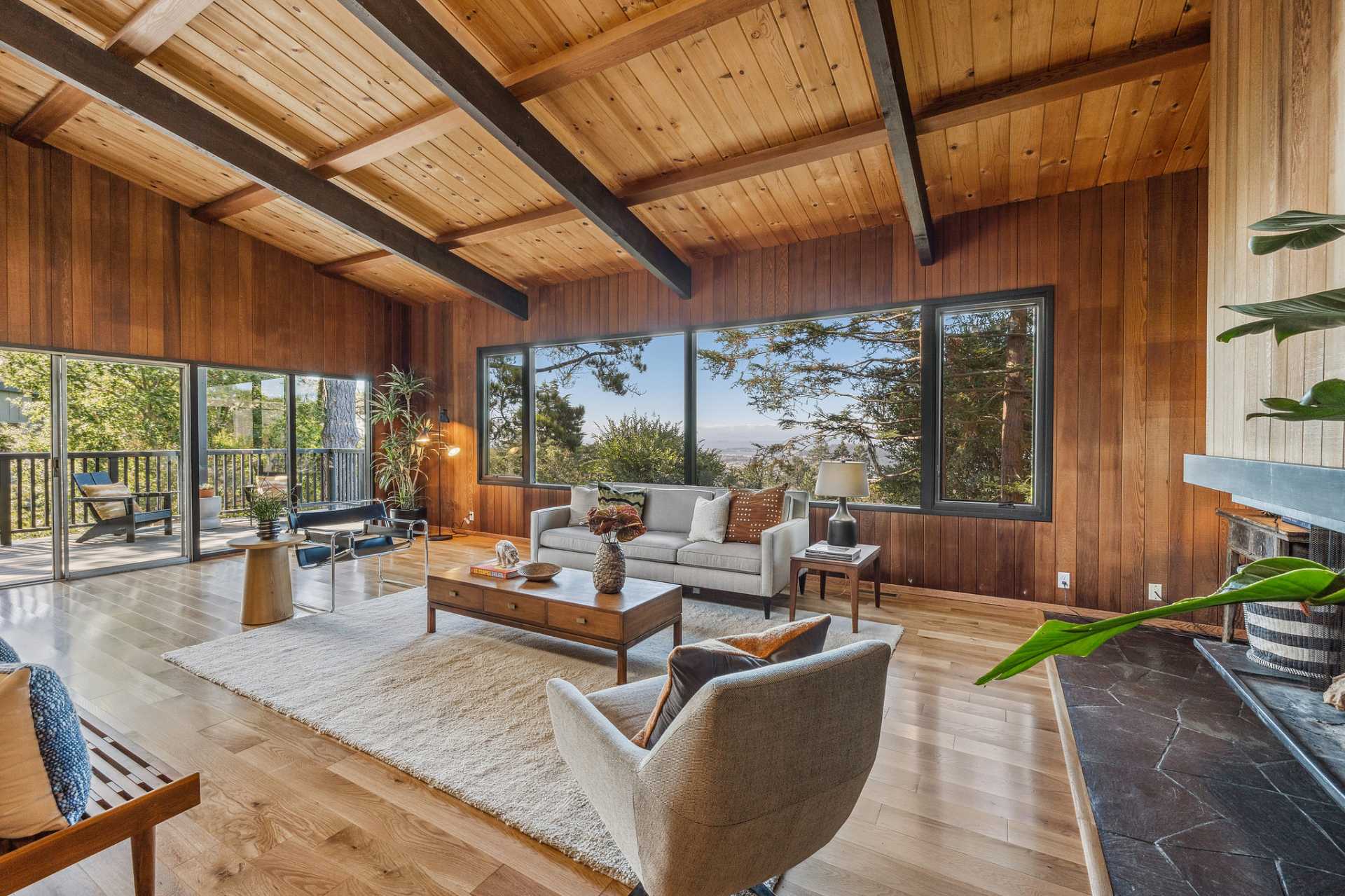 Located on a secret cul-de-sac in the El Cerrito Hills, you enter this exceptional home through a private courtyard into a welcoming foyer with light from the floor-to-ceiling windows drawing you in. The iconic Mid- century design creates a relaxing yet dramatic atmosphere, as you are surrounded by wood, black slate tile, vaulted ceilings, and stunning views of San Francisco and the Bay. The living room is grounded by the impressive fireplace and slate hearth, the perfect spot for gatherings or simply to enjoy a good book. There is an adjacent library with pocket doors for creating a private space. There are also sliding doors out to a large deck from both the living room and dining room. This is a home designed to entertain with a cook’s kitchen featuring beautiful cabinetry, lots of storage, a Viking six-burner range, double ovens, Bosch dishwasher, Viking bottom freezer refrigerator, and a pass-through with built-in china cabinets opening to the spacious dining room. You feel as if you are miles away from it all, and partly this is because there is a large separate parcel adjacent to the property, graced with mature trees and the occasional deer, that is included with the sale.