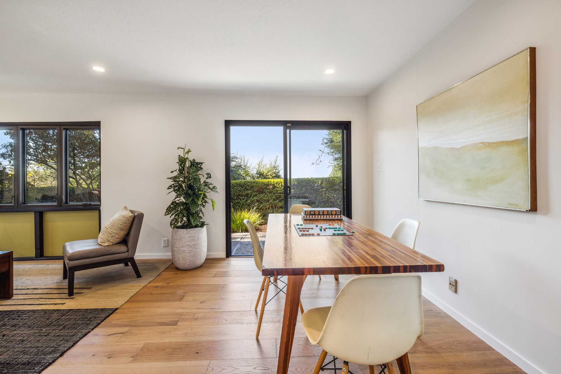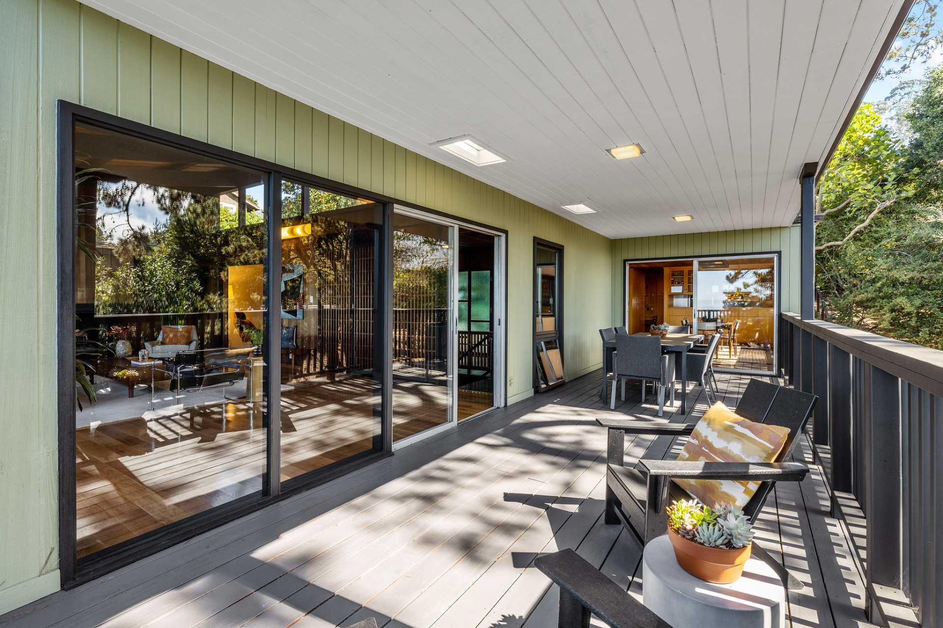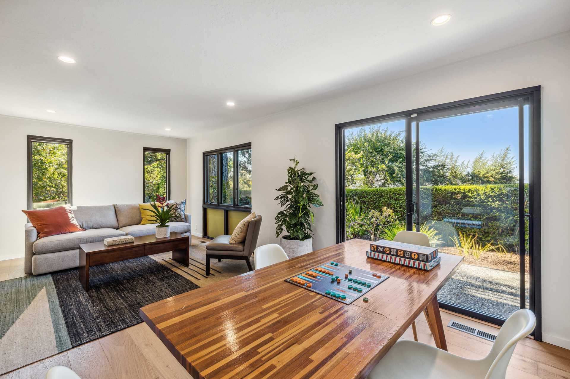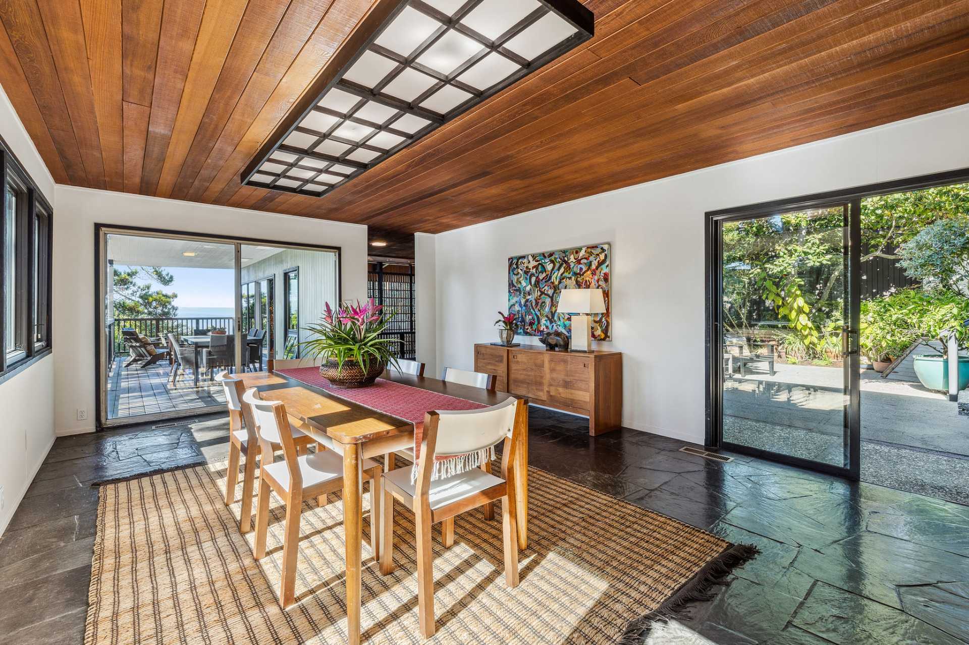- Ample dining room opens to both courtyard and deck