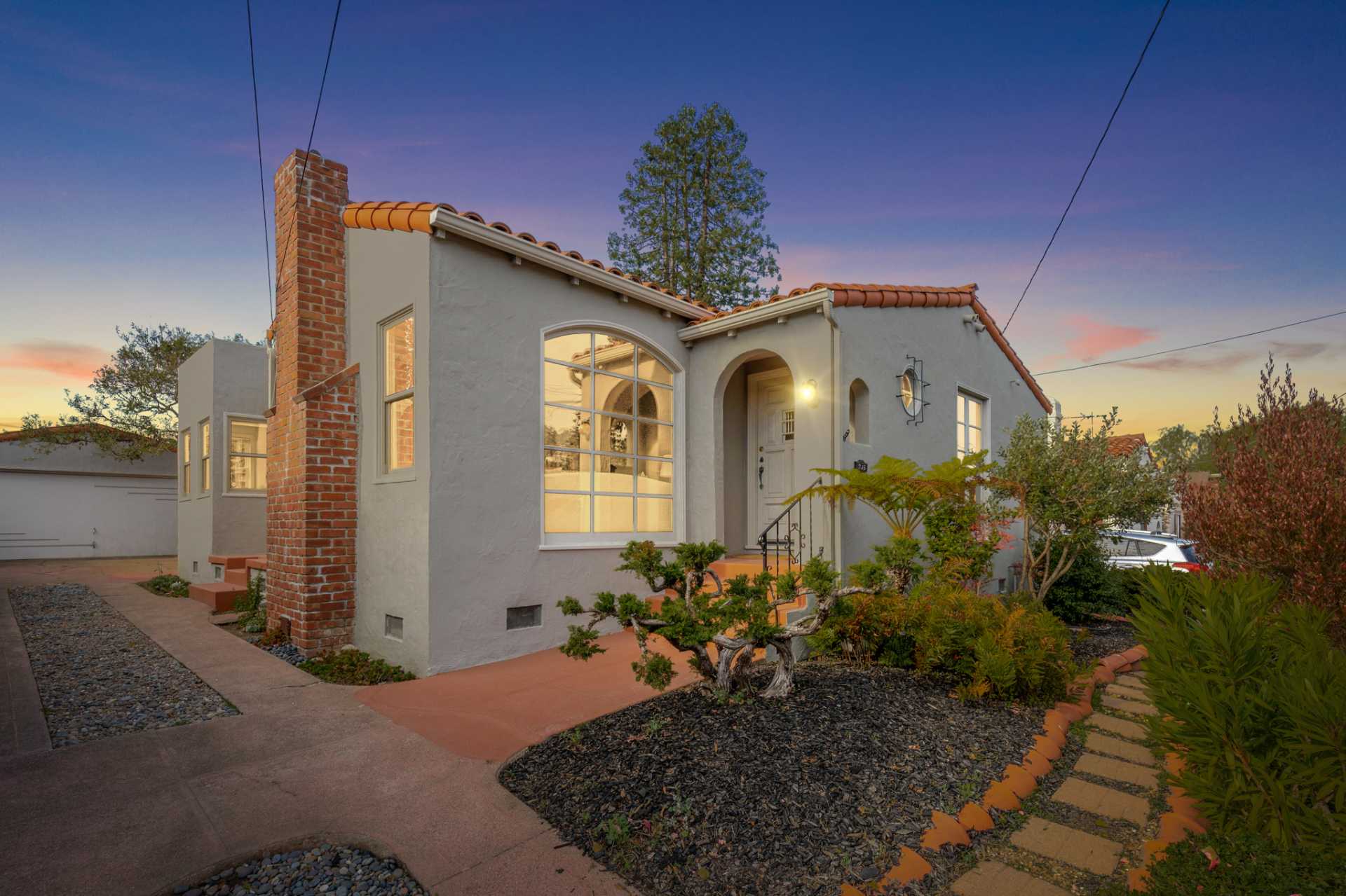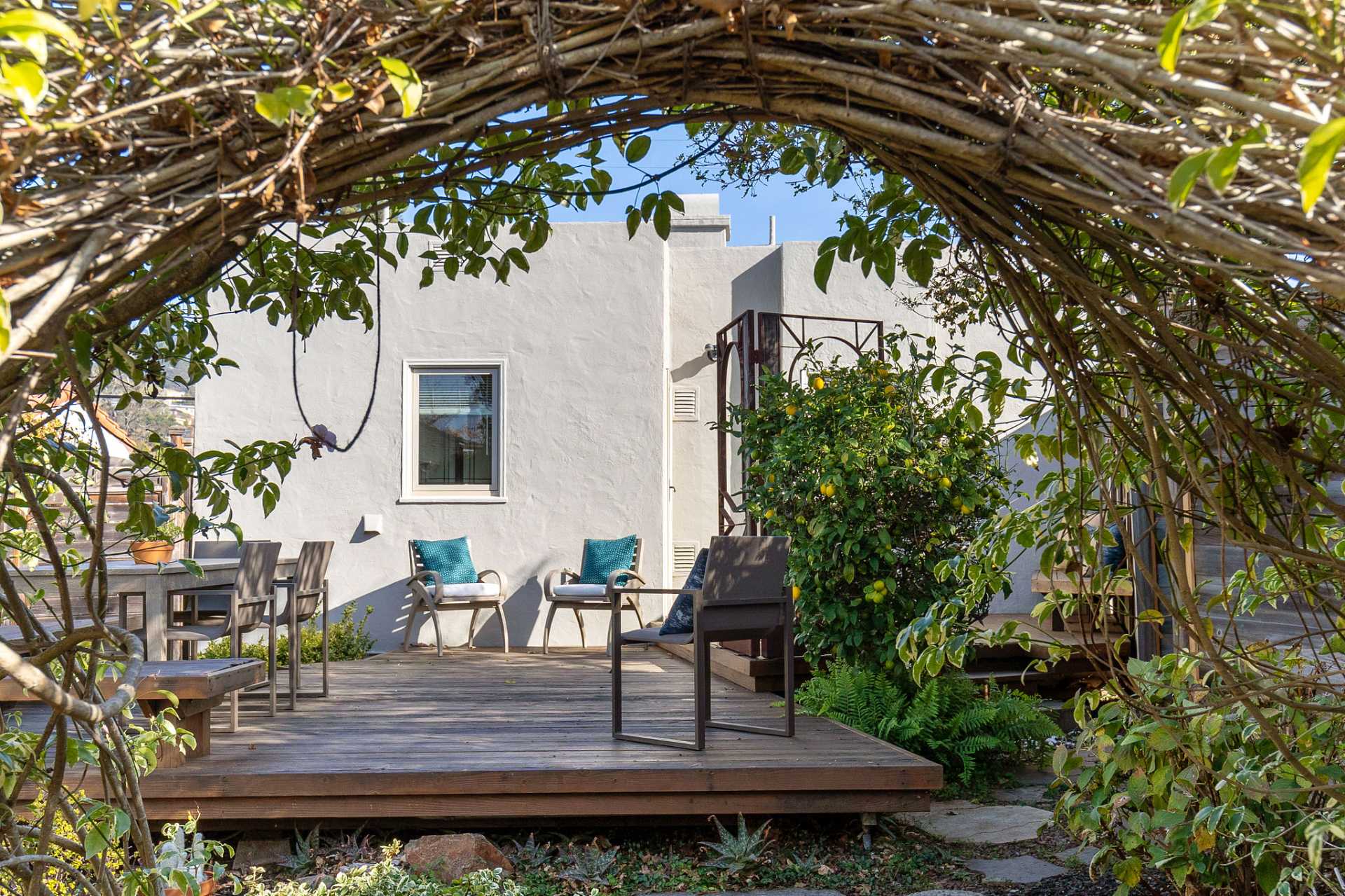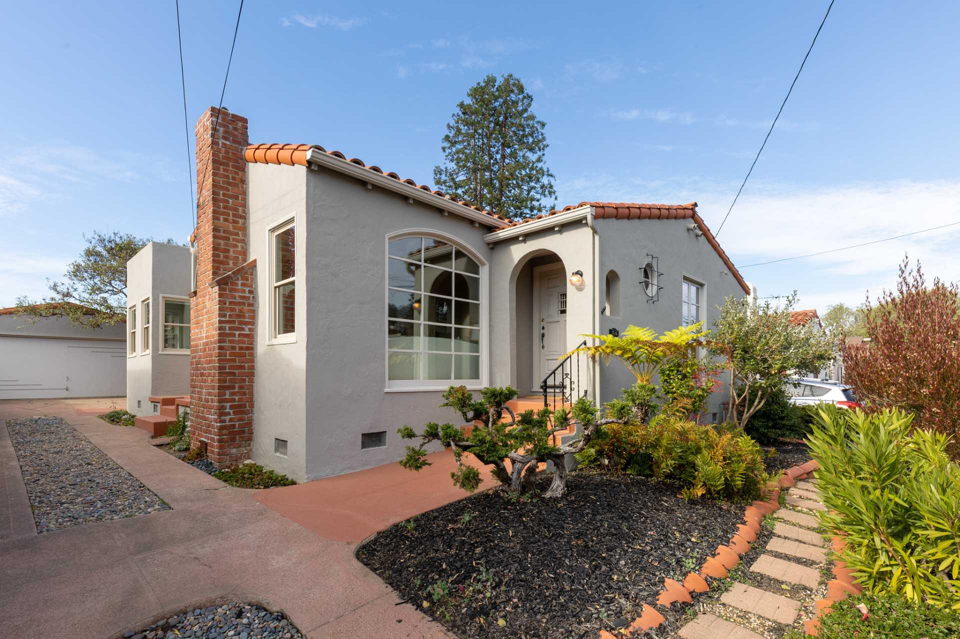 Bring back summer in this sun-splashed Mediterranean-style bungalow, with all one-level living on a highly coveted tree-lined street. Charming architectural details and vintage style meet thoughtful upgrades such as dual-pane Marvin windows, updated kitchen cabinetry with soft close drawers designed to look like the originals, a tiled countertop bathroom with separate tub and shower, and a glamorous vintage vanity mirror. Oversized custom picture windows in the living room and front bedroom preserve the 30s charm without compromising modern standards. Unique features such as the barrel ceiling, arched doorways, bullseye window in the front entry, sweet vintage light fixtures, and gorgeous hardwood floors all combine to create a welcoming and embracing atmosphere. From the kitchen head out onto the expansive deck with built-in benches for al-fresco dining and outdoor privacy.